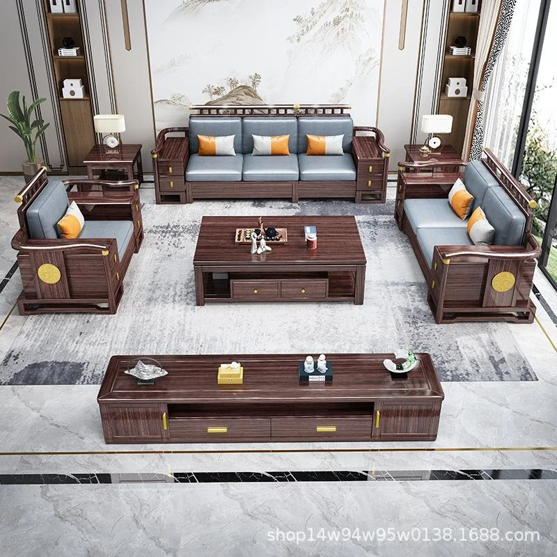 新中式ウッキン材全実木製ソファセット - ヴィラや広々としたリビングに最適!冬夏兼用の高収納ソファで、あなたの空間を美しく演出します。快適さと機能性を兼ね備えた一品をぜひお試しください!