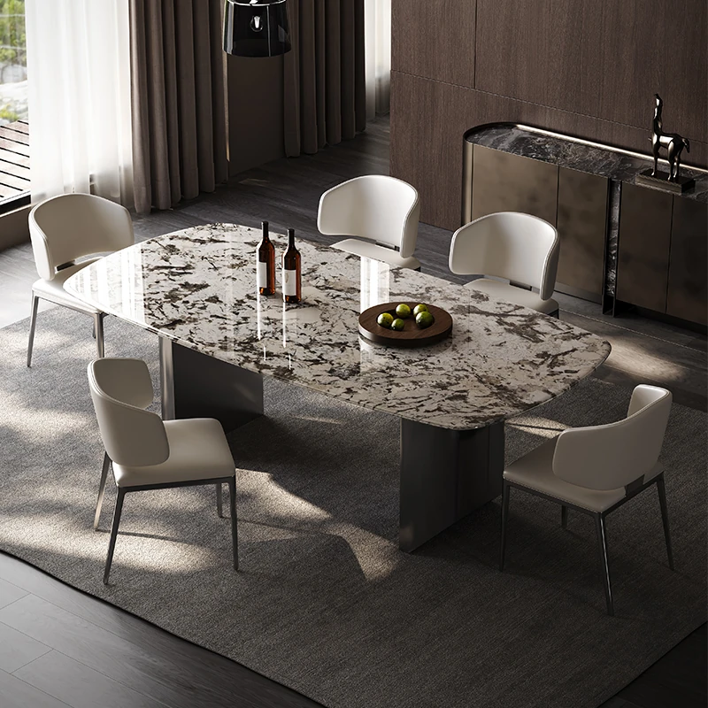 Venetian Brown Natural Marble Dining Table and Chair Set - Luxury Modern Minimalist High-End Rectangular Table for Home Use