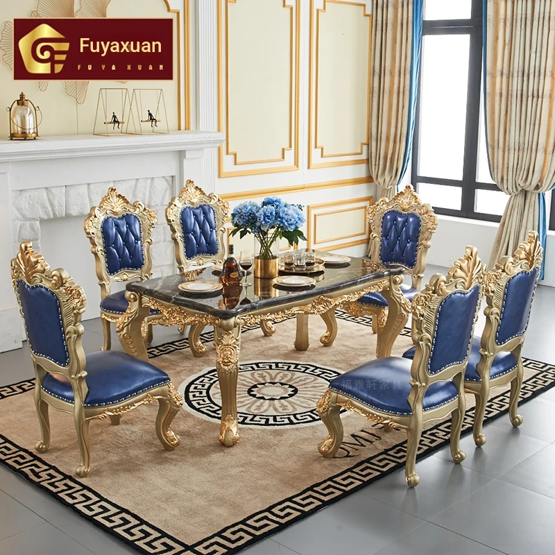 Elegant European Style Dining Table and Chair Set - 1.8m Solid Wood Carved Marble Dining Table in Luxurious Champagne Gold for Spacious Dining Rooms