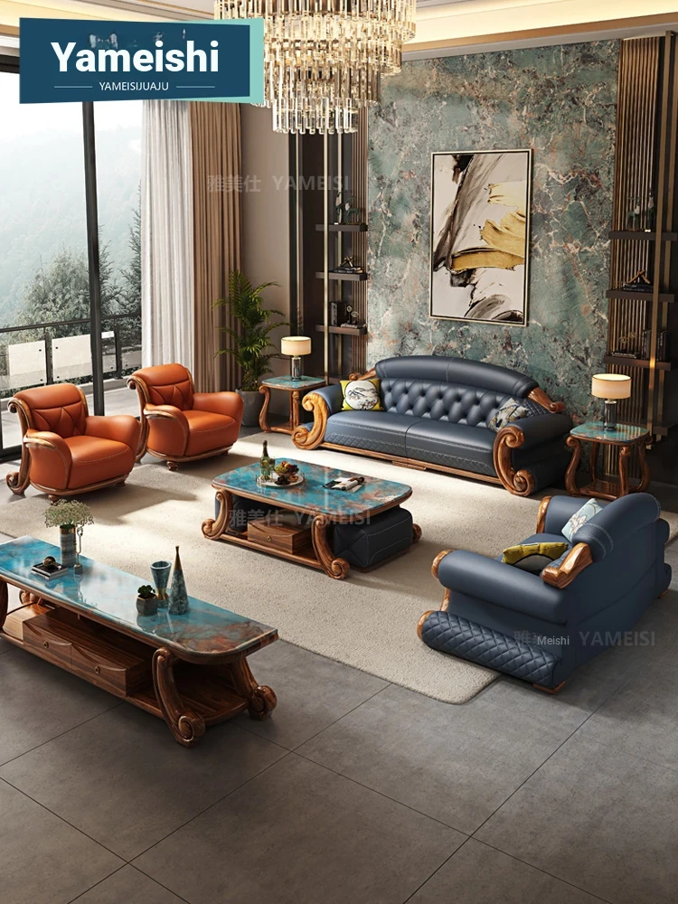 Luxurious American Genuine Leather Sofa Set - Elegant Solid Wood French Style for Living Rooms of All Sizes - High-End 123 Combination for Ultimate Comfort and Style