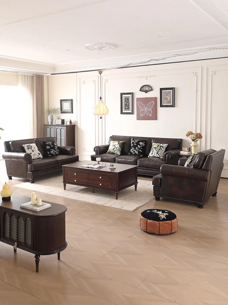 European Style Genuine Leather Sofa Set - 123 Combination, American Solid Wood Vintage Design with Top-Grain Cowhide, Perfect for Small or Large Living Rooms, Ideal for Villas and Elegant Home Decor.