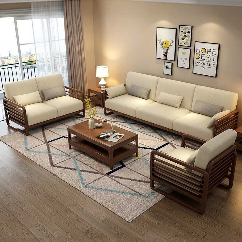 "Modern Chinese Solid Wood Sofa Set - Space-Saving 3-Seater for Small Living Rooms, Simple and Affordable Design in Natural Wood Finish"