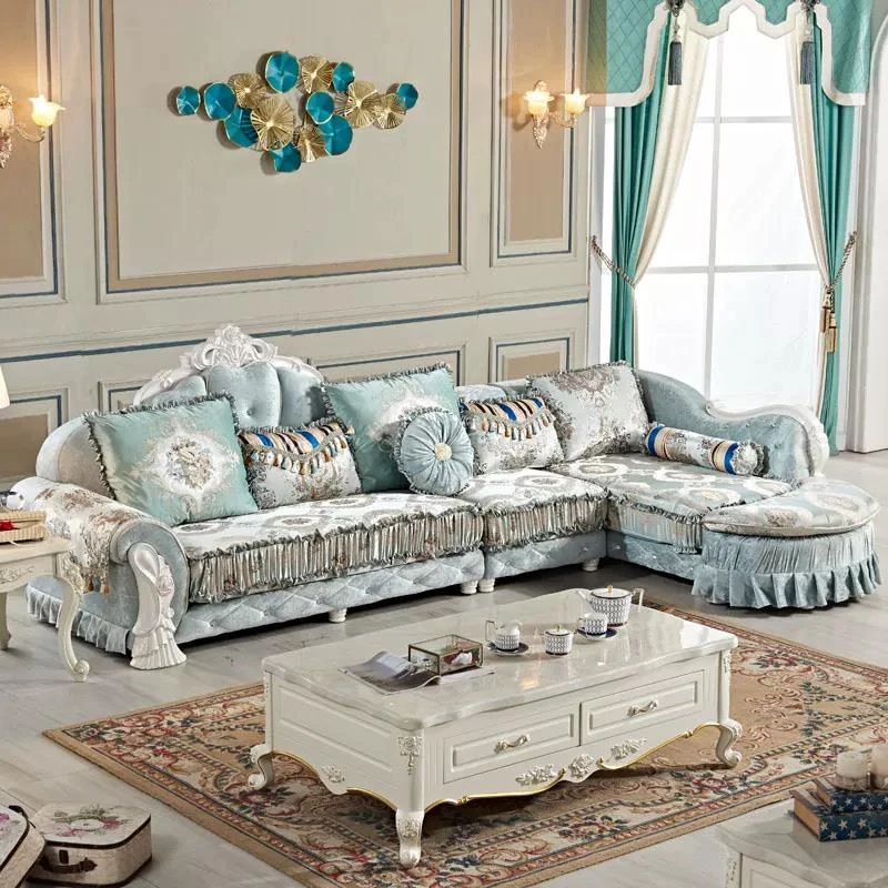 Luxurious European-style L-shaped Fabric Sofa Set with Chaise Lounge - Exquisite Carved Solid Wood Design for Spacious and Cozy Living Rooms in Elegant Neo-Classical Style