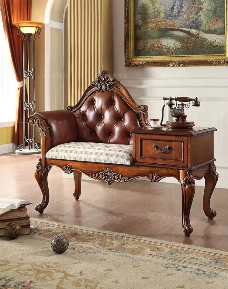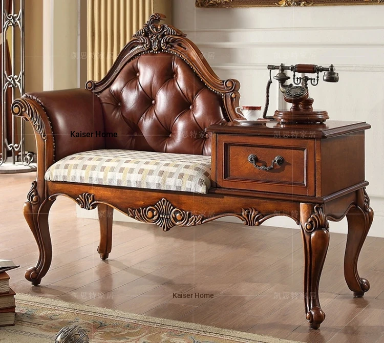 American Solid Wood Carved Chaise Lounge - Elegant European-Style Phone Chair - Rustic Solid Wood Telephone Chair for Cozy Living Spaces