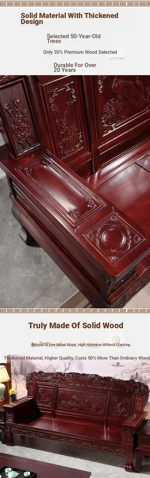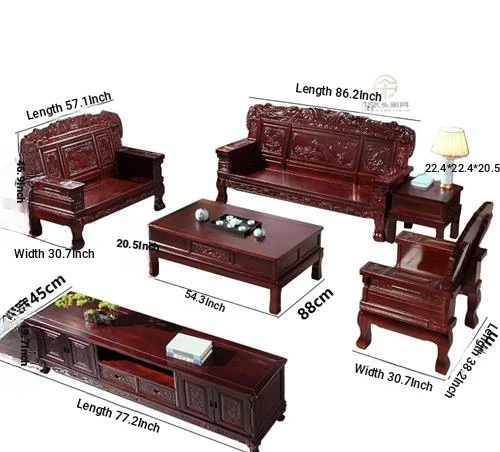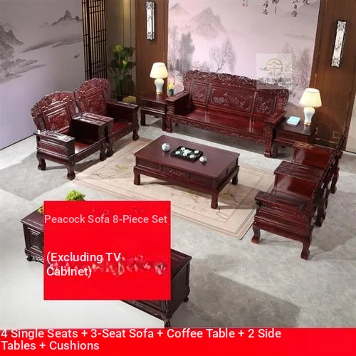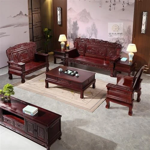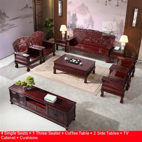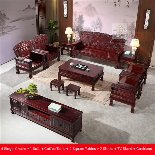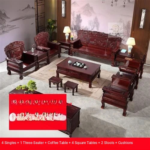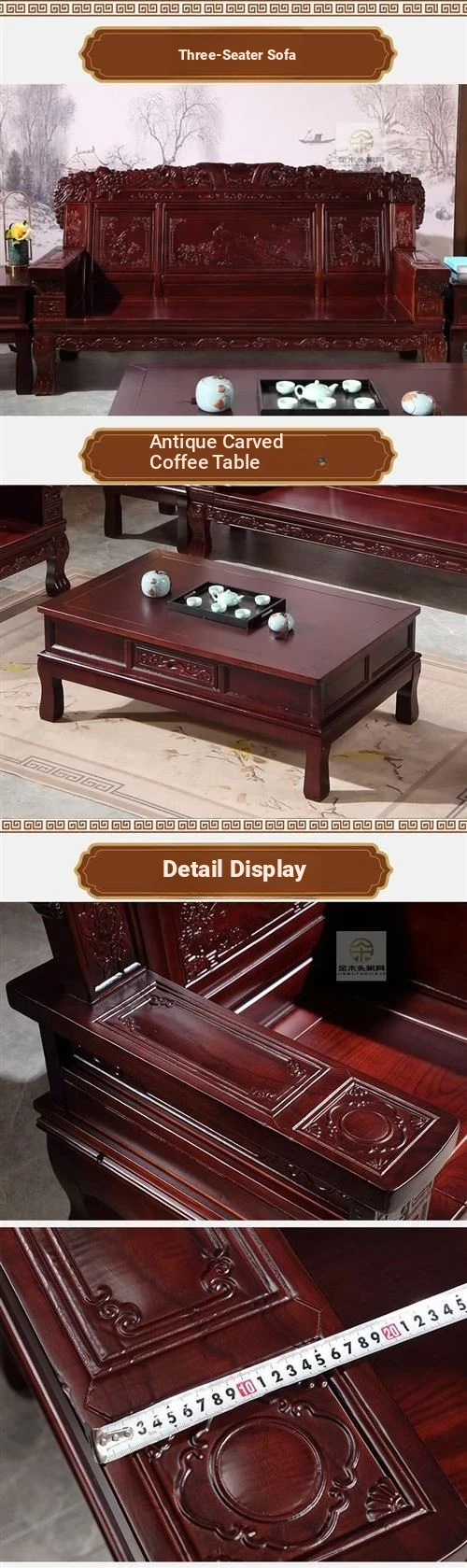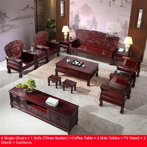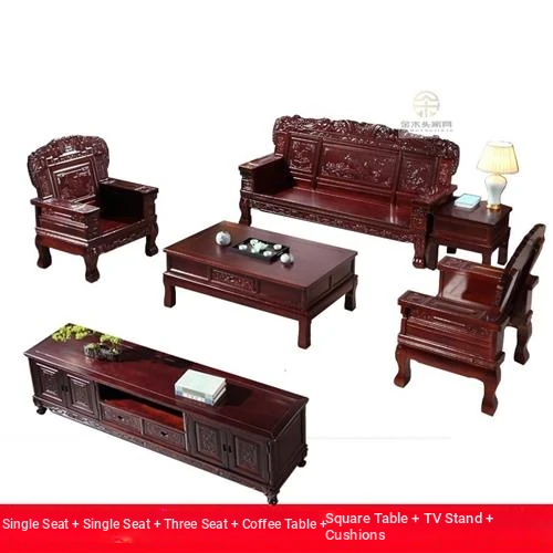 Complete Solid Wood Sofa Set with Coffee Table and TV Cabinet - Vintage Rosewood Carved Design for Rural Villas and Elegant Living Rooms