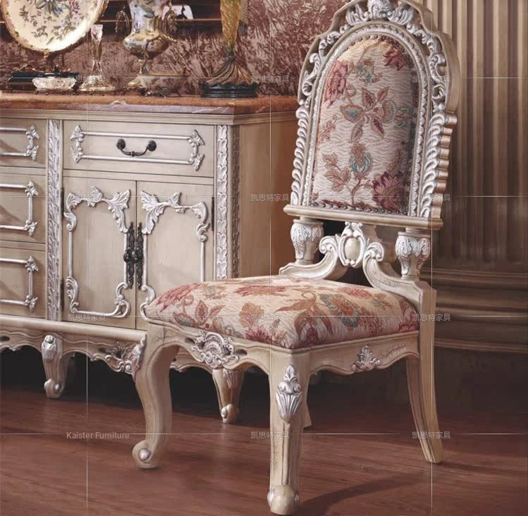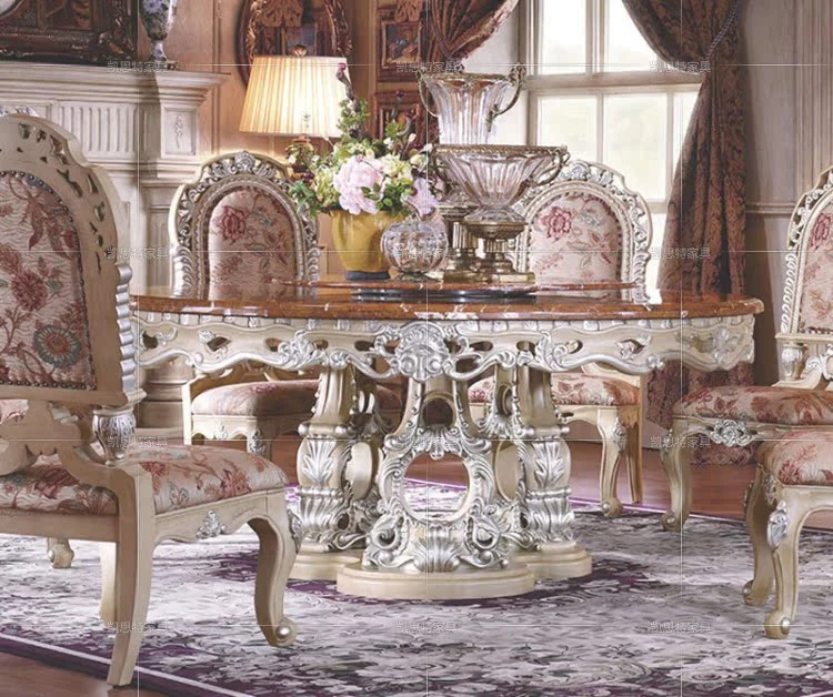 European Style Dining Table - Natural Marble Top, Solid Wood Round Design, American Rustic Charm, French Silver Leaf Accents - Perfect for Elegant Dining Experiences.