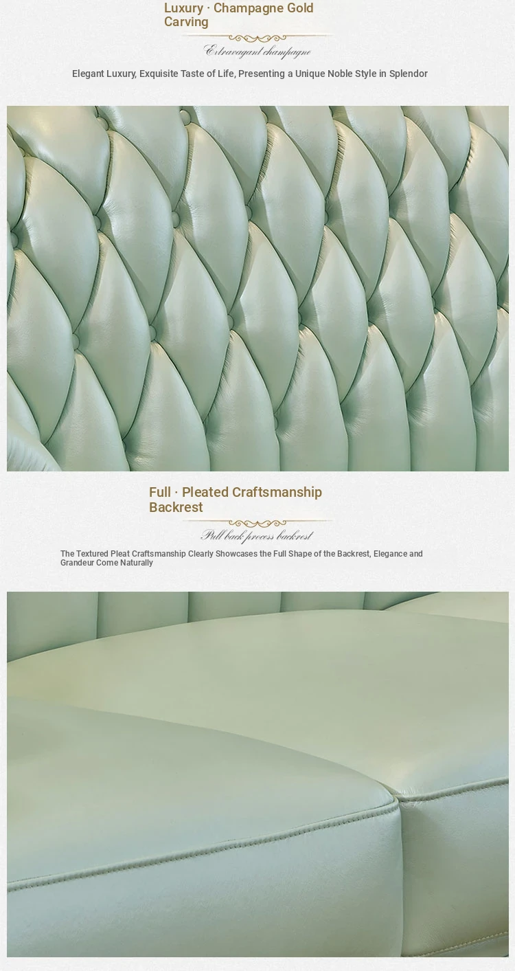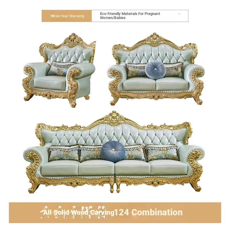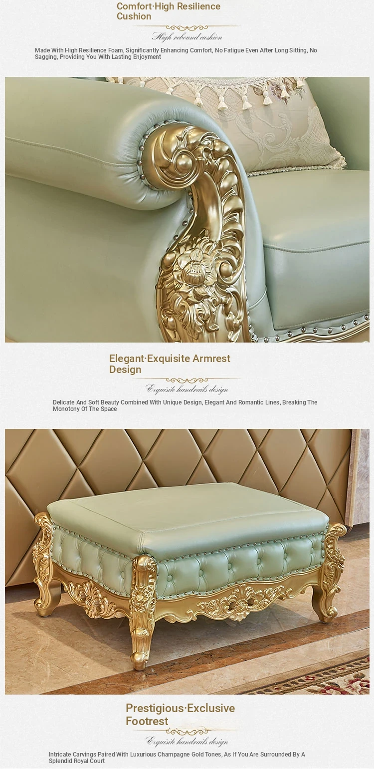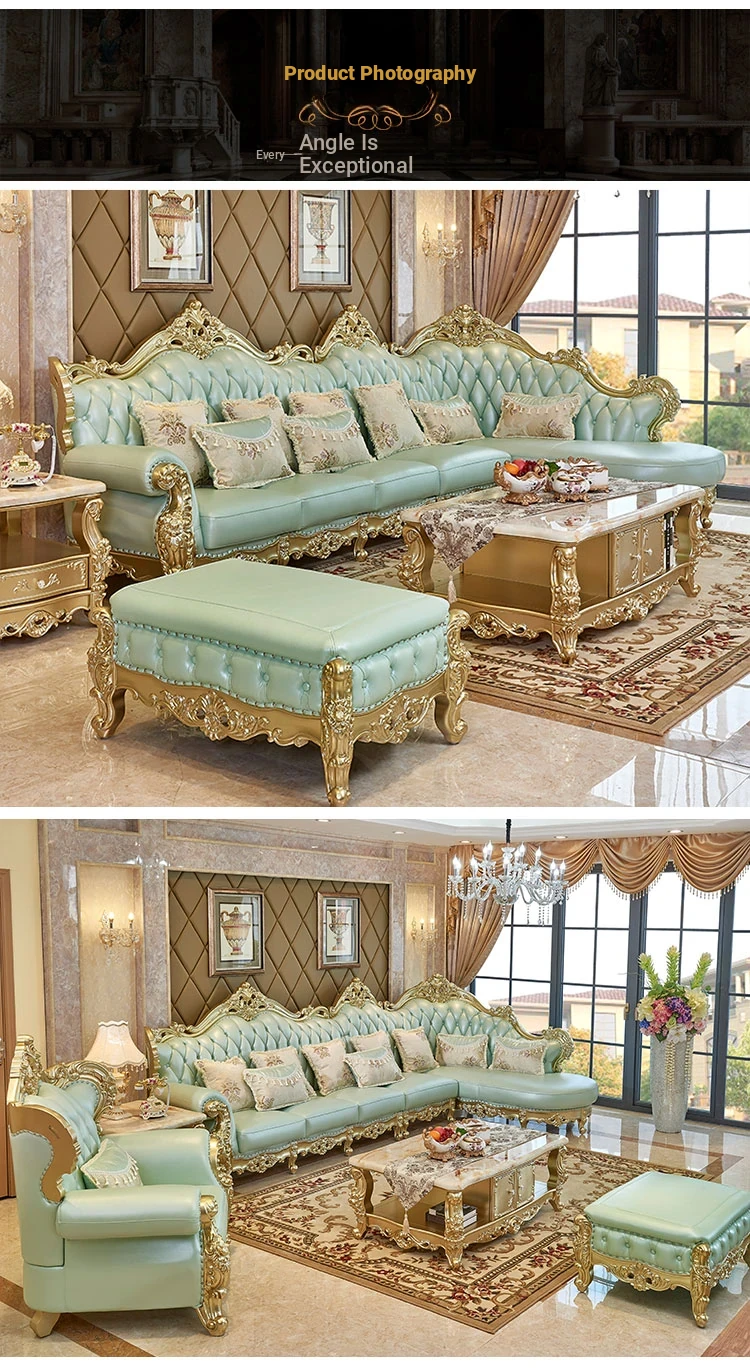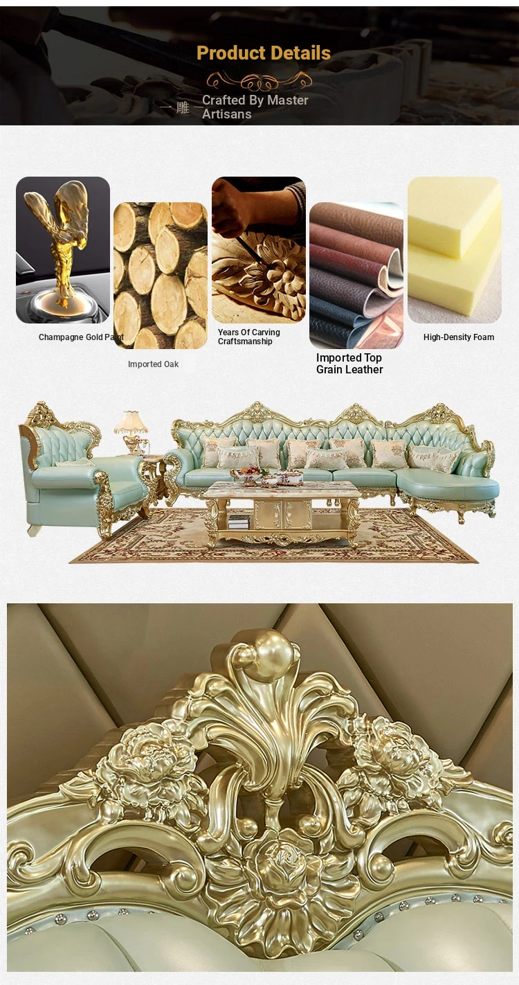 Luxurious European Style Genuine Leather Sofa Set for Large Living Room - Champagne Gold Solid Wood Carved Top Layer Cowhide Corner Sofa for Villa, Perfect for Elegant Interiors