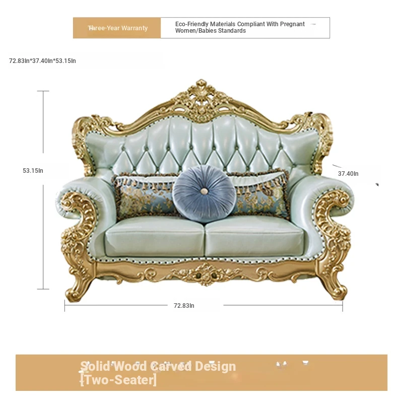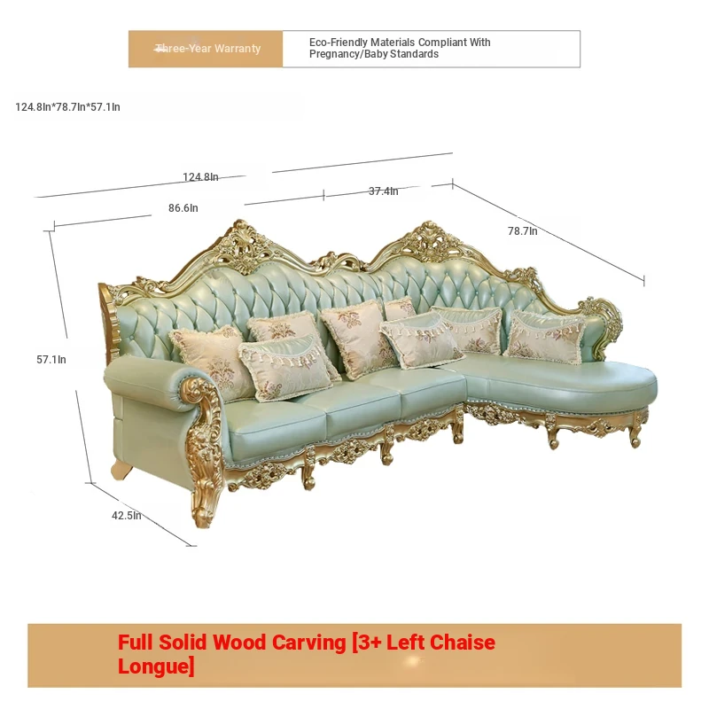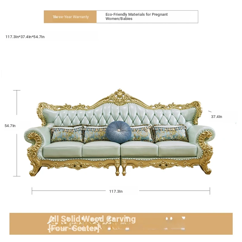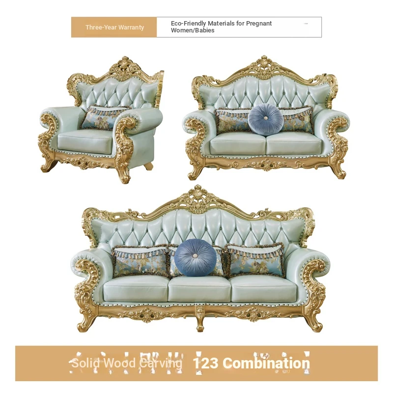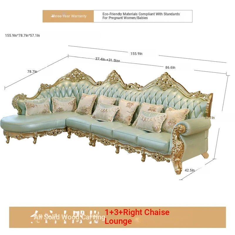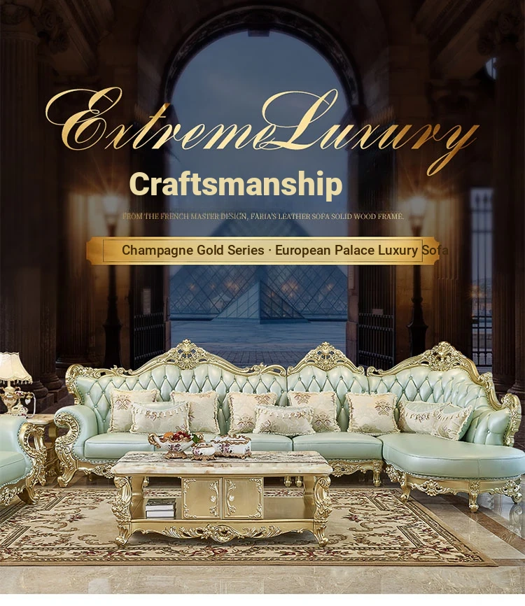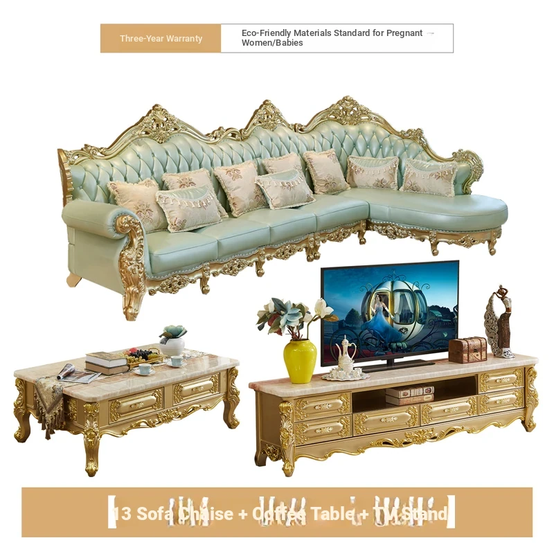 Luxurious European Style Genuine Leather Sofa Set for Large Living Room - Champagne Gold Solid Wood Carved Top Layer Cowhide Corner Sofa for Villa, Perfect for Elegant Interiors