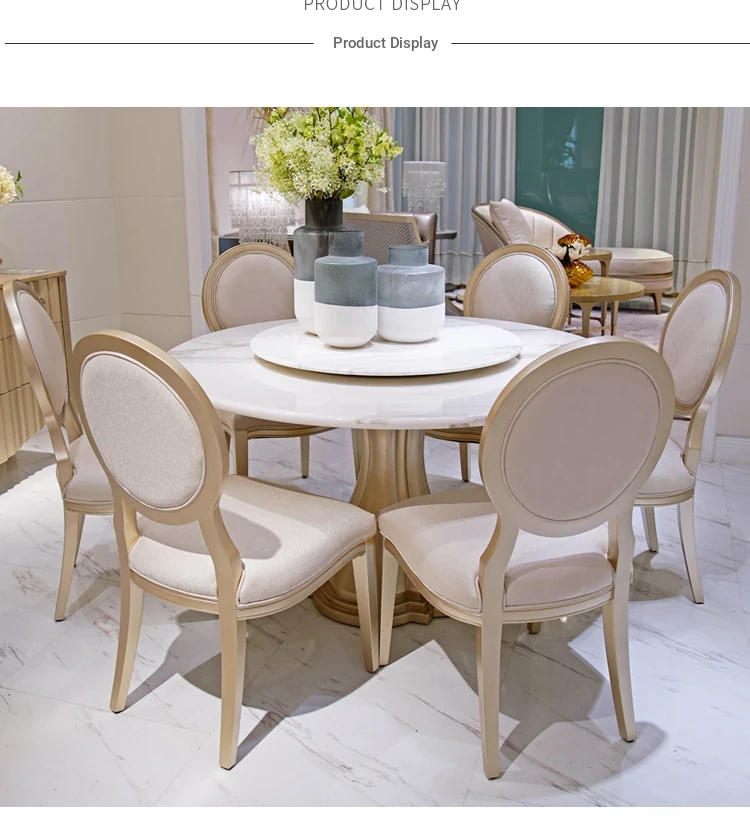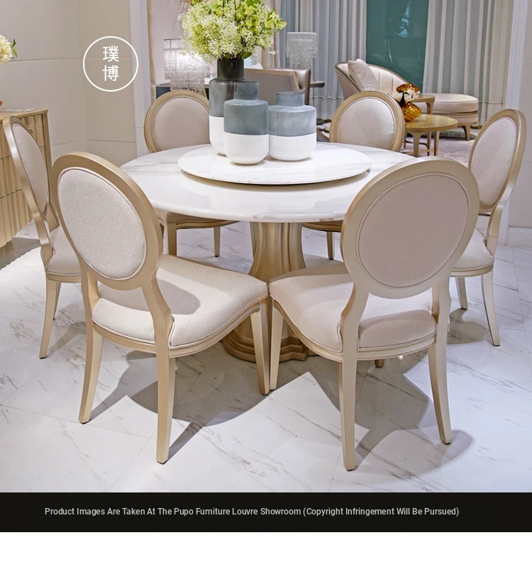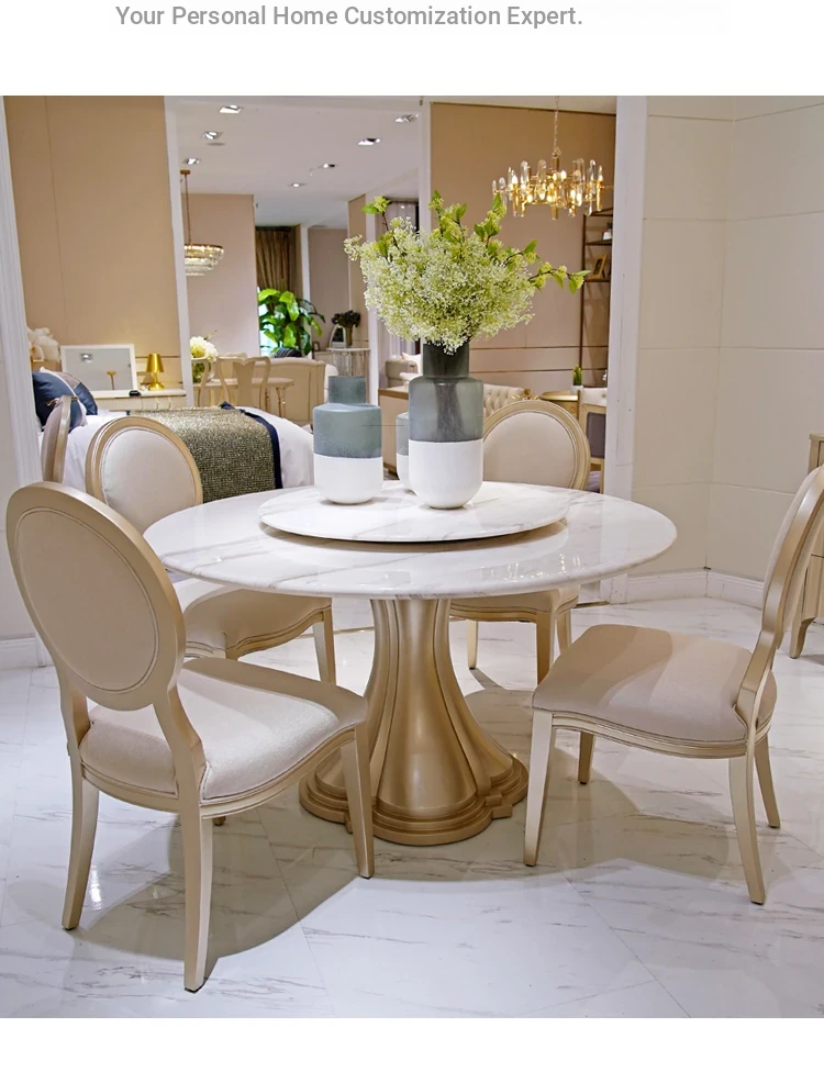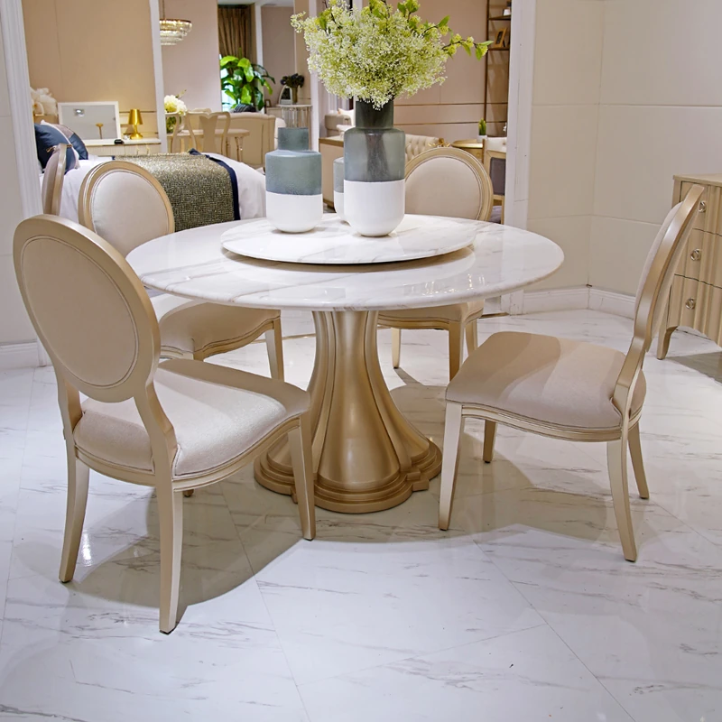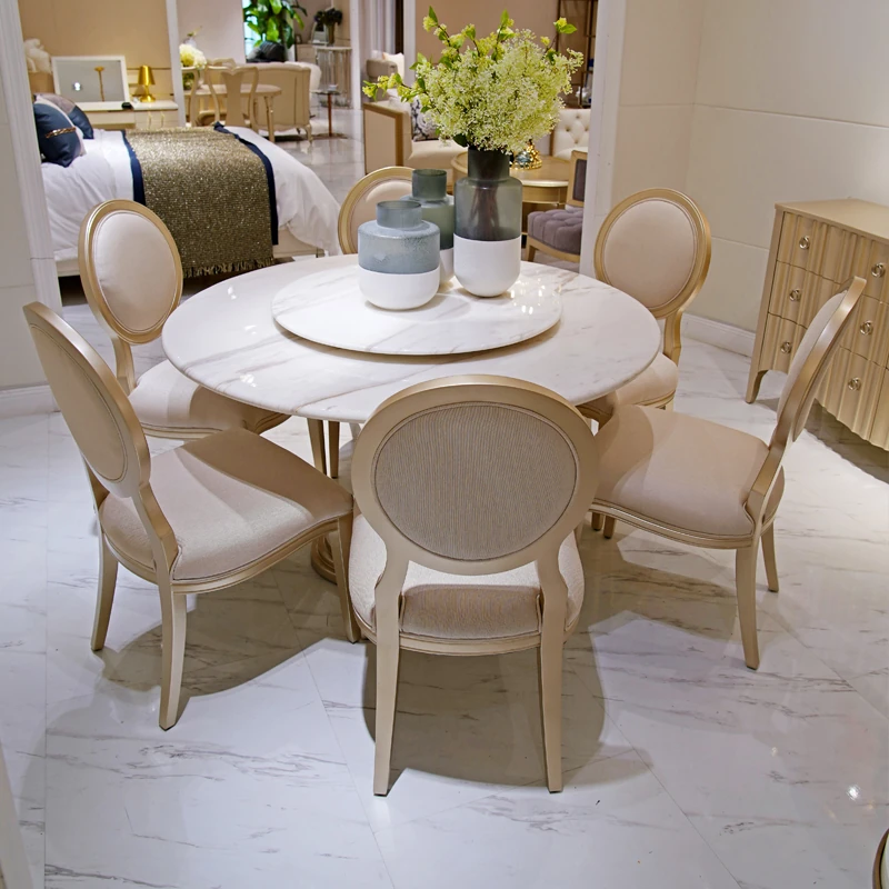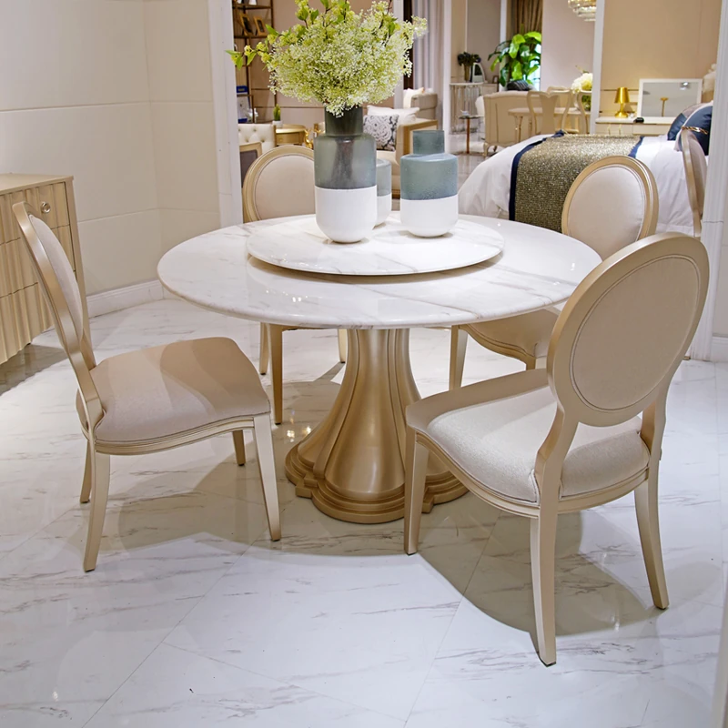 Modern American Luxury Round Natural Marble Dining Table with High-Quality Solid Wood Chairs - Elegant and Stylish Home Furniture Set for Upscale Dining Experience