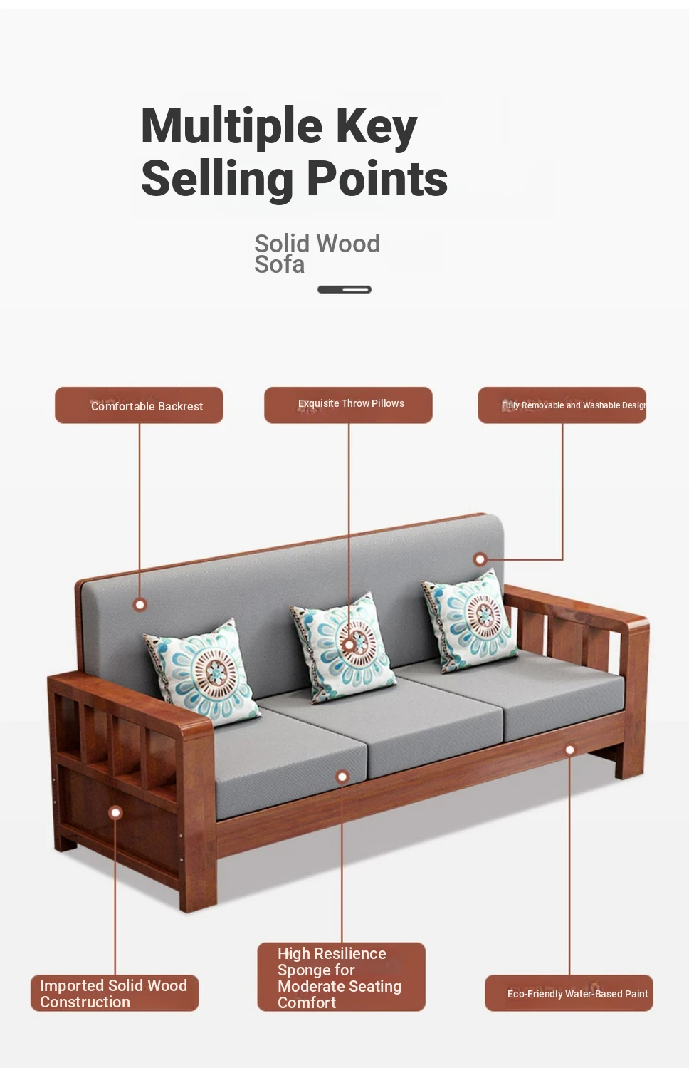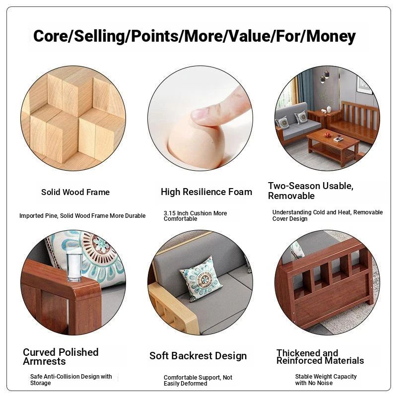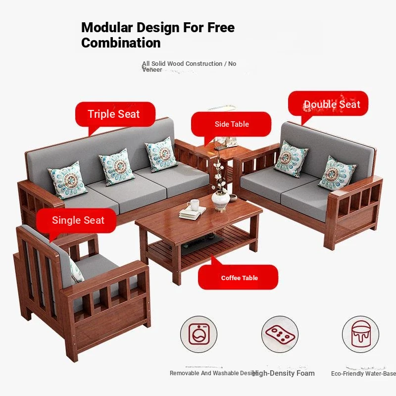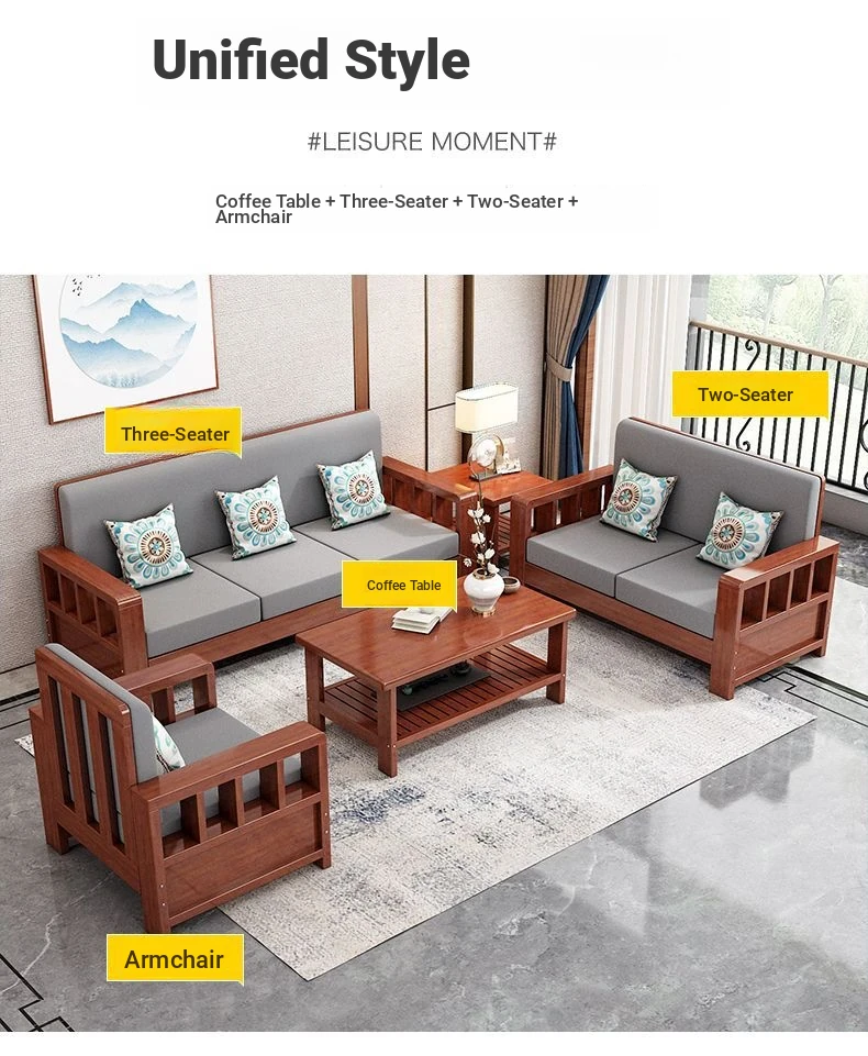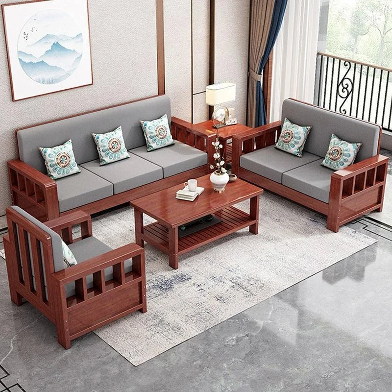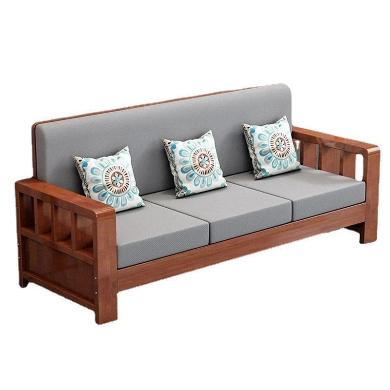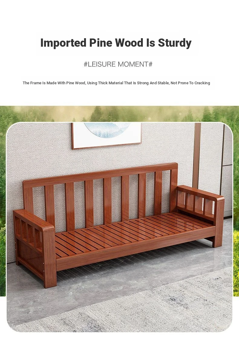 "Modern Chinese Solid Wood Sofa Set - Space-Saving 3-Seater for Small Living Rooms, Simple and Affordable Design in Natural Wood Finish"