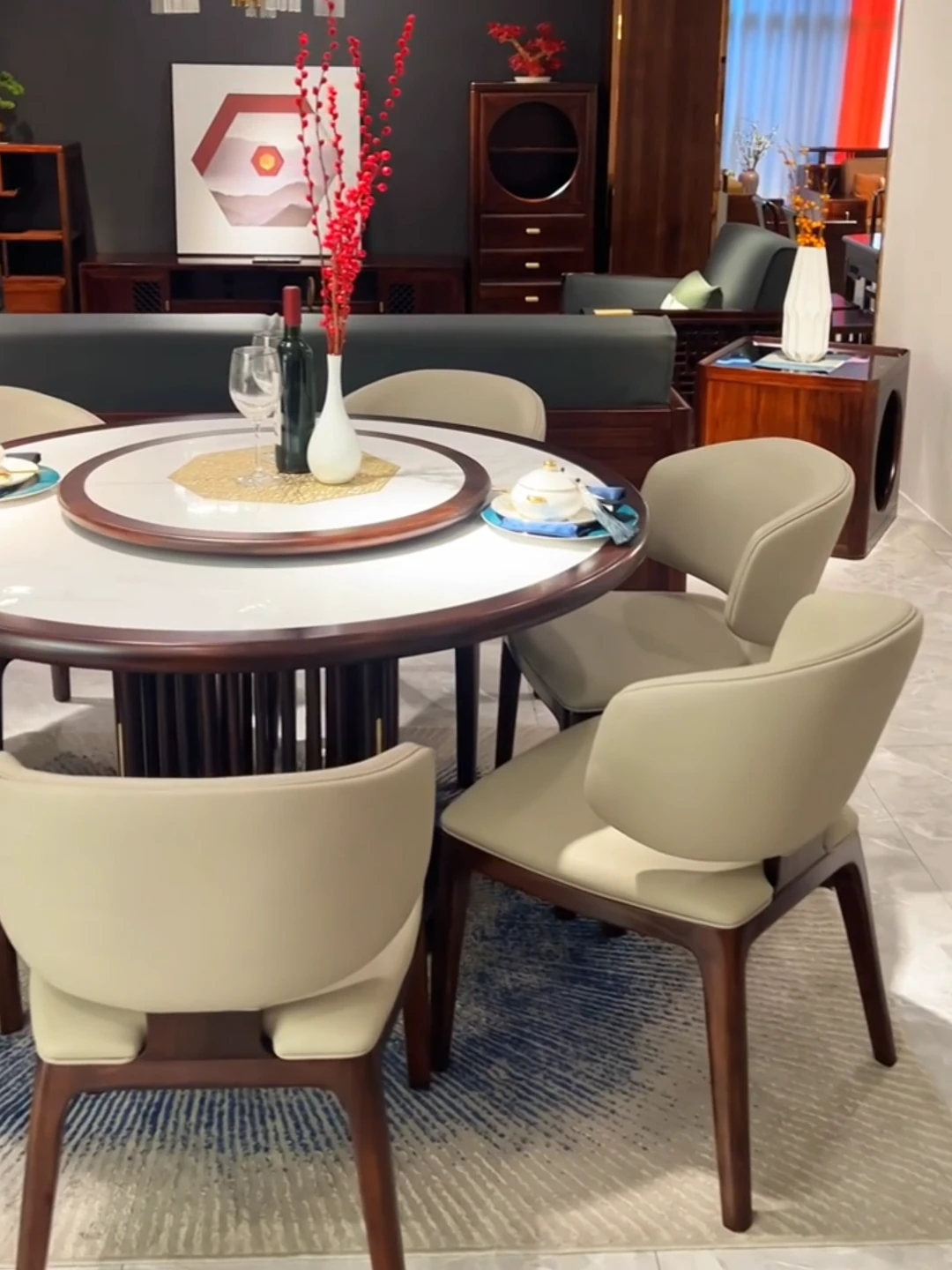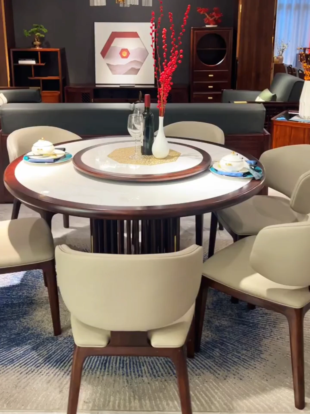 Modern Minimalist Chinese-style Solid Wood Round Dining Table with Lazy Susan - Elegant Black Gold Slate Design for Spacious Homes