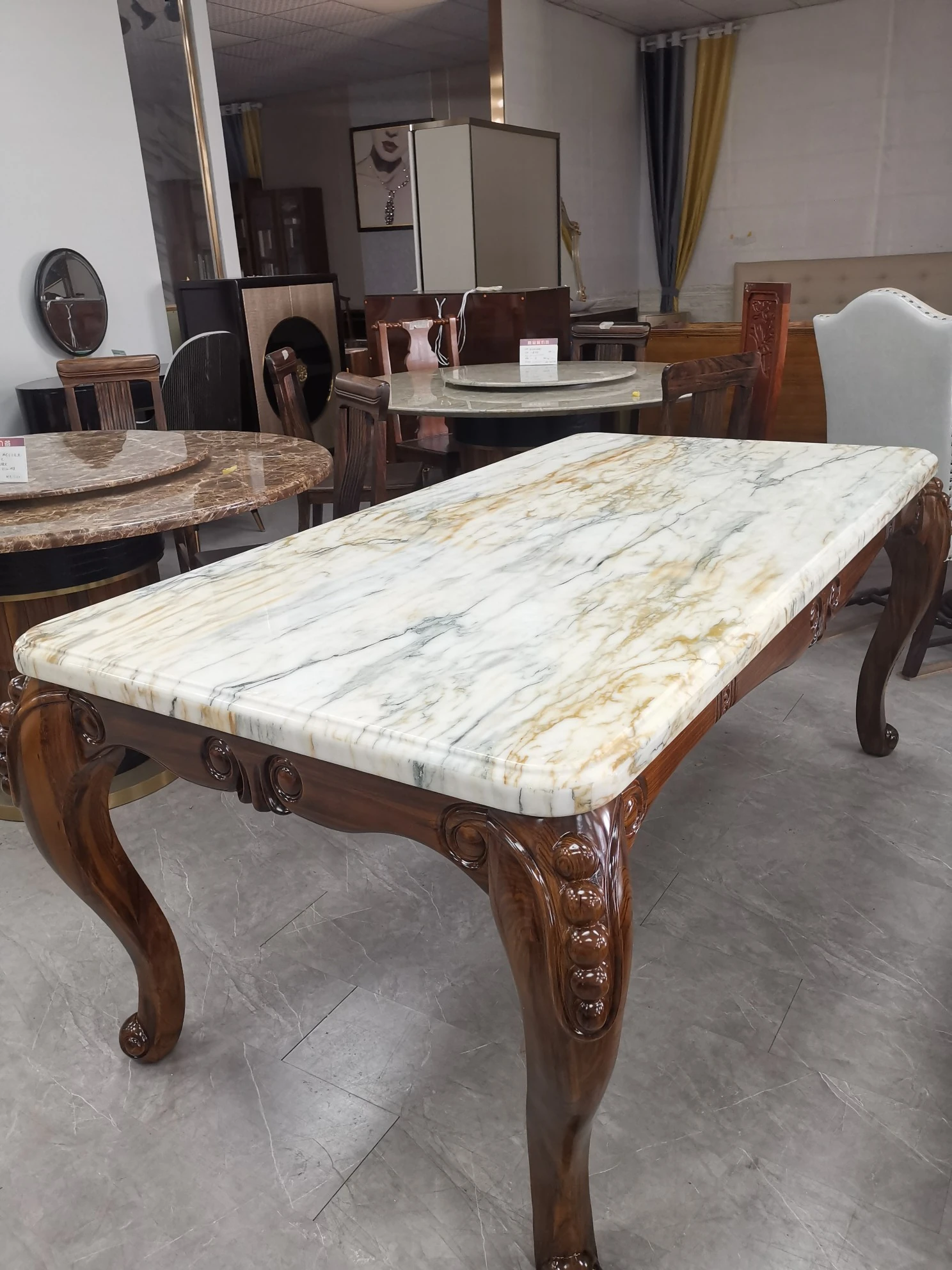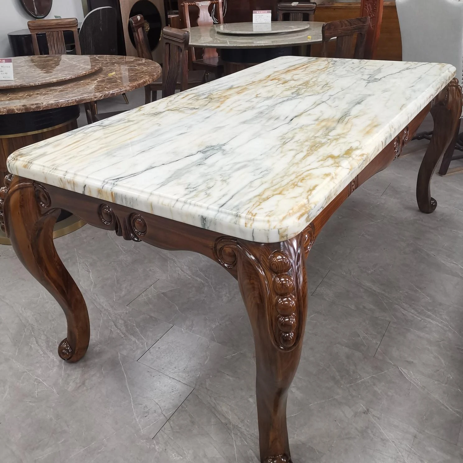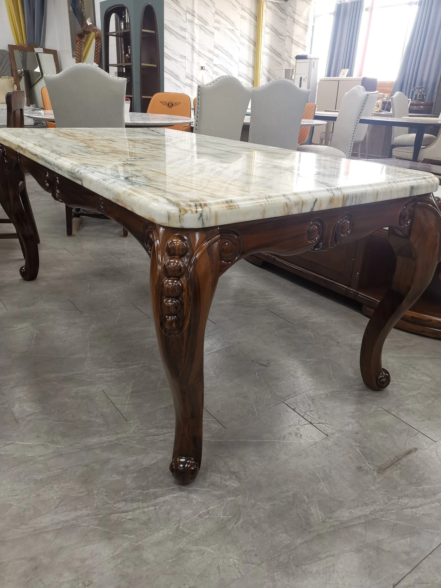 アメリカンスタイルのリビングダイニングテーブル - 長方形大理石テーブル、ステンレススチール製のエレガントな接待テーブル。ヴィラのモデルルームにもぴったりな、美しいデザインのダイニングテーブルで、家族や友人との素敵なひとときを演出します。