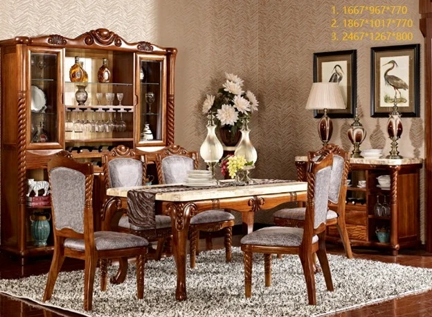 高級感溢れる欧風全木彫刻円形ダイニングテーブル - 1.3メートル大理石仕上げ、アメリカンスタイルの6人用椅子セットで、優雅な食卓を演出します。