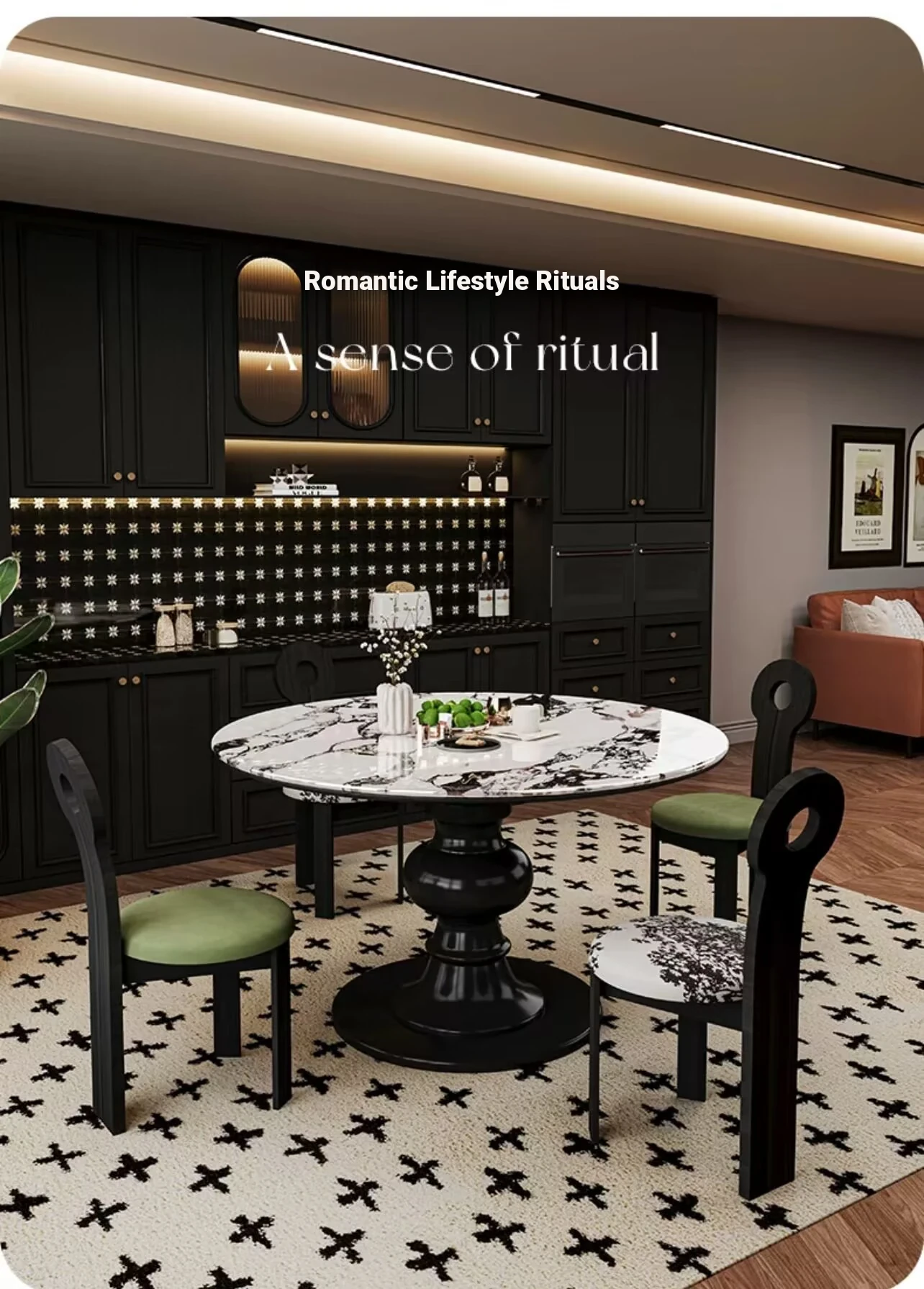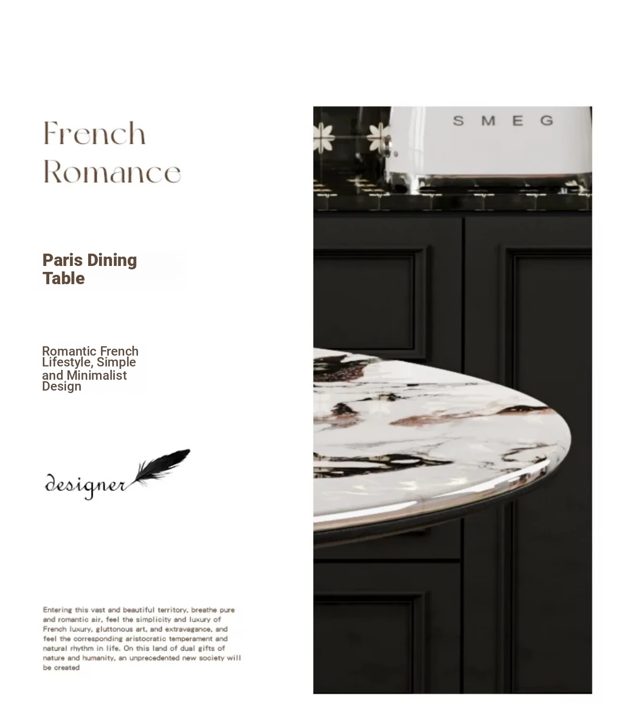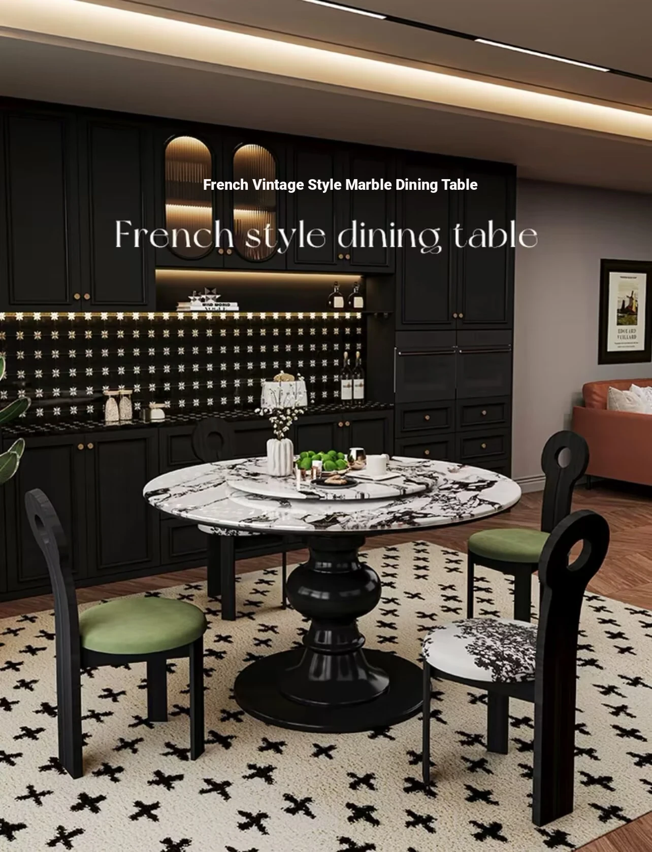 2024年新作!フランス風レトロ・ブルガリ大理石丸型ダイニングテーブル - 小スペースにも最適なクリームカラーの天然木製テーブルで、家族との素敵なひとときを演出!