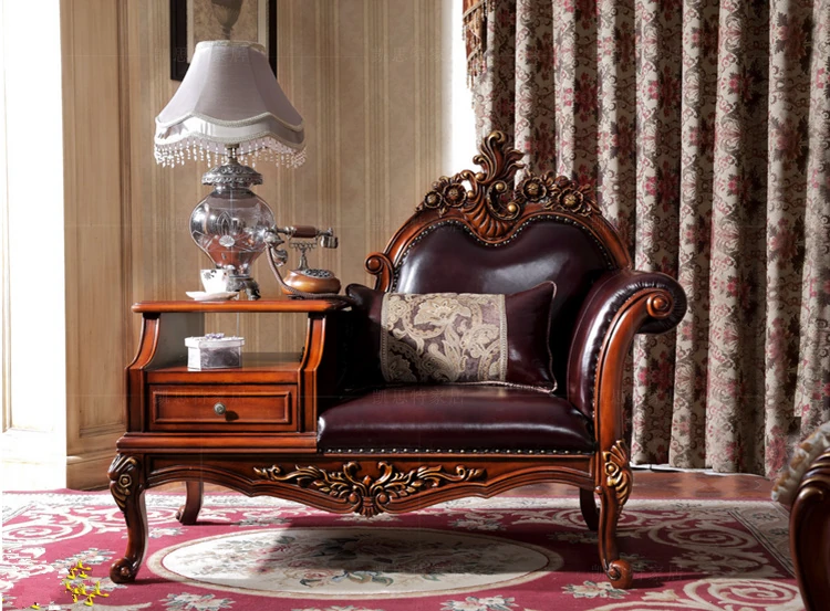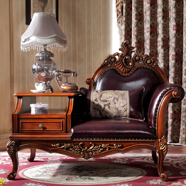 アメリカンスタイルの無垢材製ロマンティックなデイベッドソファ - クラシックな欧風デザイン、贅沢な本革使用で、居心地抜群!電話用椅子としても最適。あなたのリビングにエレガンスをプラス!