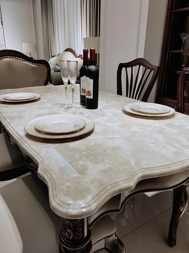 アメリカンスタイルのリビングダイニングテーブル - 長方形大理石テーブル、ステンレススチール製のエレガントな接待テーブル。ヴィラのモデルルームにもぴったりな、美しいデザインのダイニングテーブルで、家族や友人との素敵なひとときを演出します。