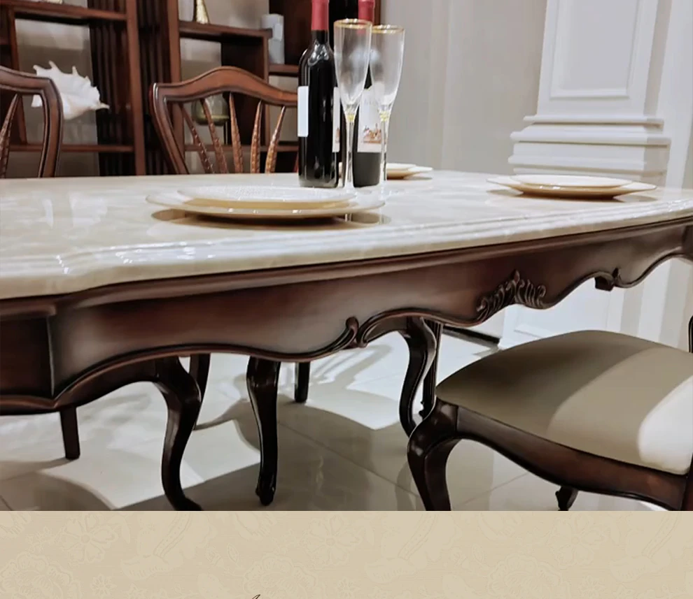 高級感溢れる欧風ダイニングテーブルセット!1.5mの天然大理石と木彫りの美しいデザイン、シャンパンゴールドの華やかな仕上げで、特別な食卓を演出します。家族や友人との素敵なひとときをお楽しみください。