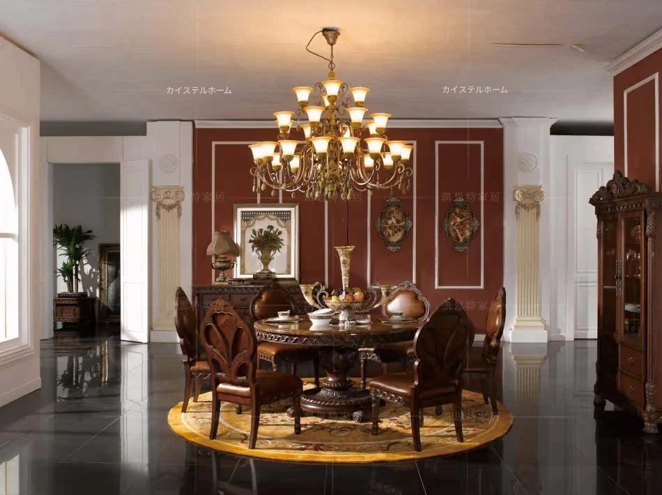 アメリカンスタイルの無垢材ダイニングテーブルと本革チェアセット 欧風ラウンドテーブル 高級大理石ダイニングテーブル 本革チェア付きで、洗練された食事空間を演出します!