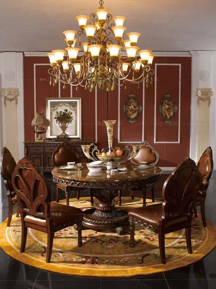高級感溢れる欧風全木彫刻円形ダイニングテーブル - 1.3メートル大理石仕上げ、アメリカンスタイルの6人用椅子セットで、優雅な食卓を演出します。