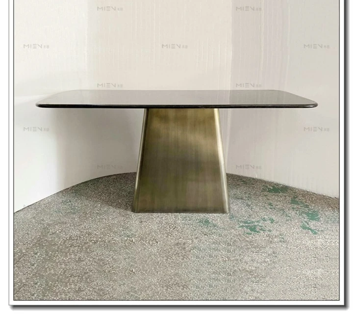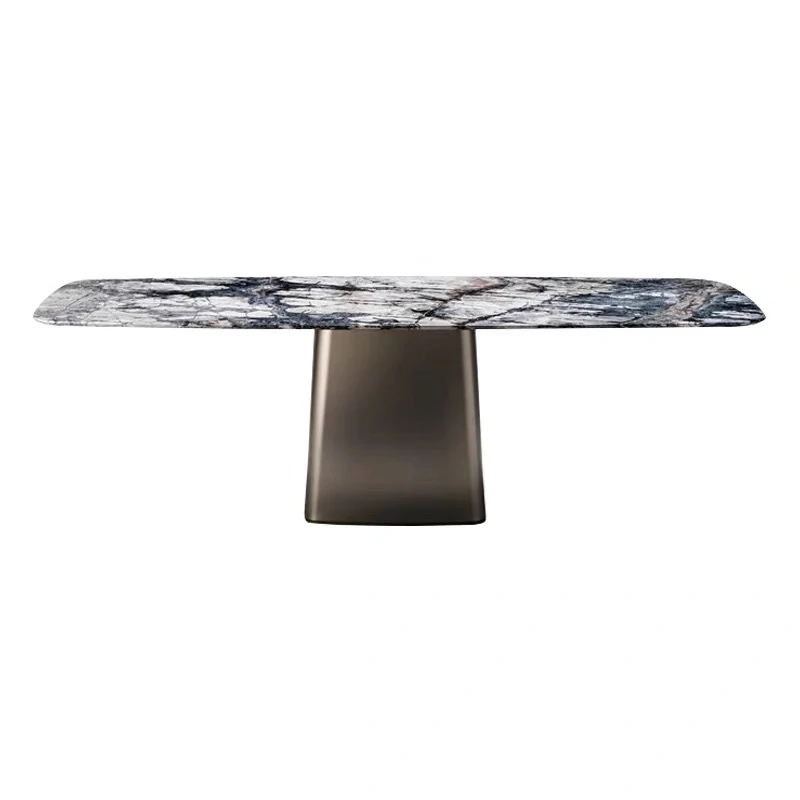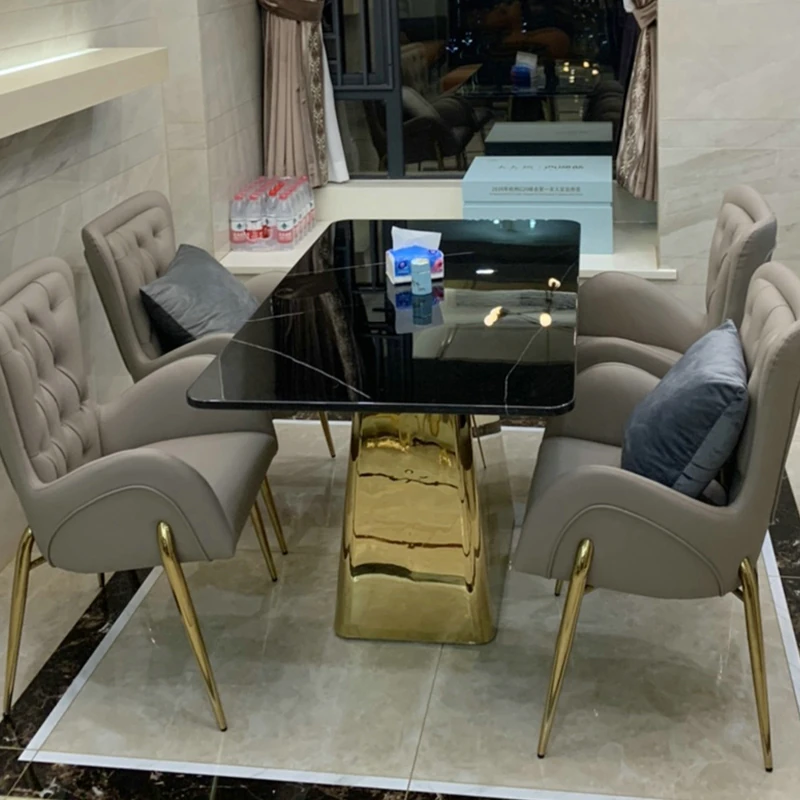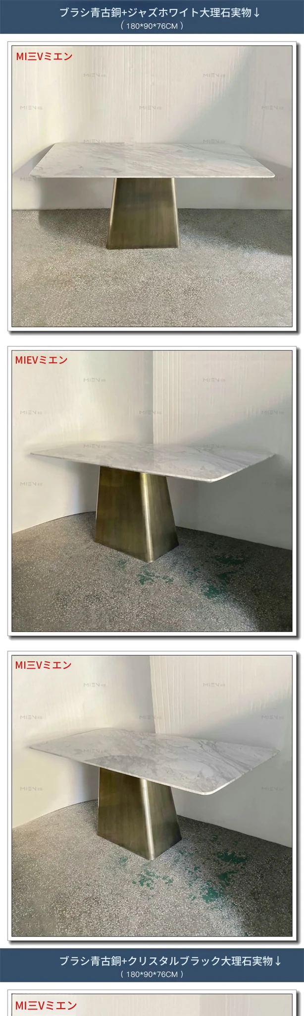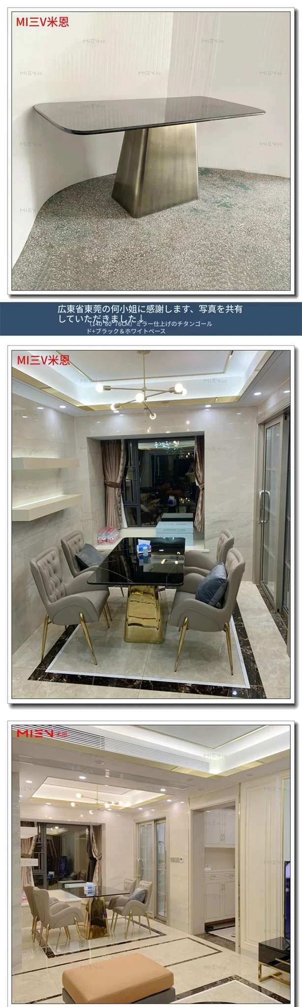 アメリカンスタイルのリビングダイニングテーブル - 長方形大理石テーブル、ステンレススチール製のエレガントな接待テーブル。ヴィラのモデルルームにもぴったりな、美しいデザインのダイニングテーブルで、家族や友人との素敵なひとときを演出します。