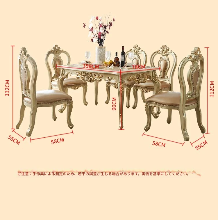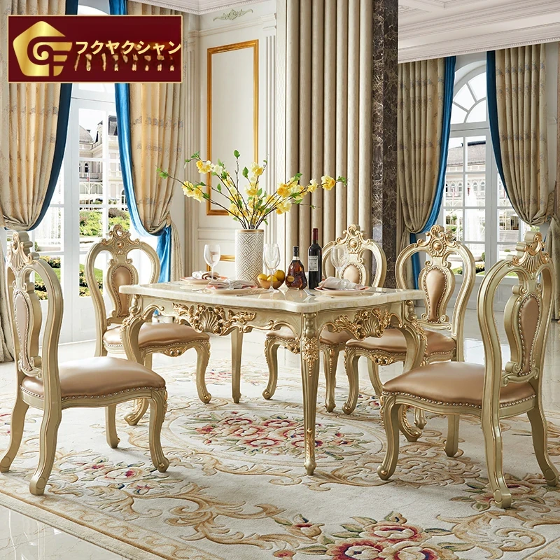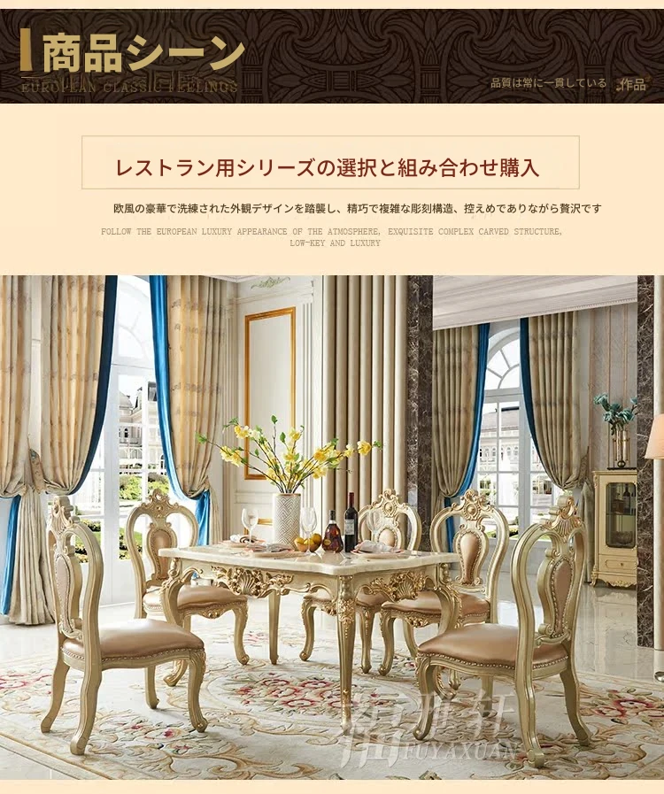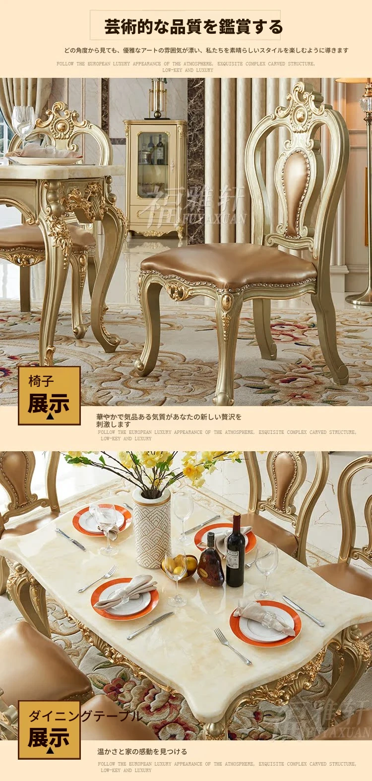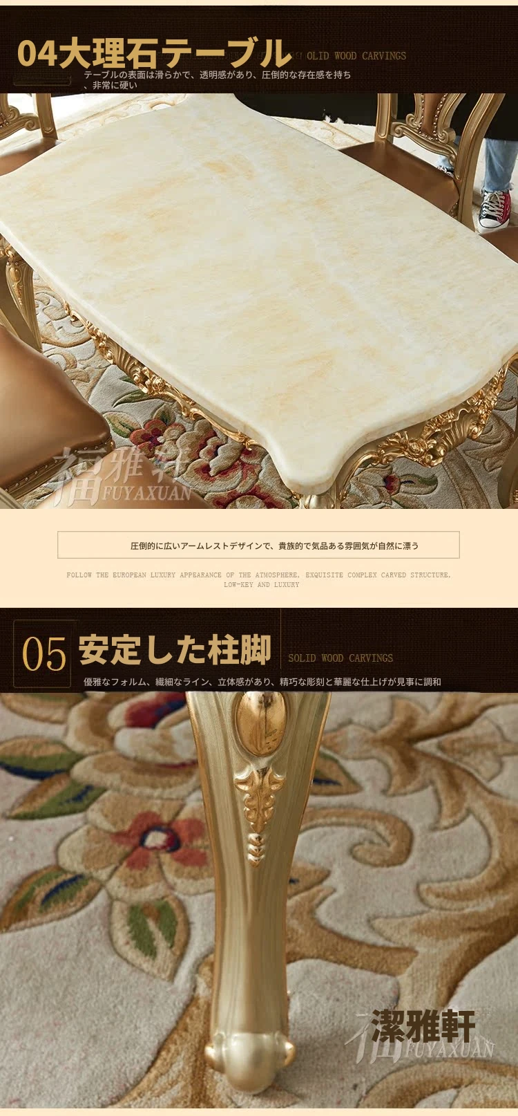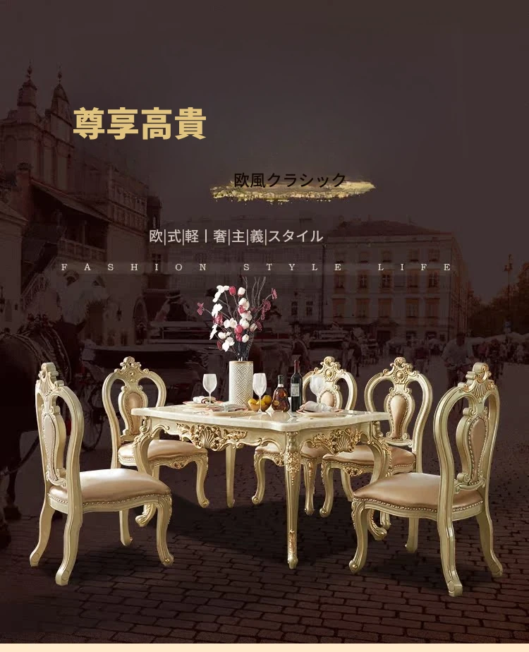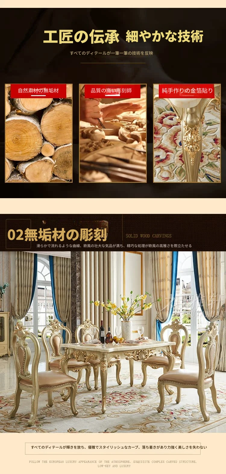 高級感溢れる欧風ダイニングテーブルセット!1.5mの天然大理石と木彫りの美しいデザイン、シャンパンゴールドの華やかな仕上げで、特別な食卓を演出します。家族や友人との素敵なひとときをお楽しみください。