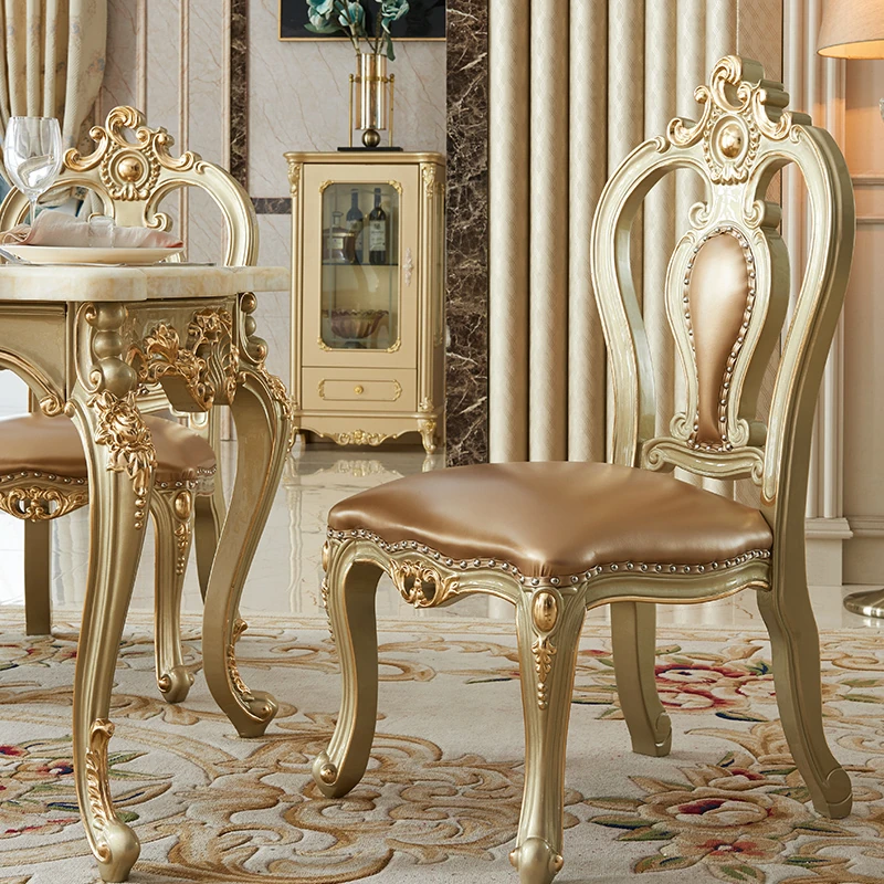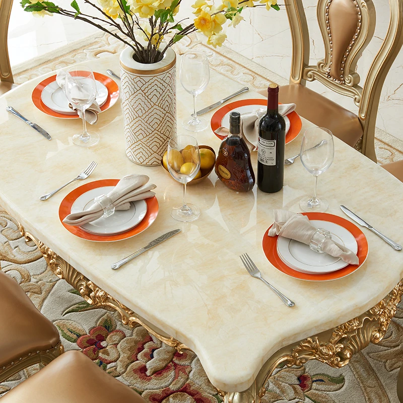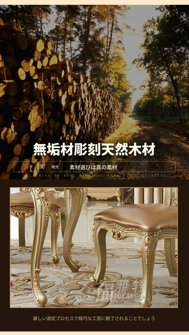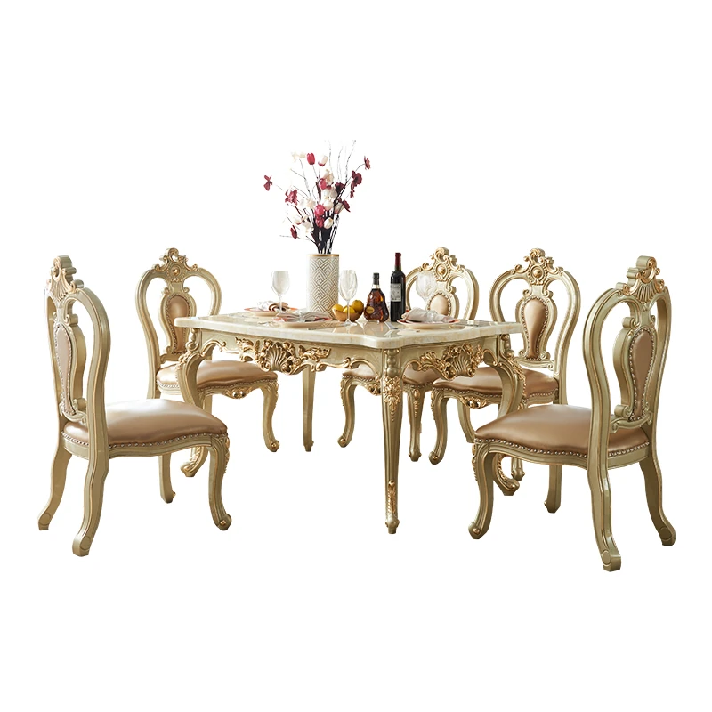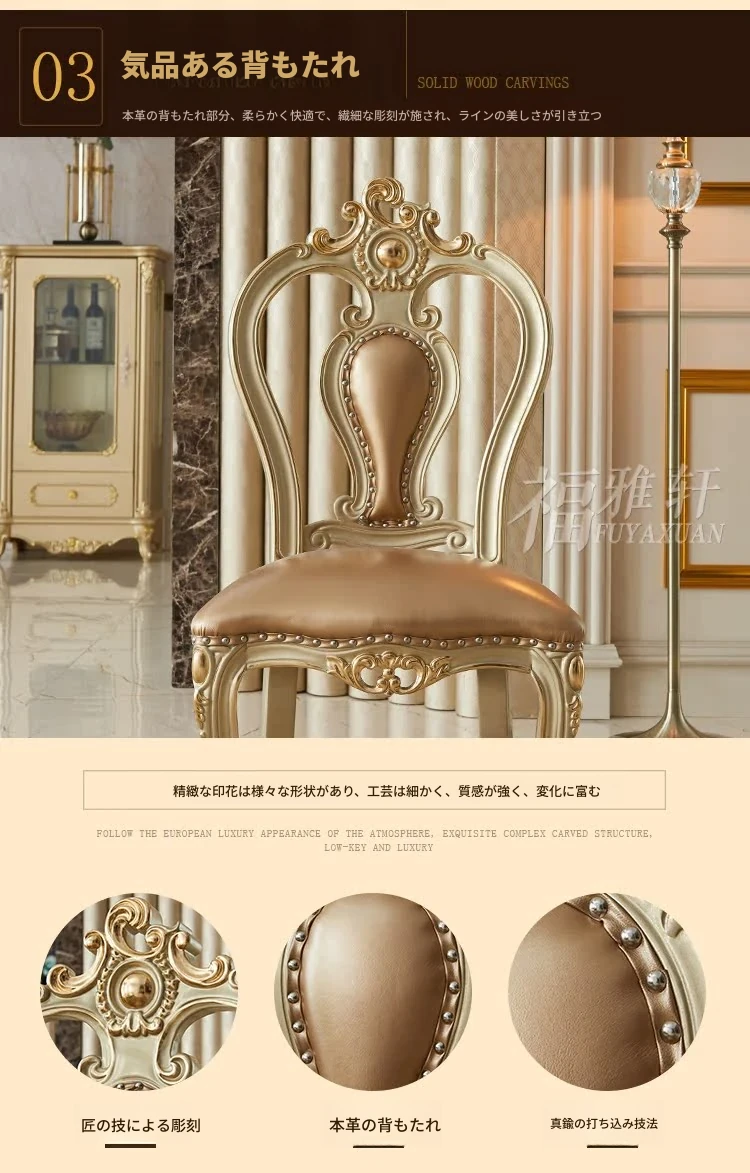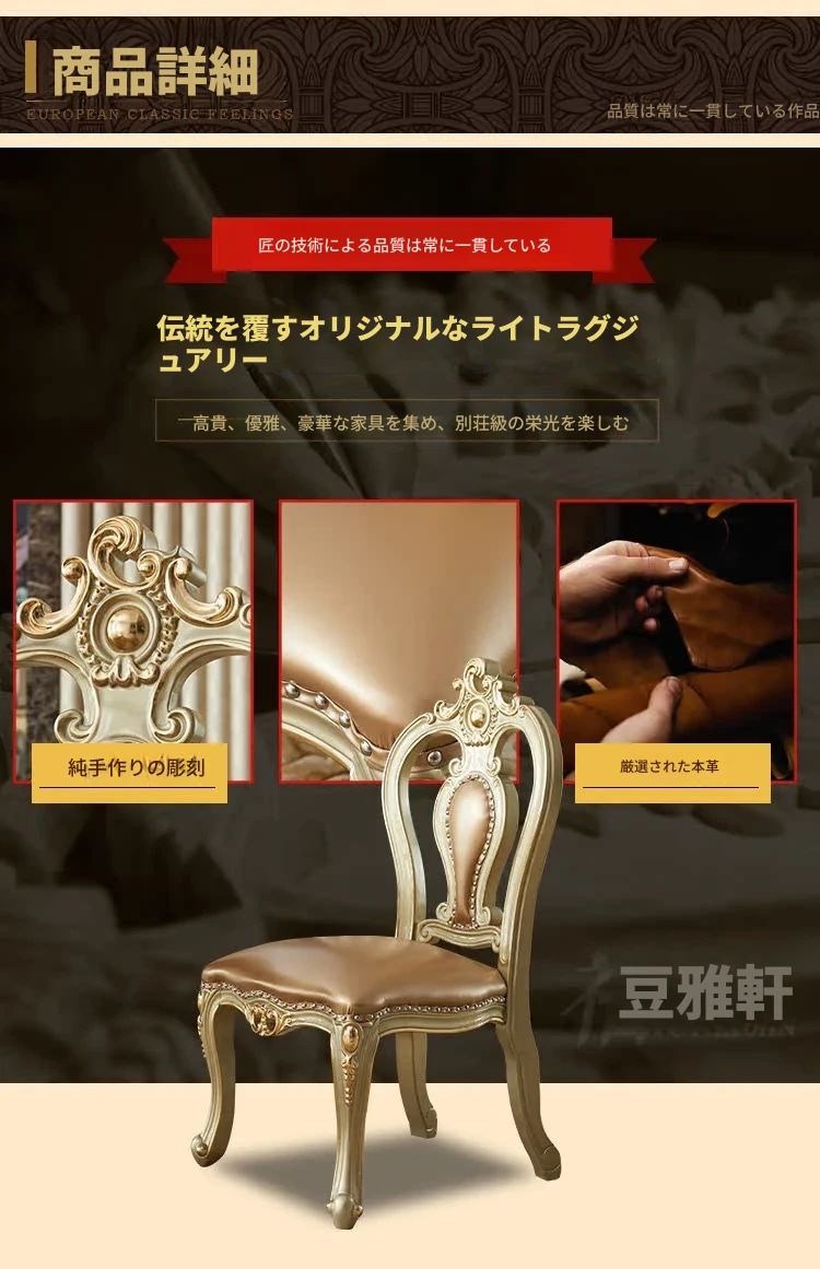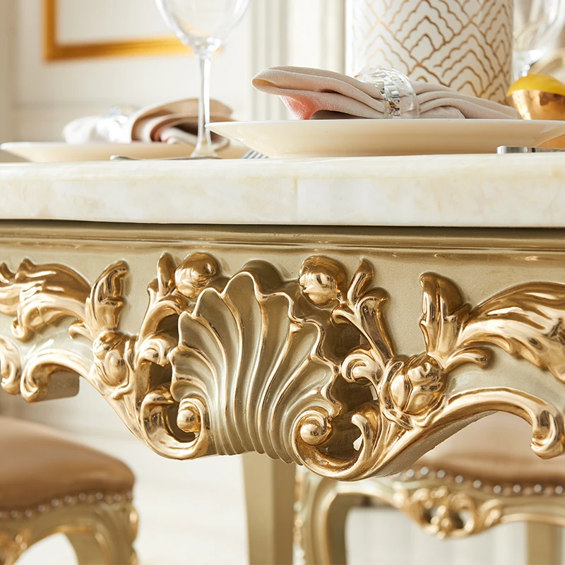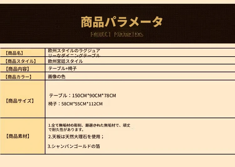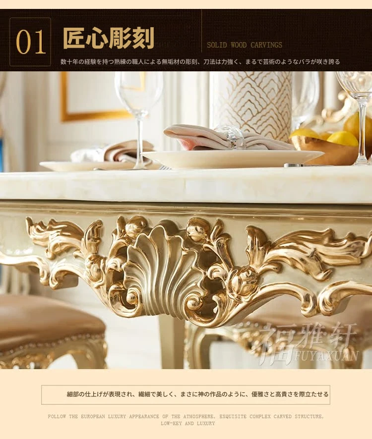 高級感溢れる欧風ダイニングテーブルセット!1.5mの天然大理石と木彫りの美しいデザイン、シャンパンゴールドの華やかな仕上げで、特別な食卓を演出します。家族や友人との素敵なひとときをお楽しみください。