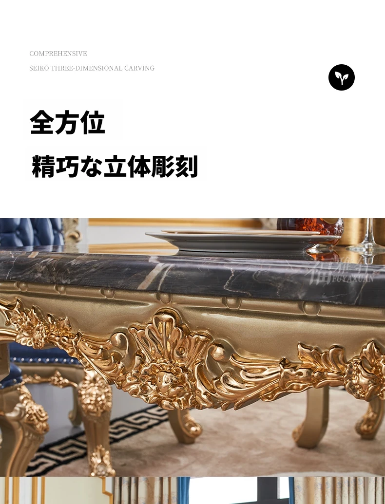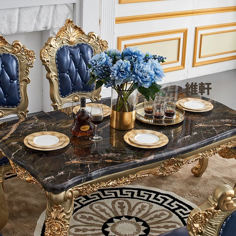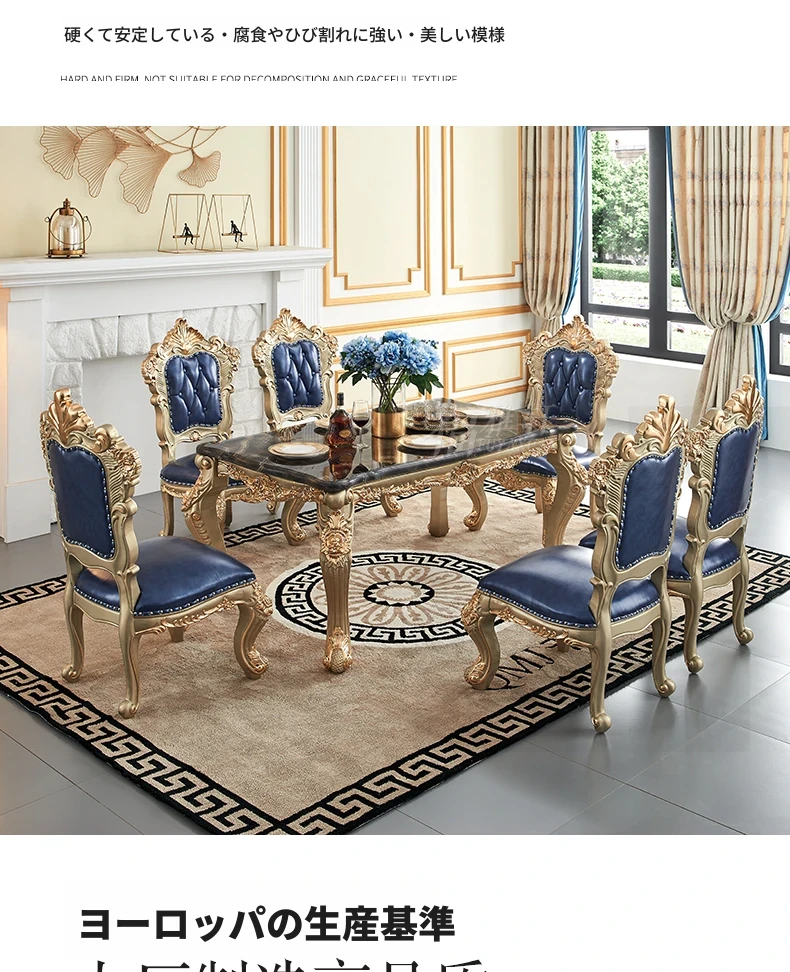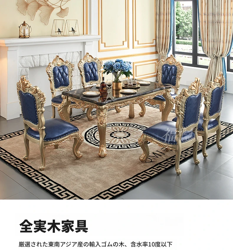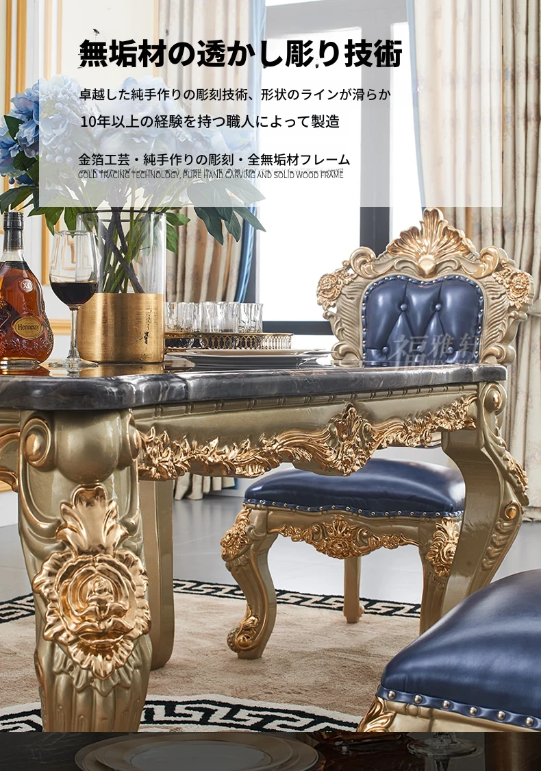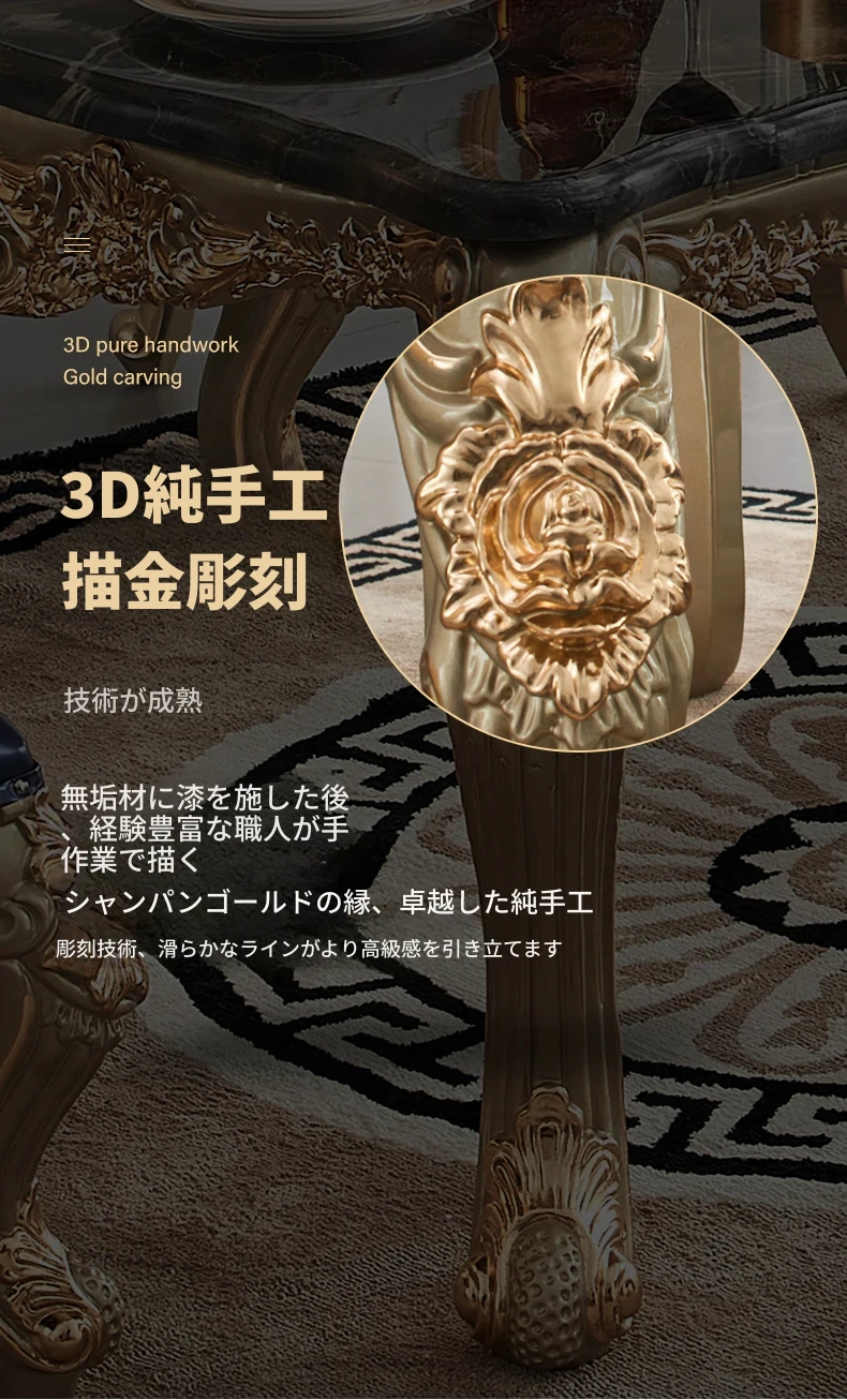 欧風デザインのダイニングテーブルセット!高級感あふれる実木彫刻と大理石天板の1.8mロングテーブル、広々としたリビングルームに最適なシャンパンゴールド色。おしゃれで快適な食事空間を演出します!