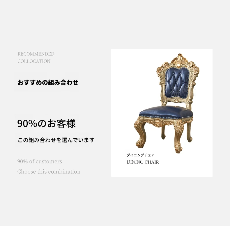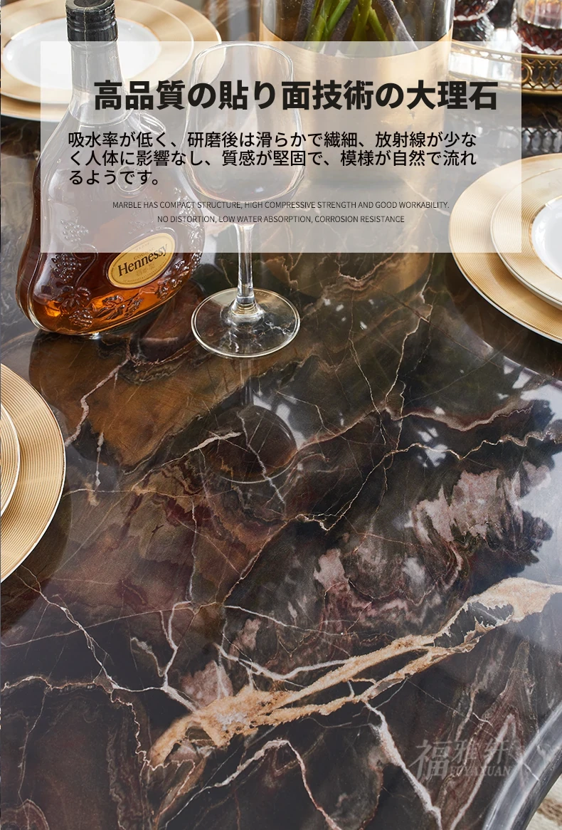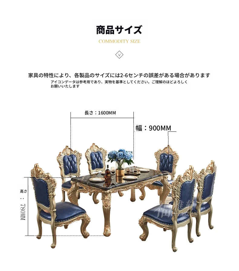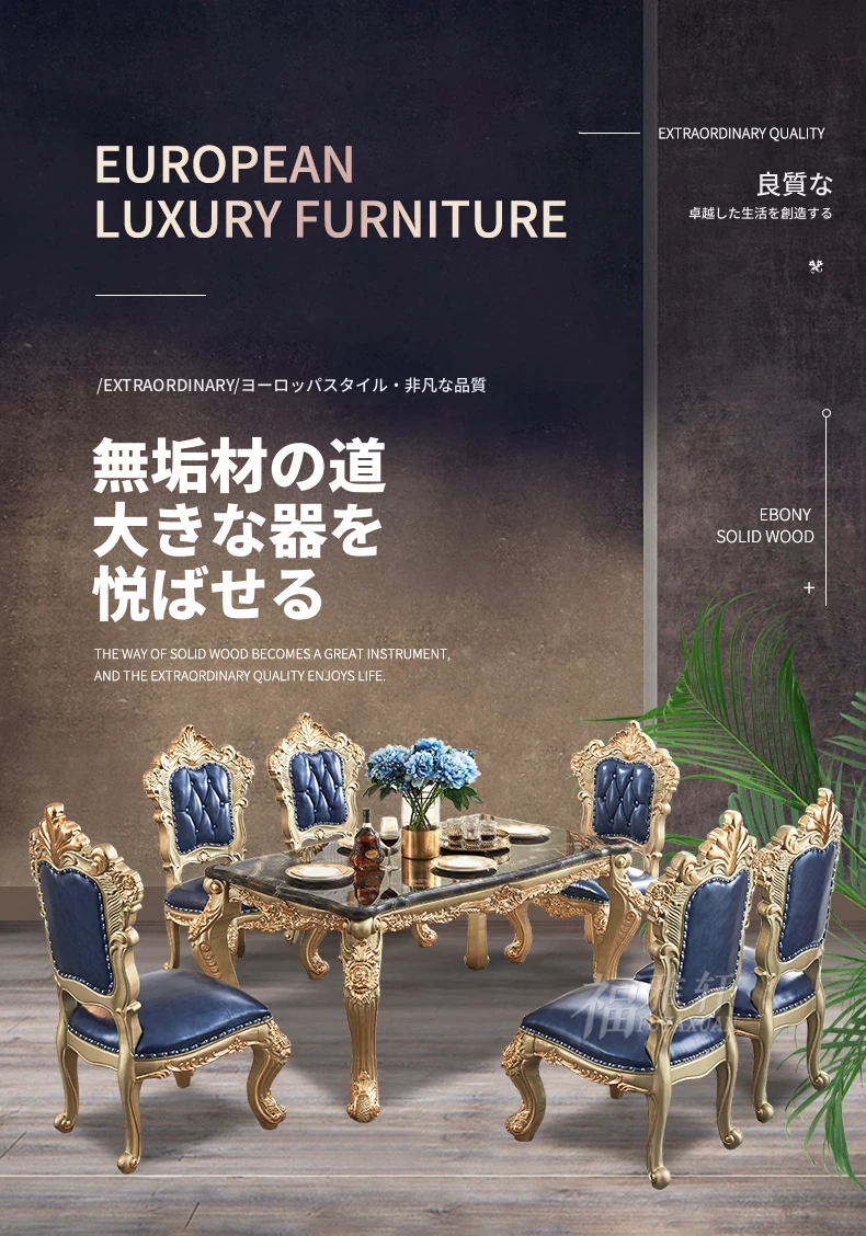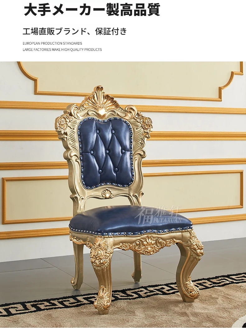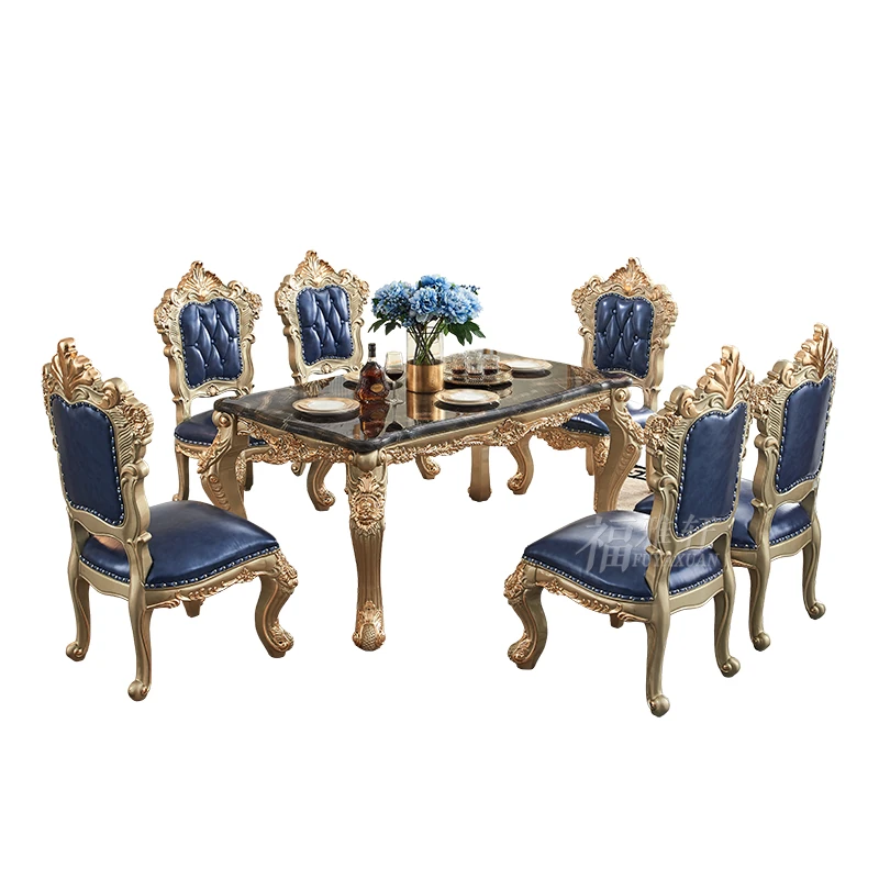 欧風デザインのダイニングテーブルセット!高級感あふれる実木彫刻と大理石天板の1.8mロングテーブル、広々としたリビングルームに最適なシャンパンゴールド色。おしゃれで快適な食事空間を演出します!