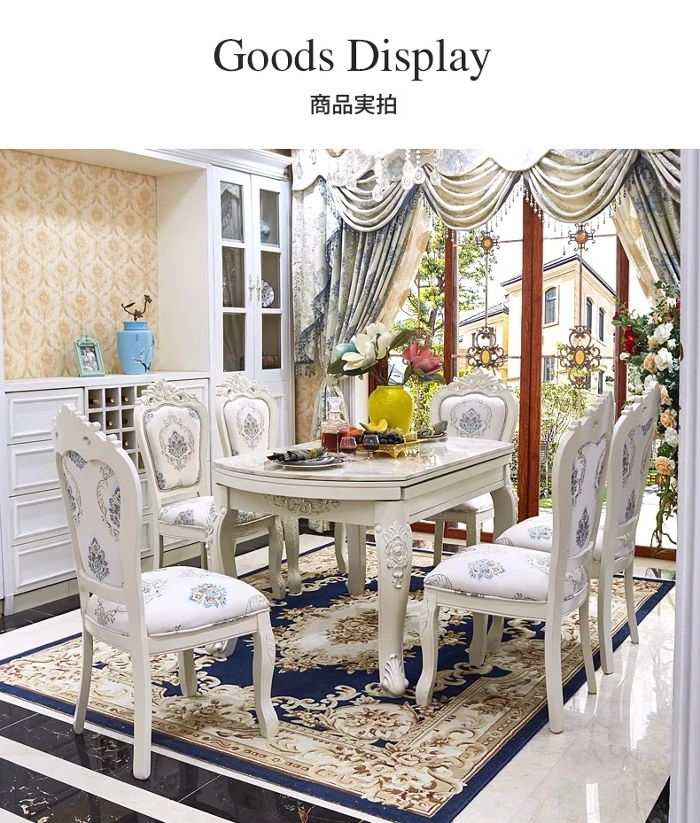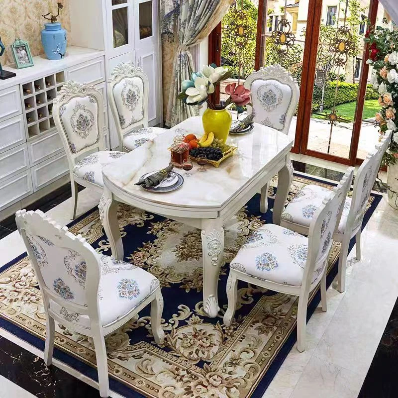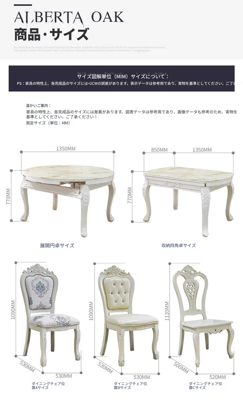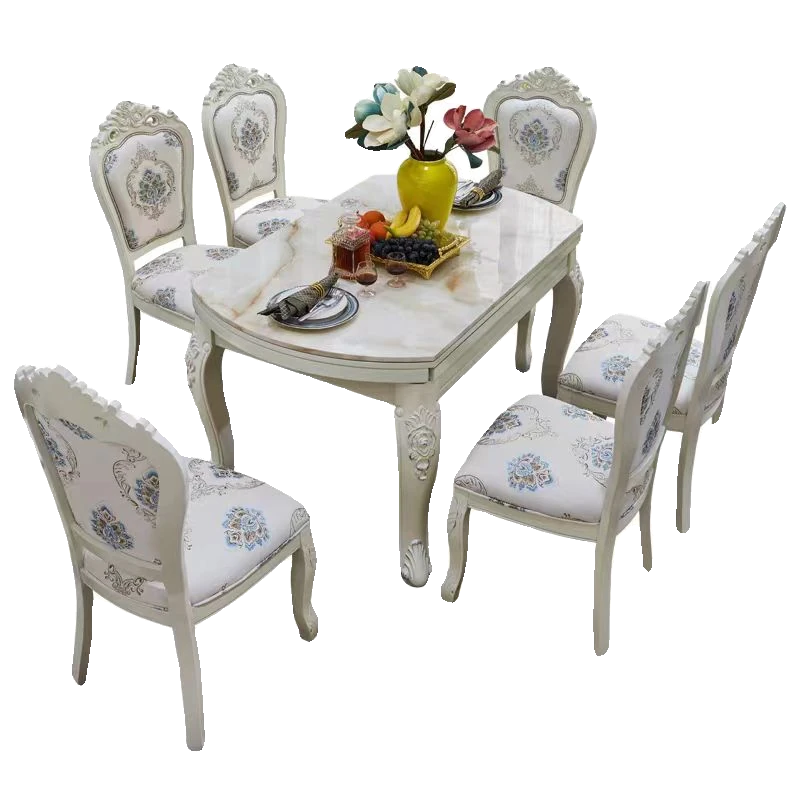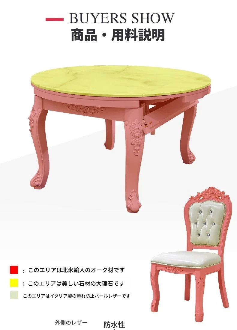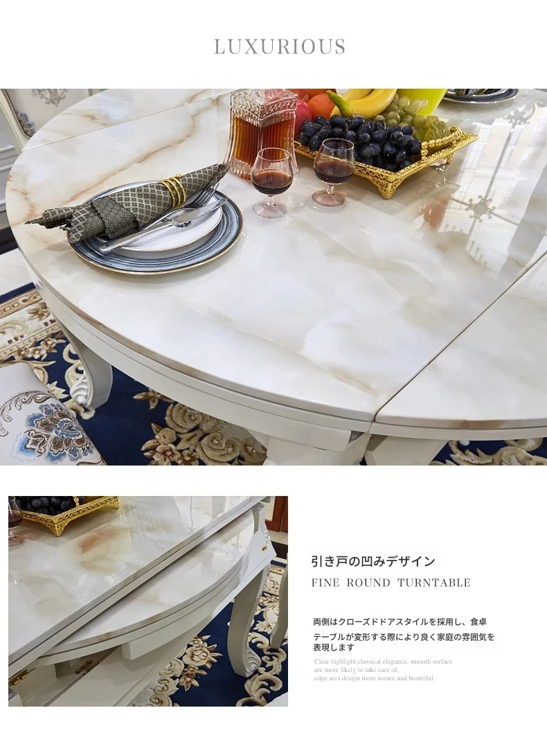 エレガントな欧風デザインの伸縮可能な丸型ダイニングテーブルセット!高品質の無垢材と大理石を使用した白色のアメリカンスタイルの長方形テーブル。リビングルームにぴったりのスタイリッシュな家具で、家族や友人との楽しい食事を演出します!