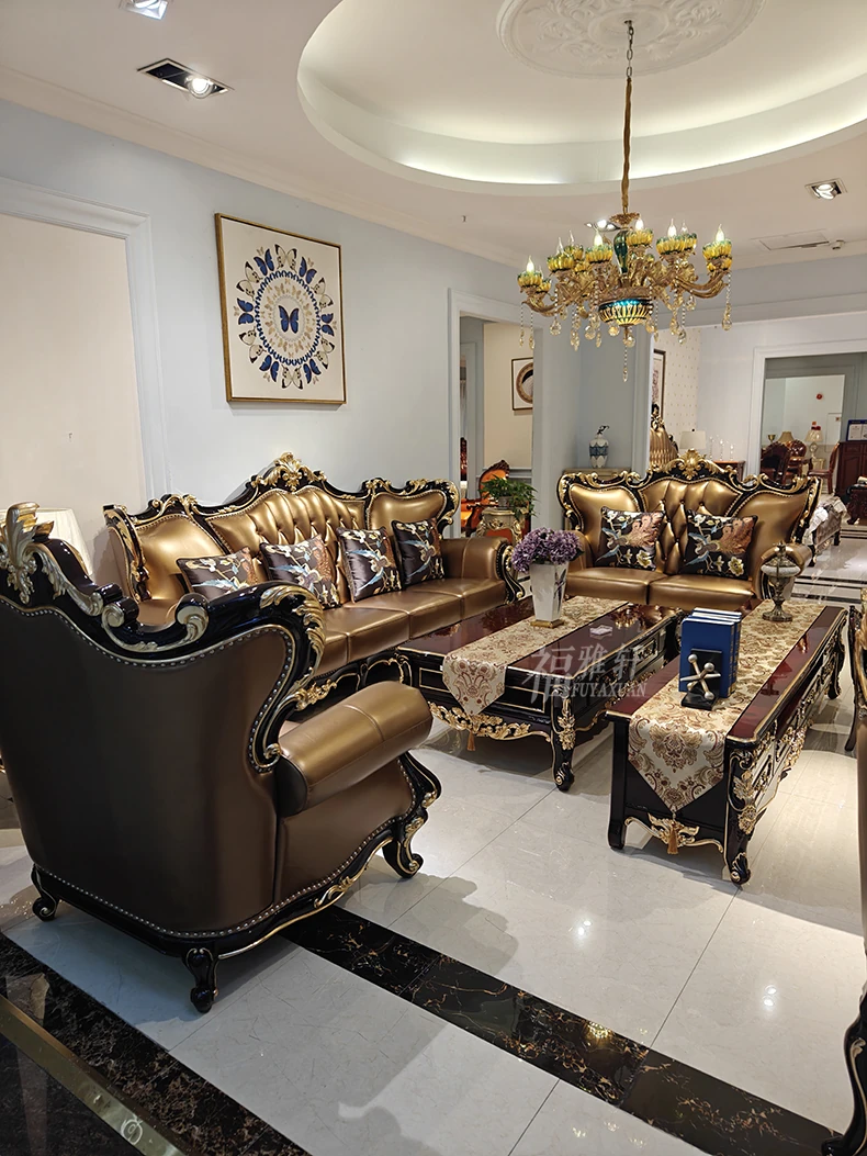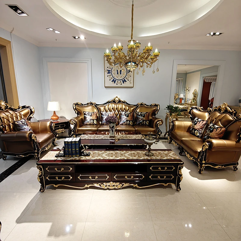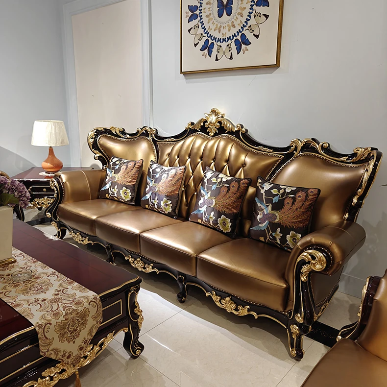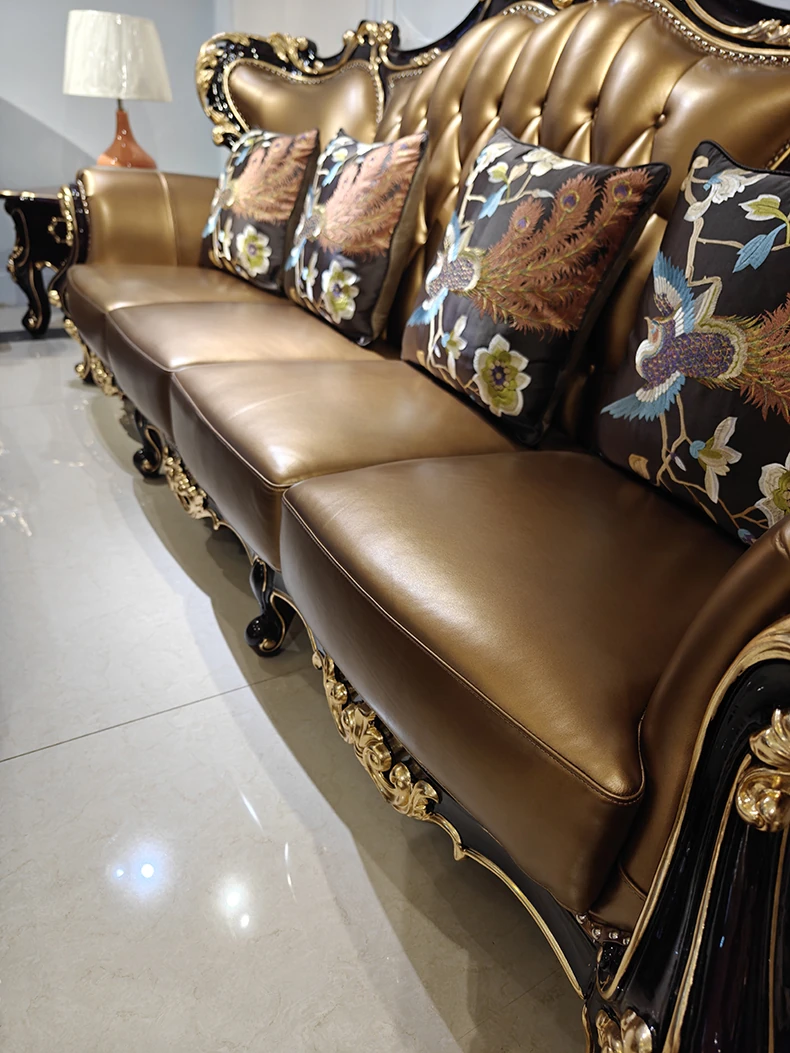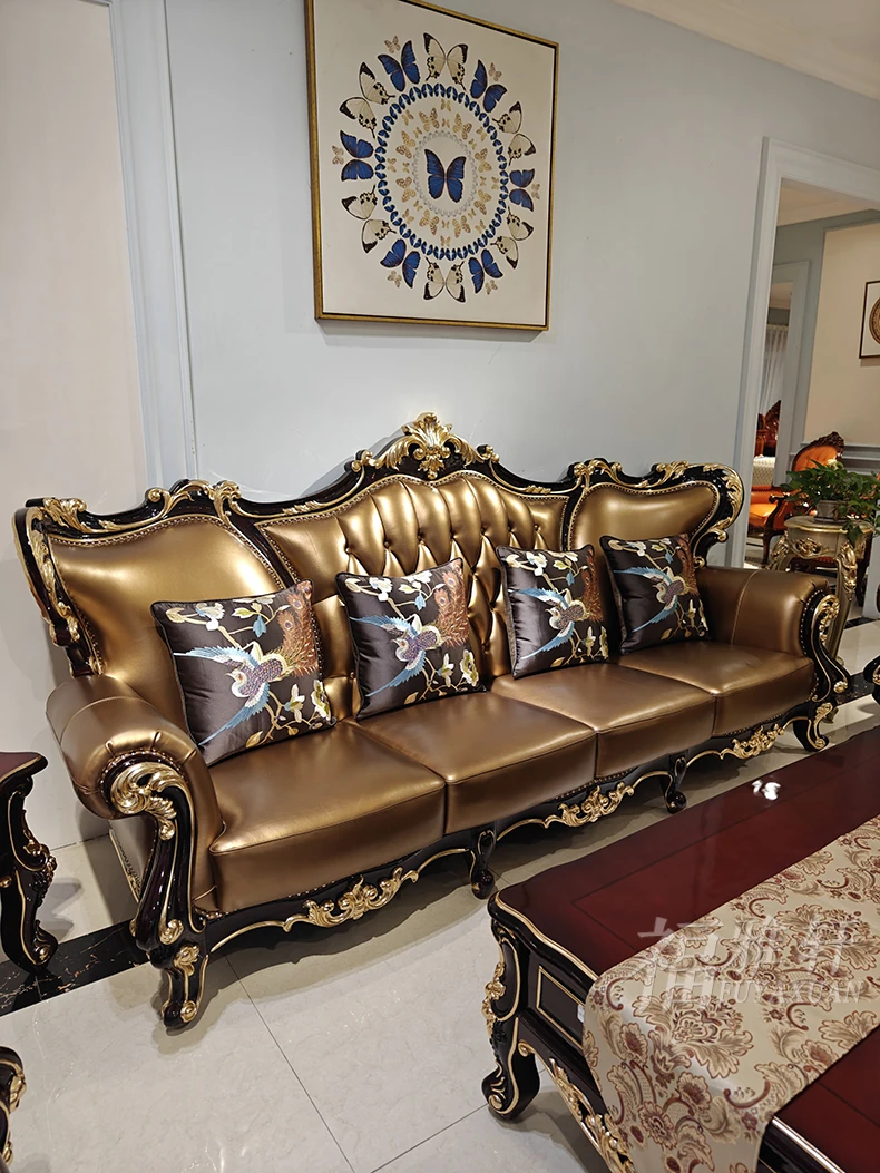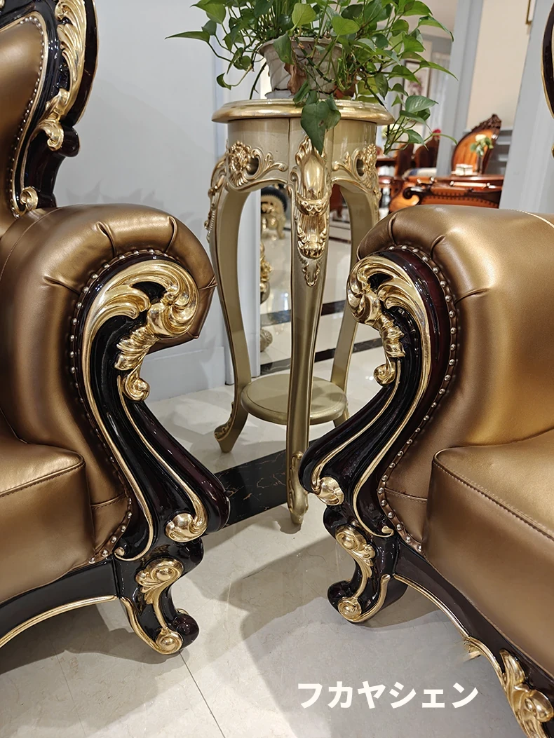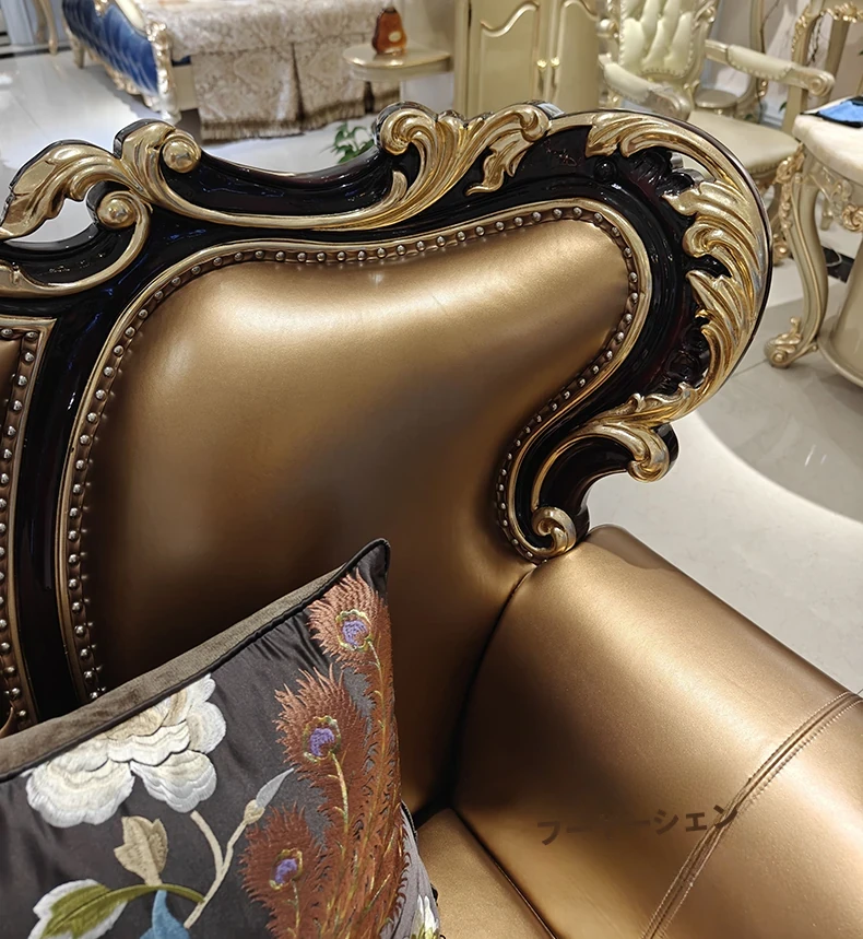欧風本革ソファ 124コンビネーション 高級木製彫刻 大小兼用リビングに最適なマホガニー・ラフィレッド色 123ソファで贅沢な空間を演出!