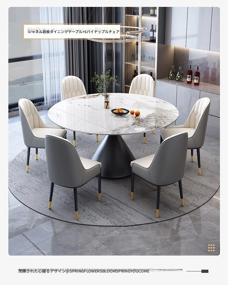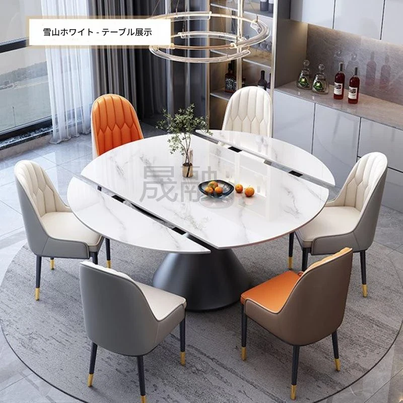 Sn イタリアンスタイルのラグジュアリー回転光沢岩板ダイニングテーブルとチェアのセット - 伸縮自在、四角と円形の2WAYデザイン、小型住宅に最適な食卓!