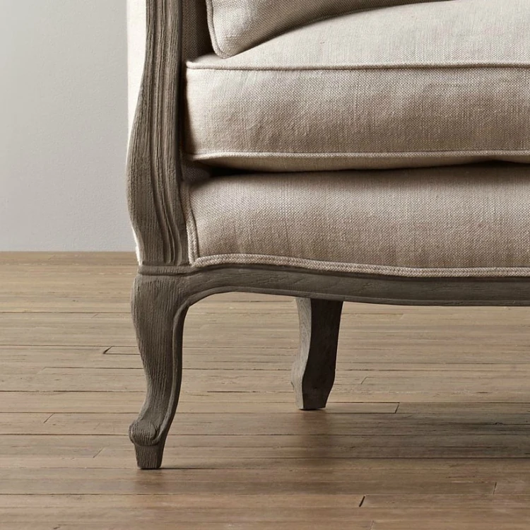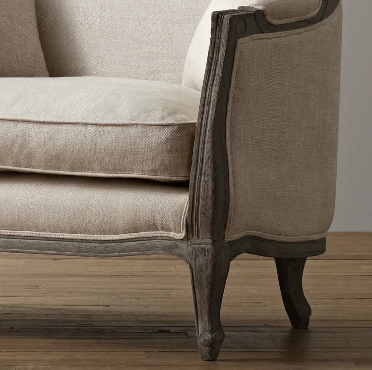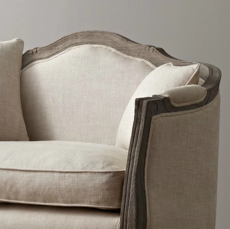 フランス田舎風レトロ全木製オークダブルソファー|アメリカRH家具リネン生地一人掛けカジュアルソファ|優雅で快適な空間を演出!
