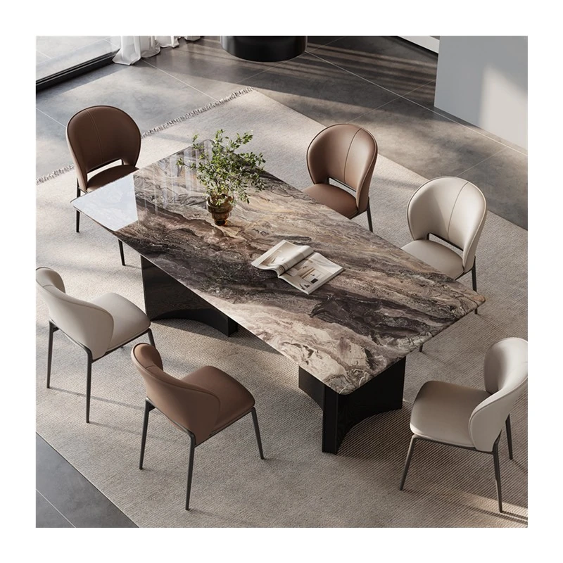 ヴェネツィアブラウンラグジュアリー石のダイニングテーブル+エコレザーのダイニングチェア*6