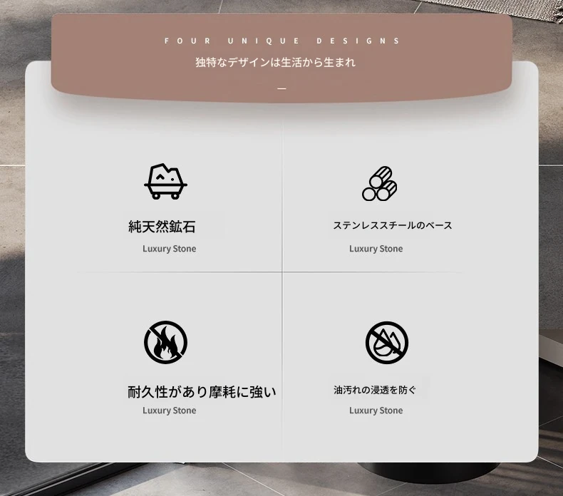 ヴェネツィアブラウンラグジュアリー石のダイニングテーブル+エコレザーのダイニングチェア*4