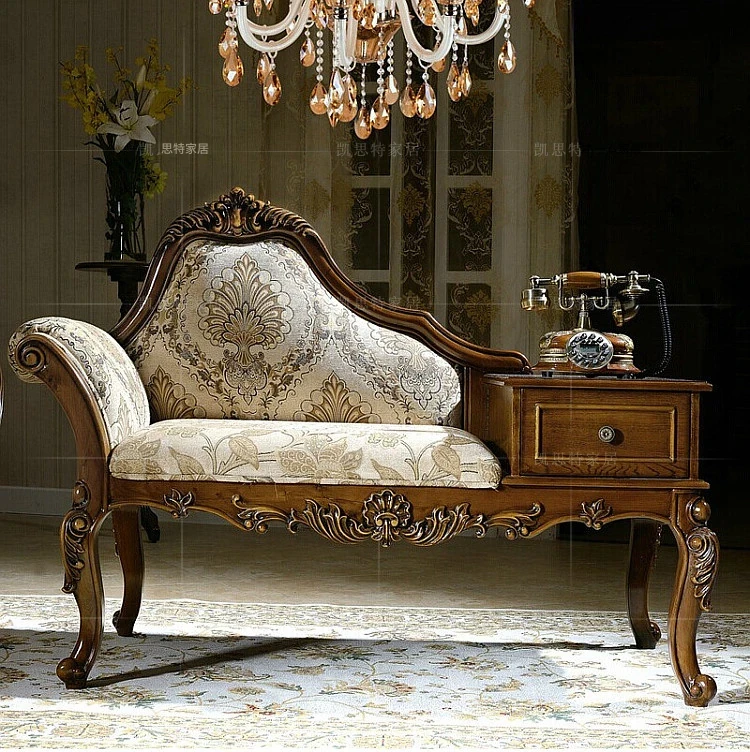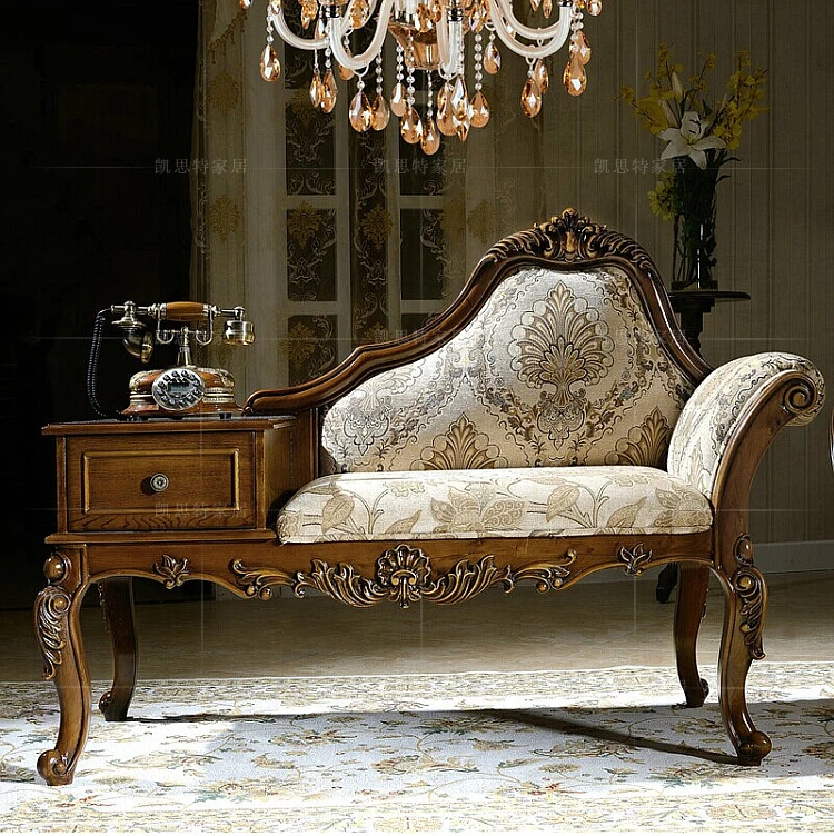 アメリカンスタイルの無垢材彫刻付き貴妃椅子 電話椅子 欧風ファブリック刺繍ソファチェア 豪華な彫刻美人座椅子で、リラックスしたひとときをお楽しみください!