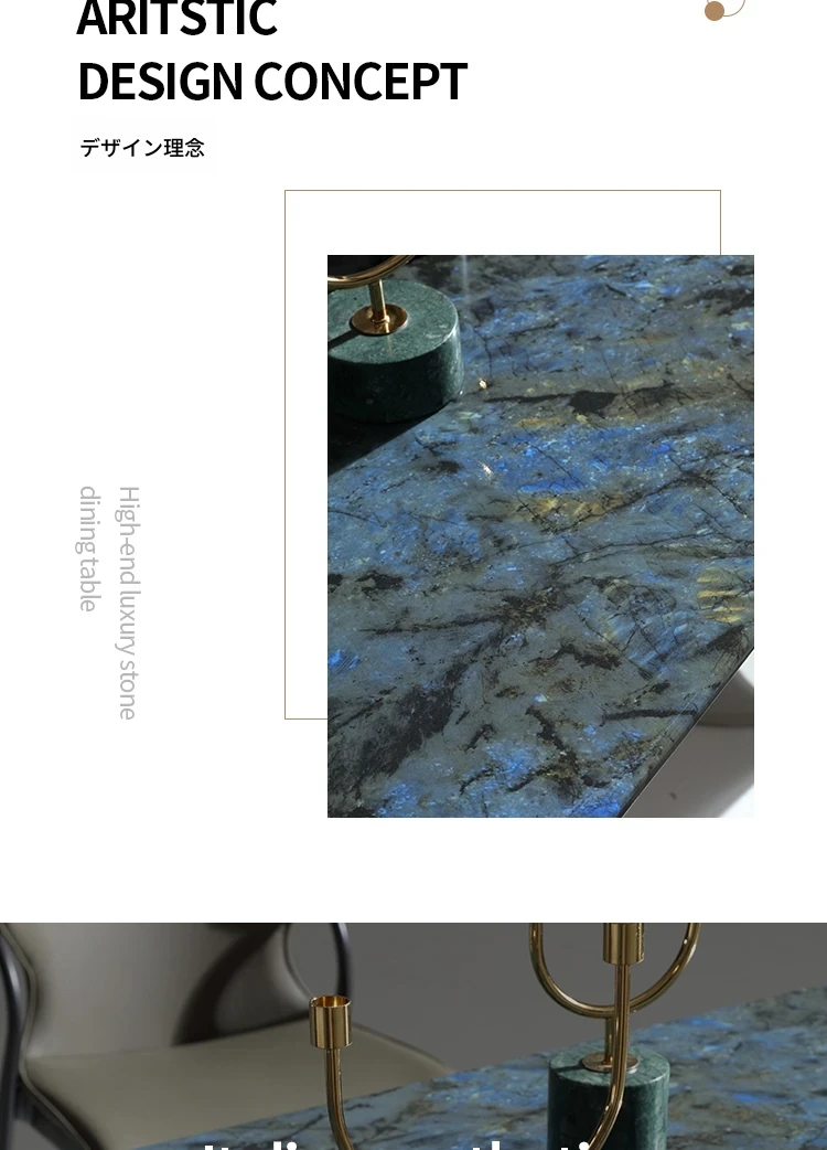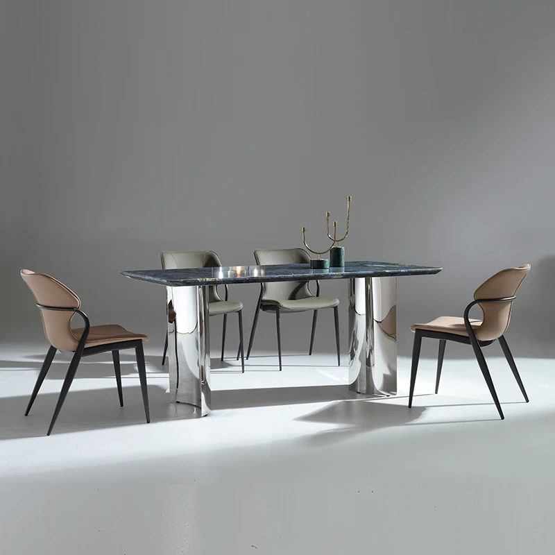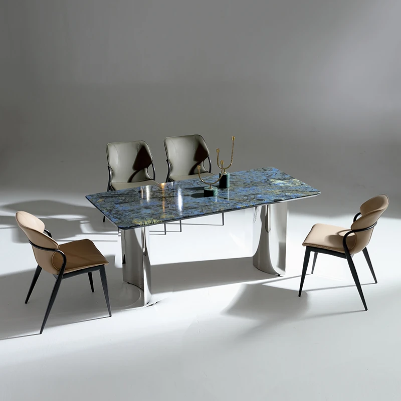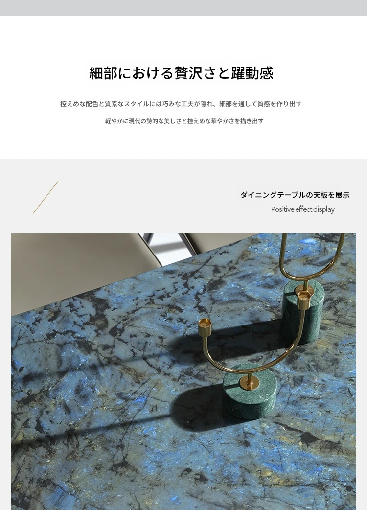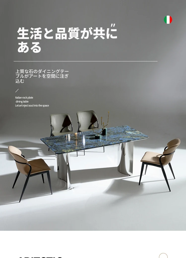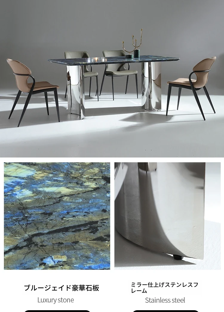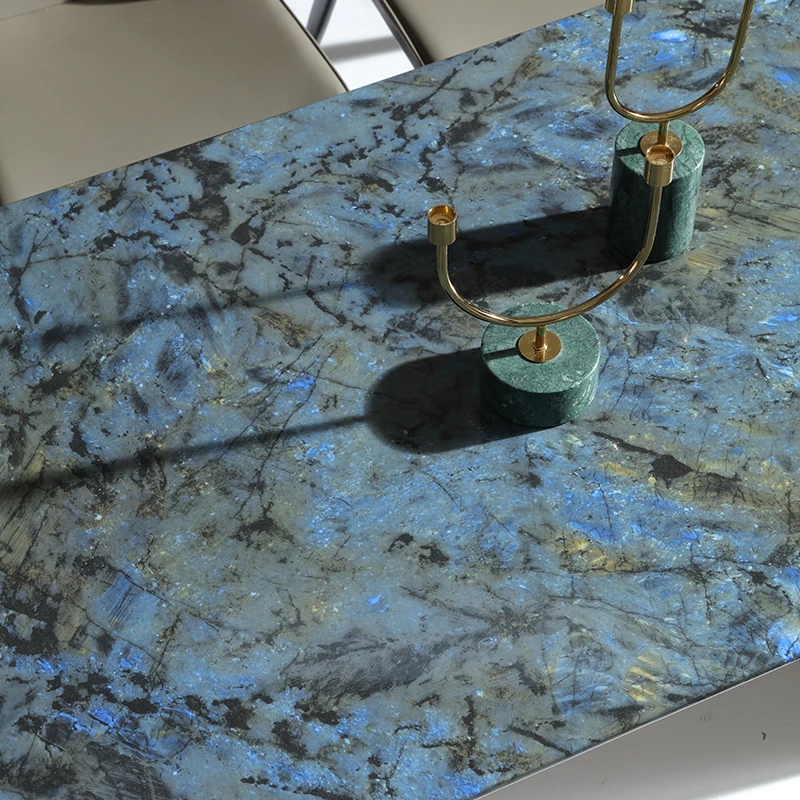 ラグジュアリーなブルージェイド大理石の長方形ダイニングテーブルセット - 6脚の椅子付き!洗練された石のテクスチャーで、あなたの食卓を華やかに彩ります。家庭用に最適な高級感溢れるデザイン。