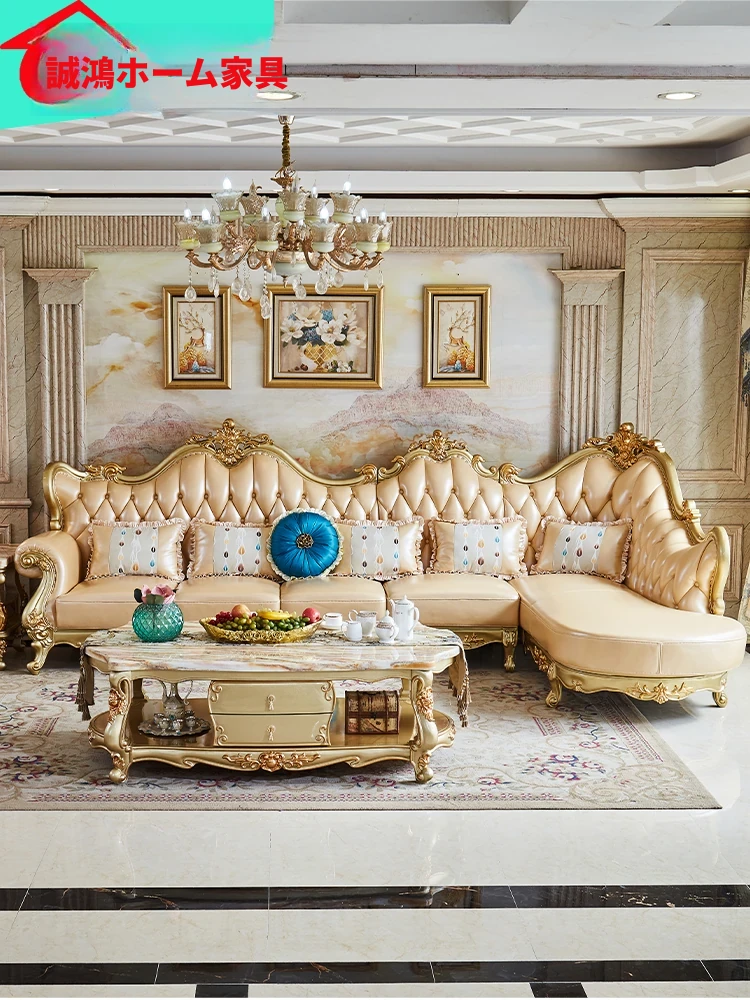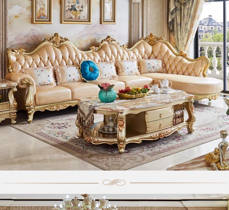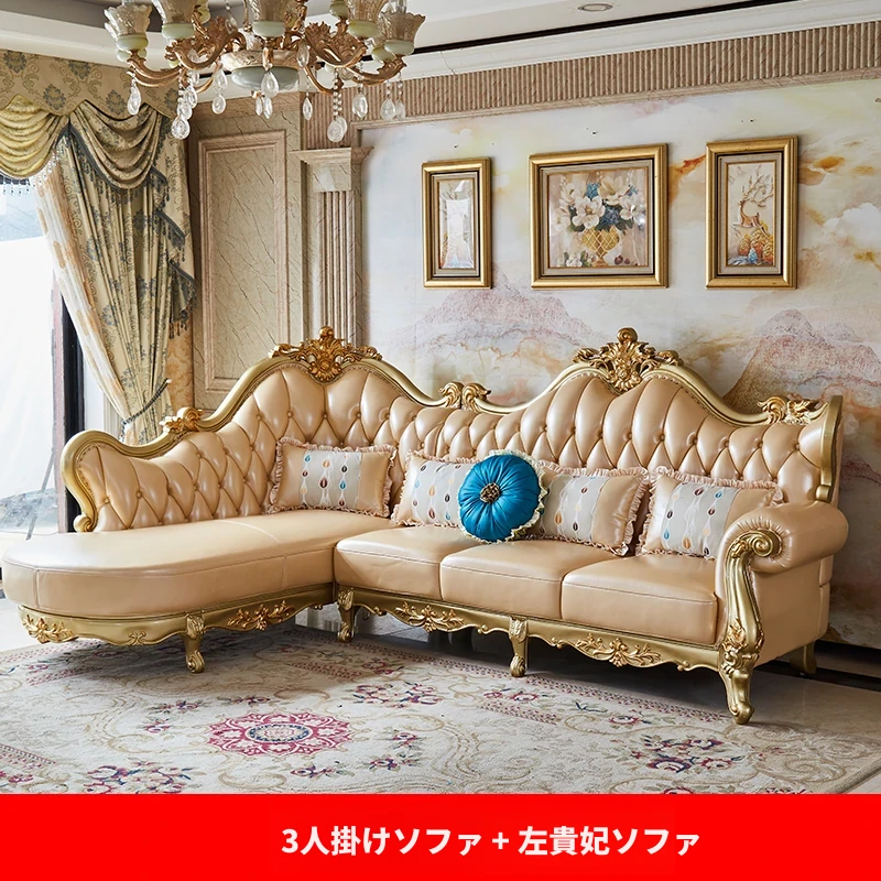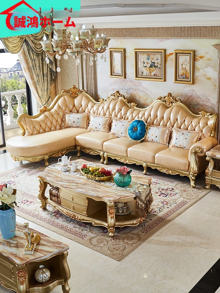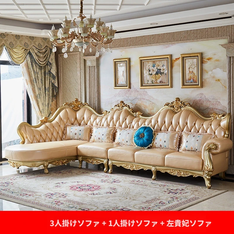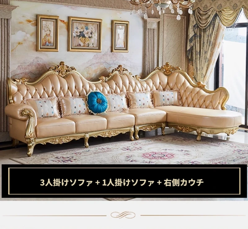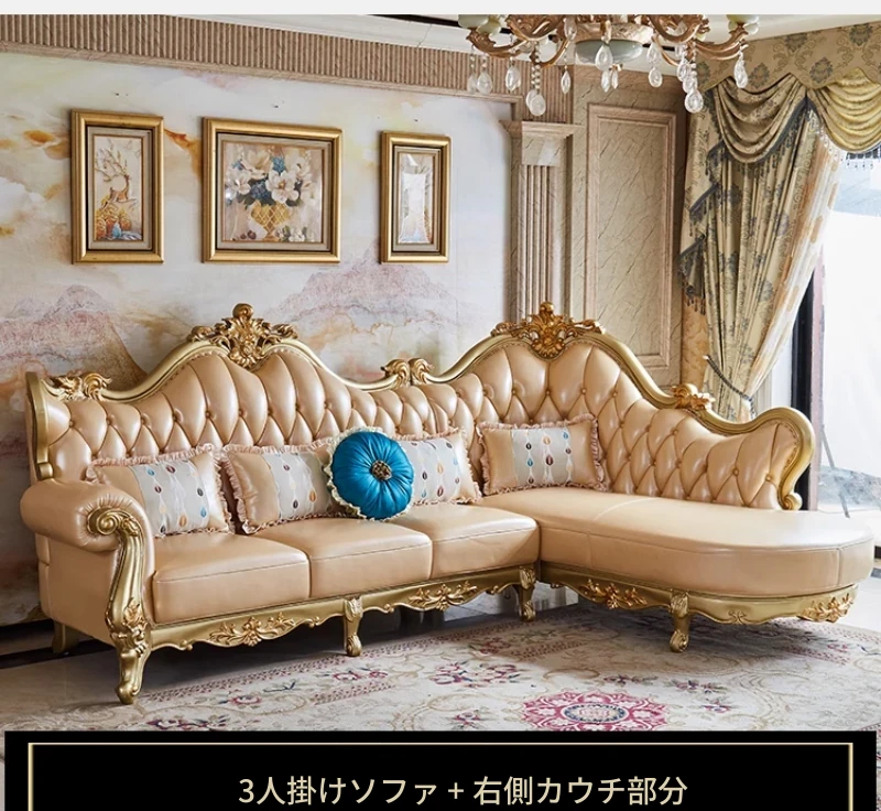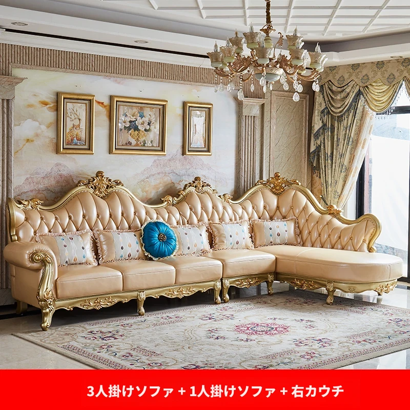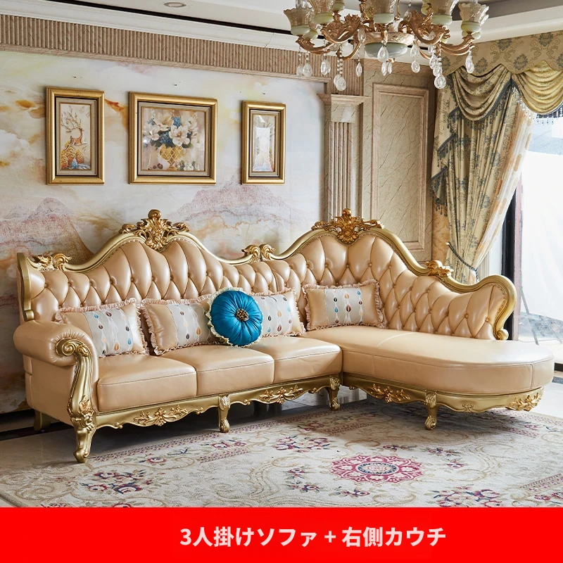 欧風本革L字型ソファセット - 高級ヴィラ向け、豪華なリビングルームに最適!シンプルでスタイリッシュなデザイン、全て揃ったセットで贅沢なひとときを演出。