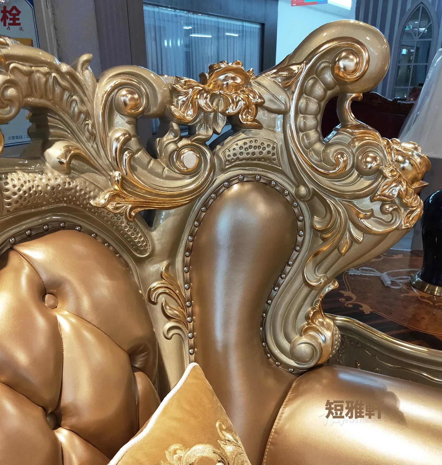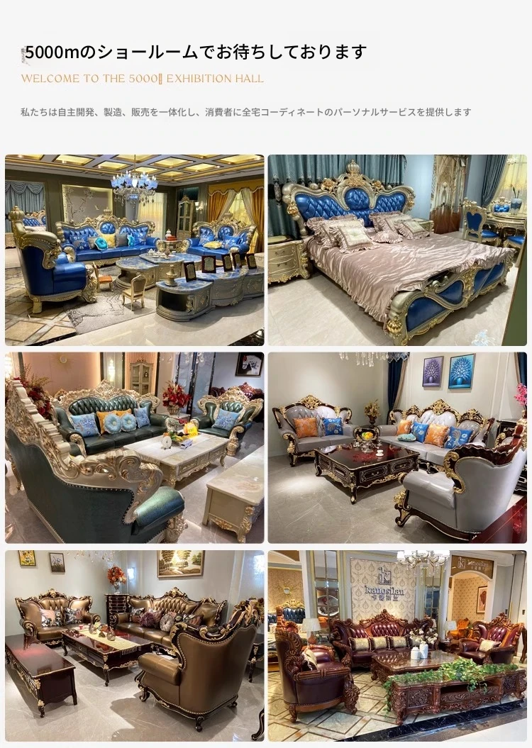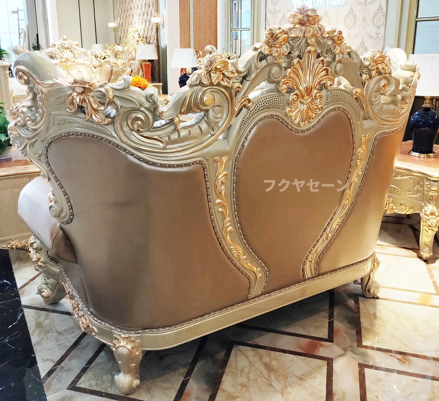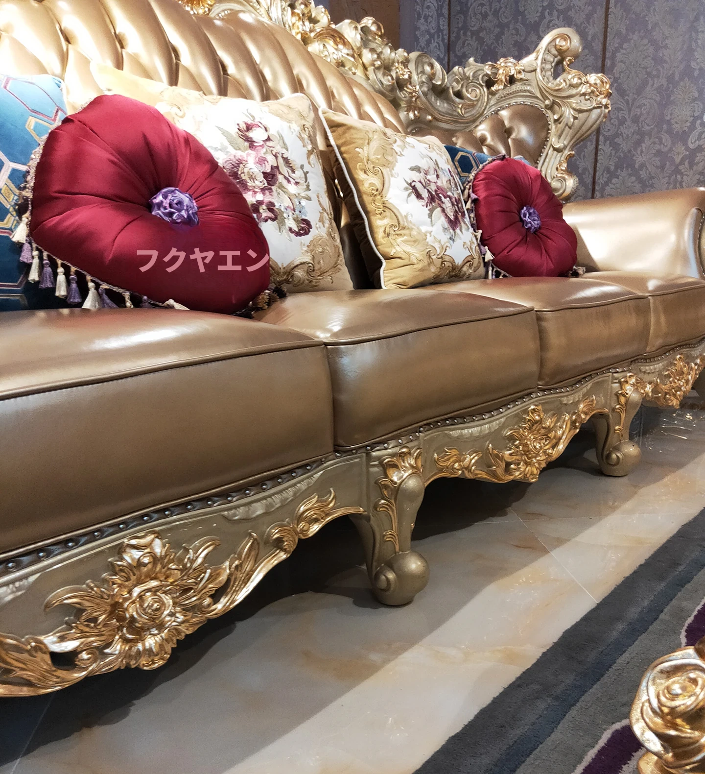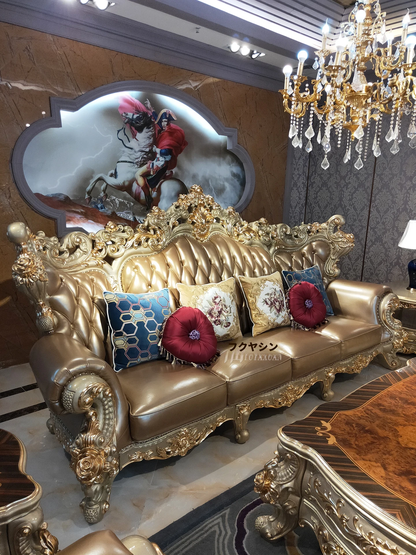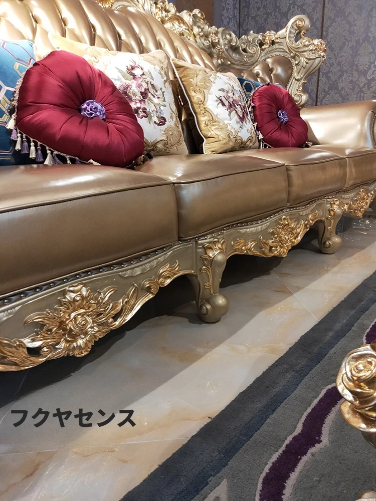 高級感溢れる欧式本革ソファー!豪華な木彫りデザインで、別荘や広いリビングにぴったりのシャンパンゴールドの124点セット家具。心地よい空間を演出します!