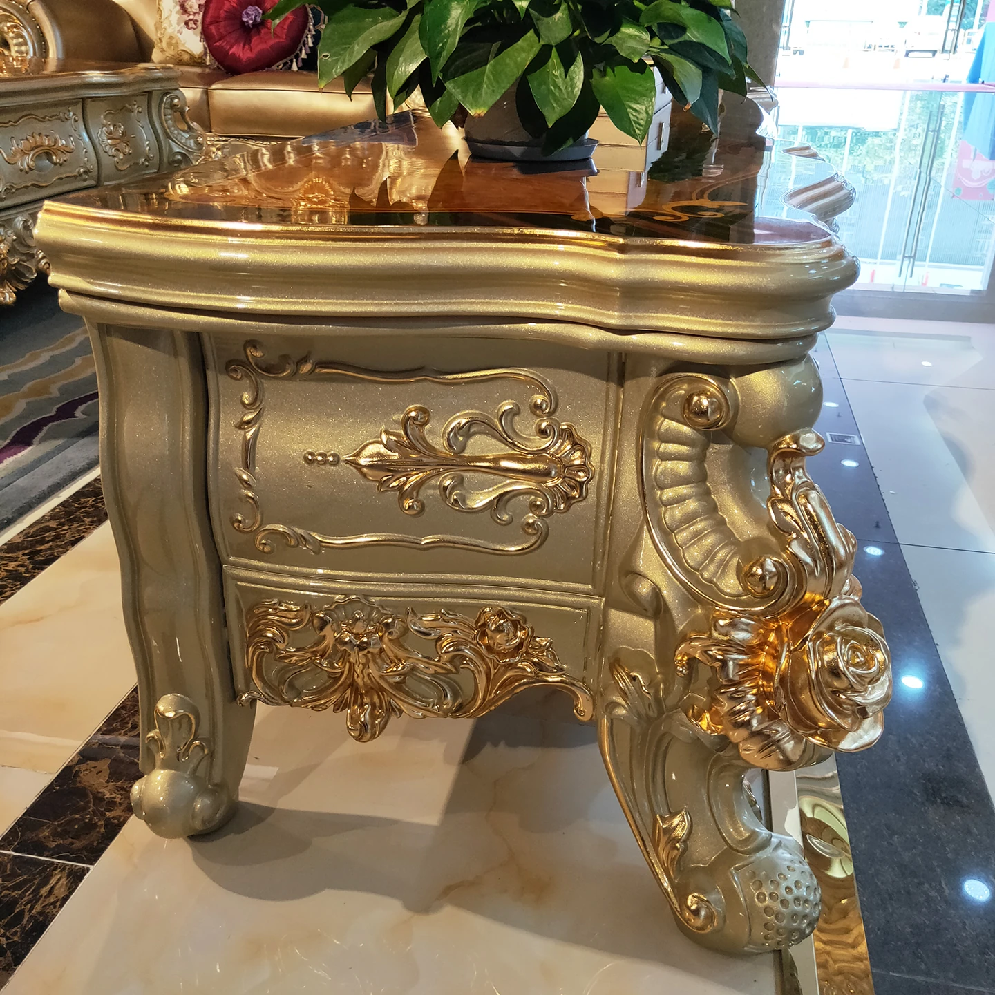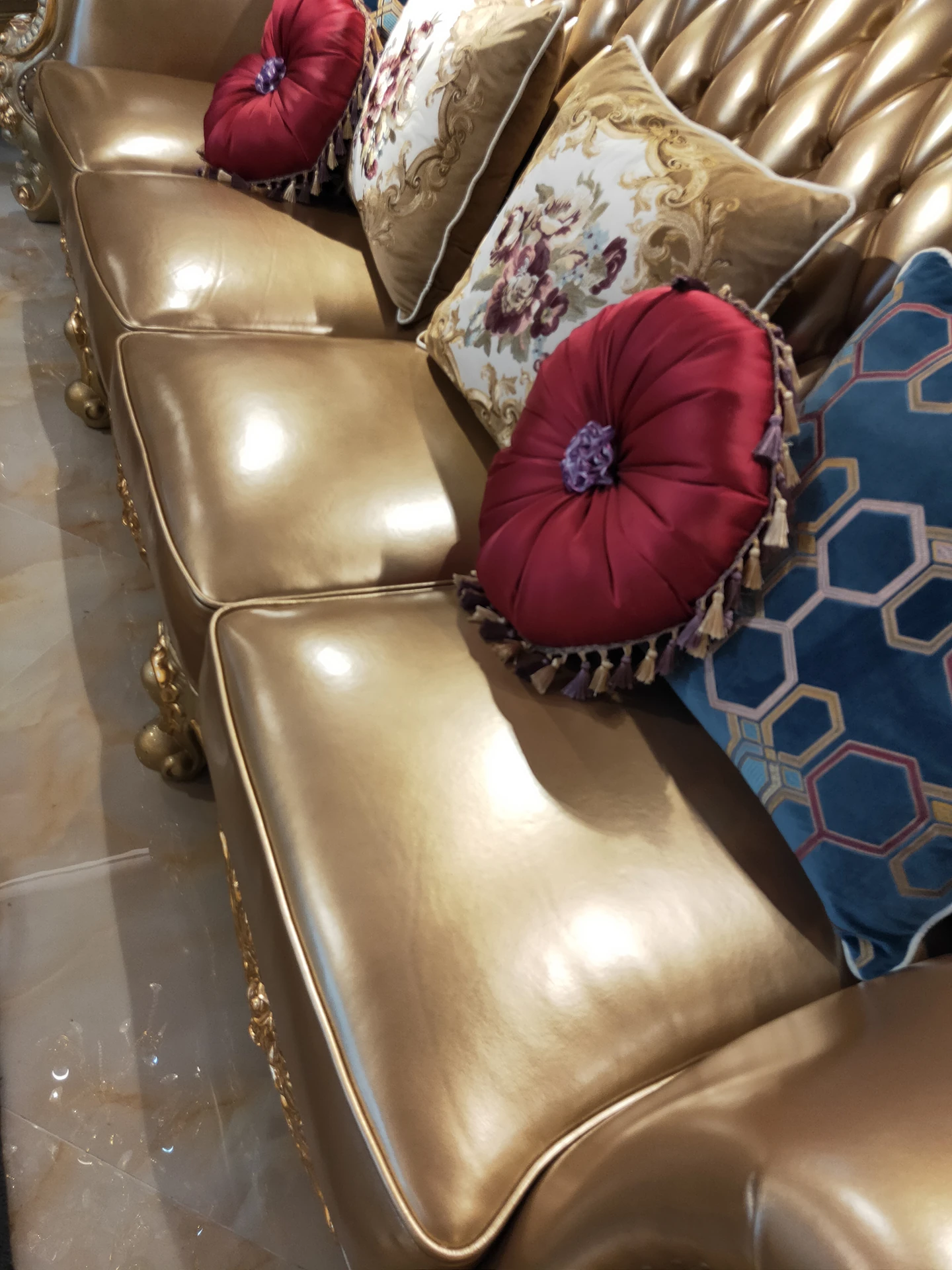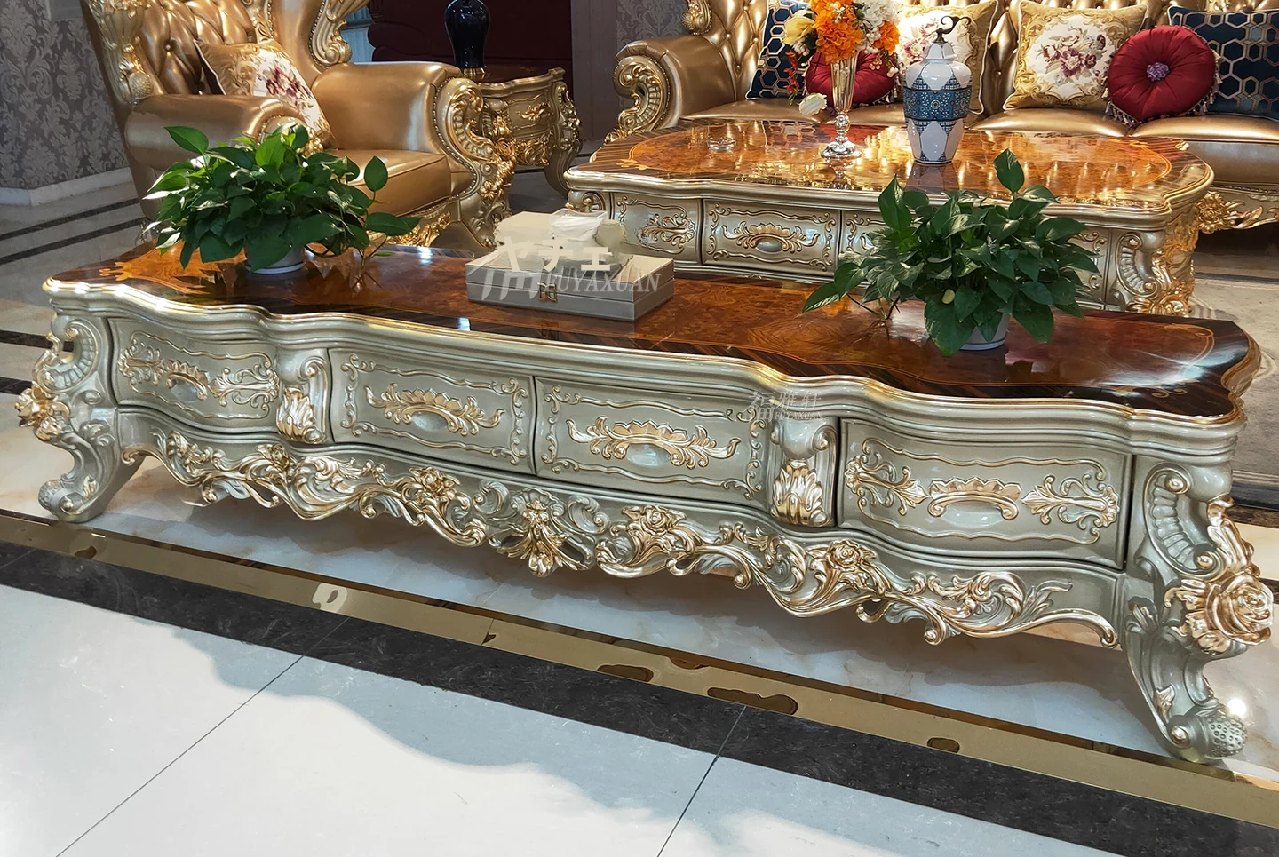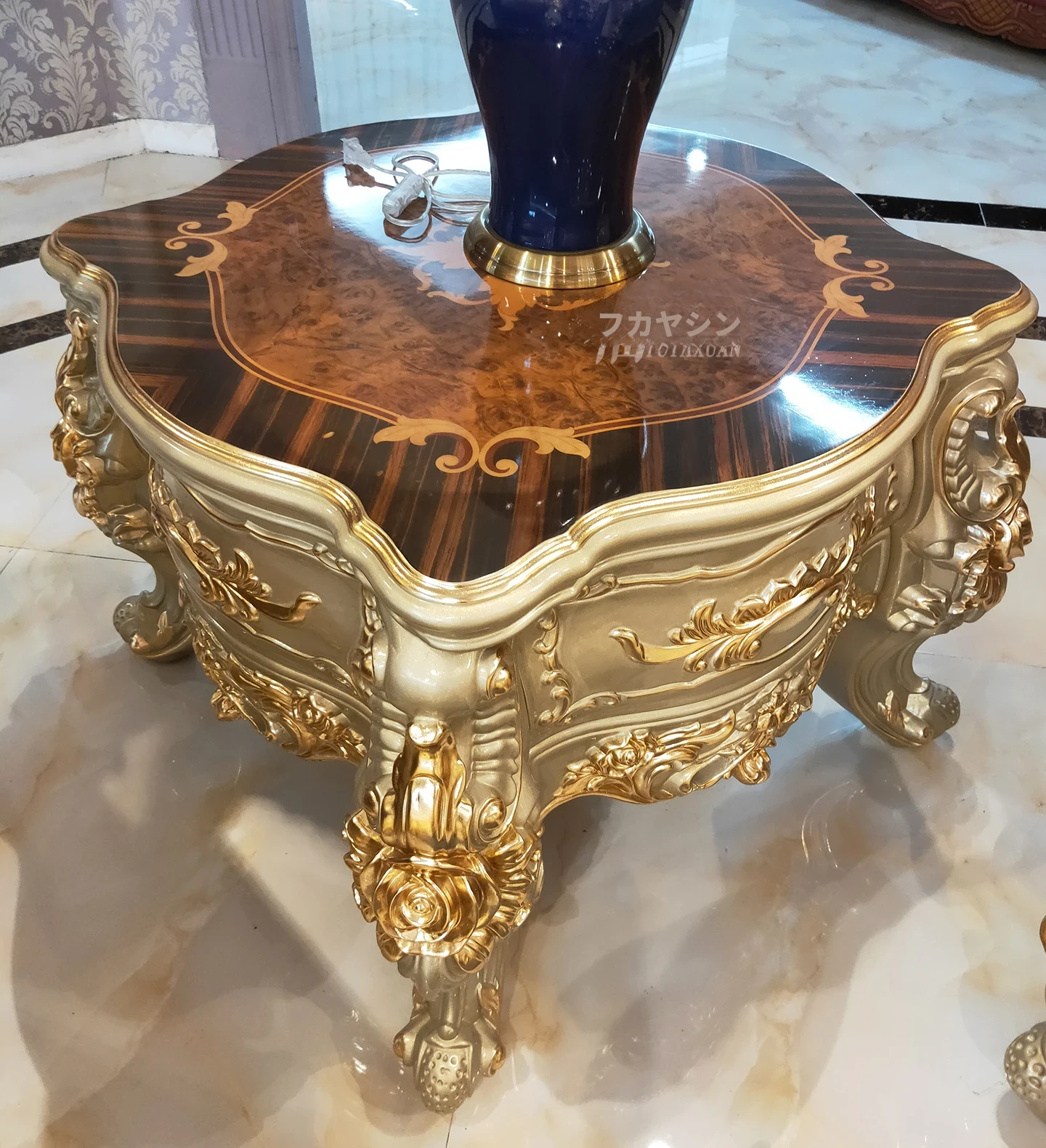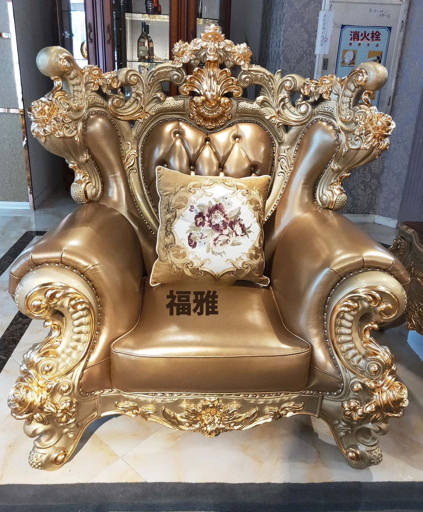 高級感溢れる欧式本革ソファー!豪華な木彫りデザインで、別荘や広いリビングにぴったりのシャンパンゴールドの124点セット家具。心地よい空間を演出します!