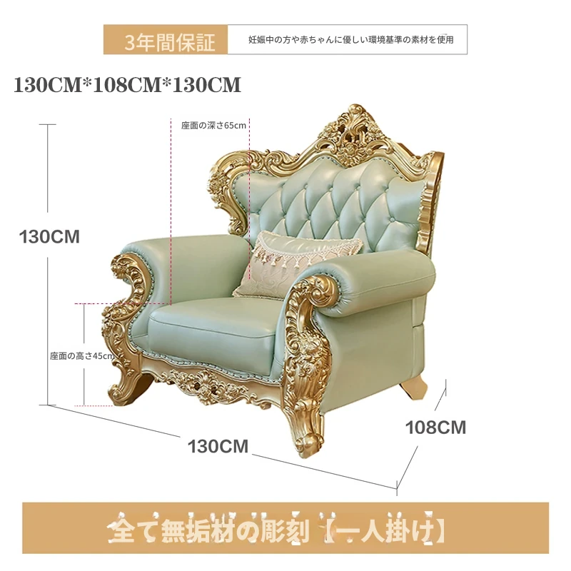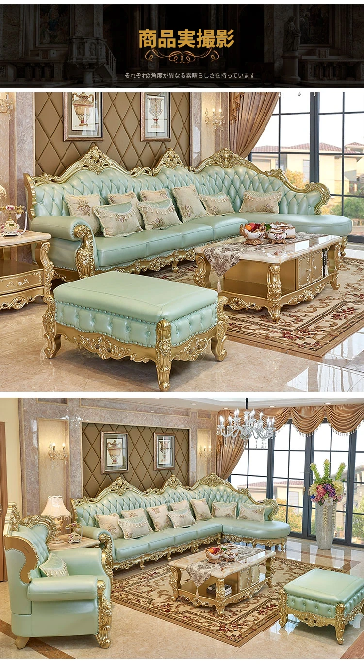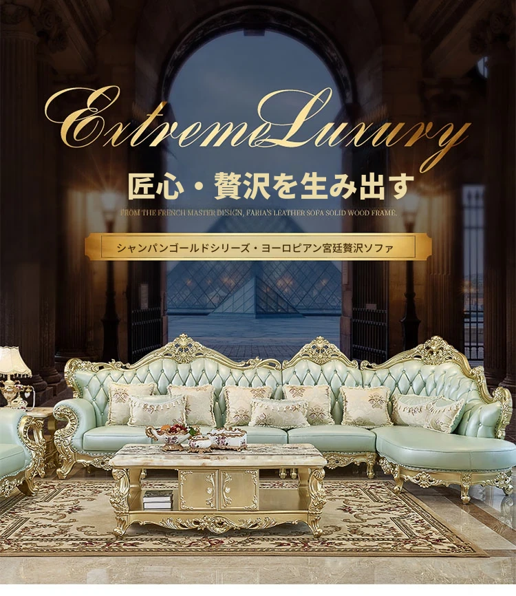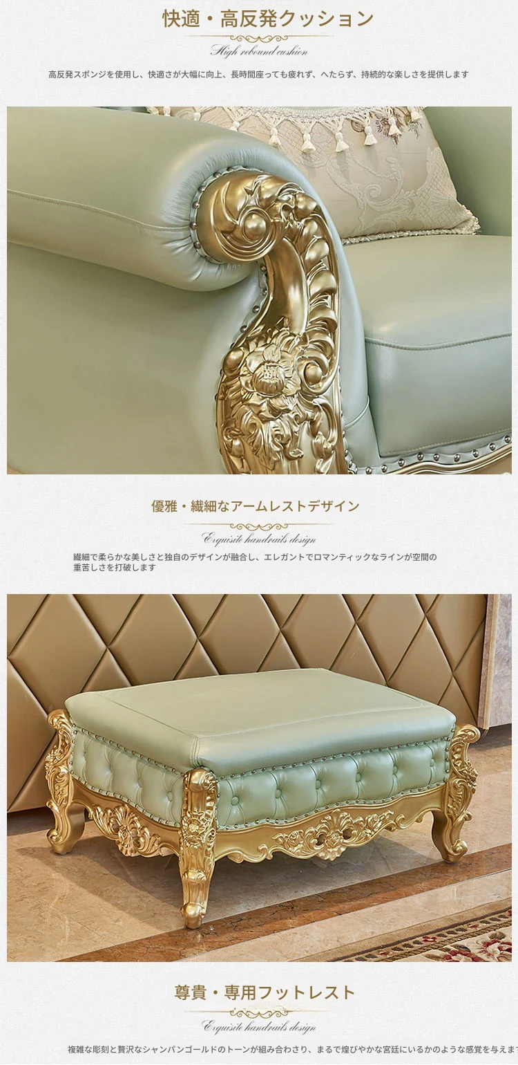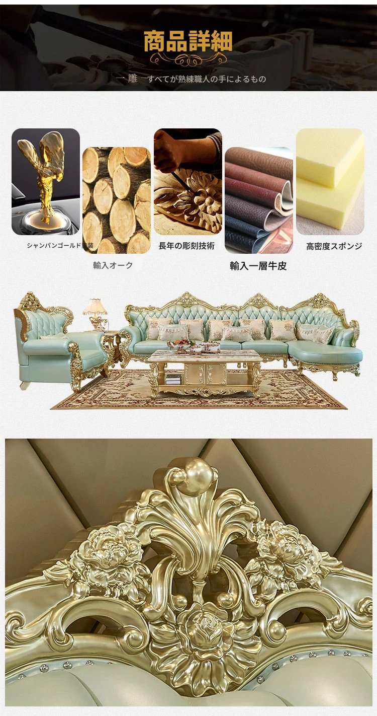 高級感あふれる欧風本革ソファセット|シャンパンゴールドの木彫りデザイン|1人掛けから4人掛けまで対応|贅沢なコーナーソファ|広々としたリビングにぴったりなヴィラスタイル!