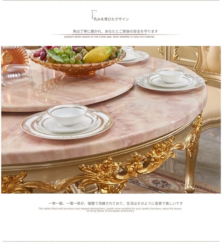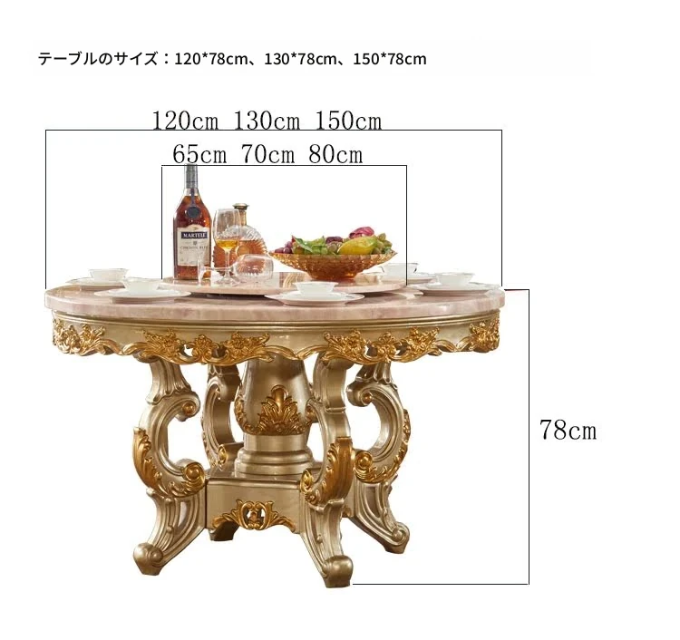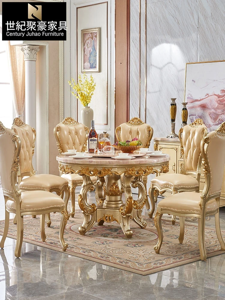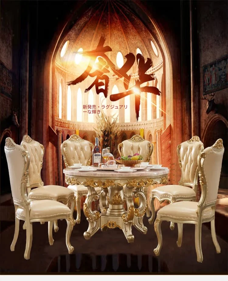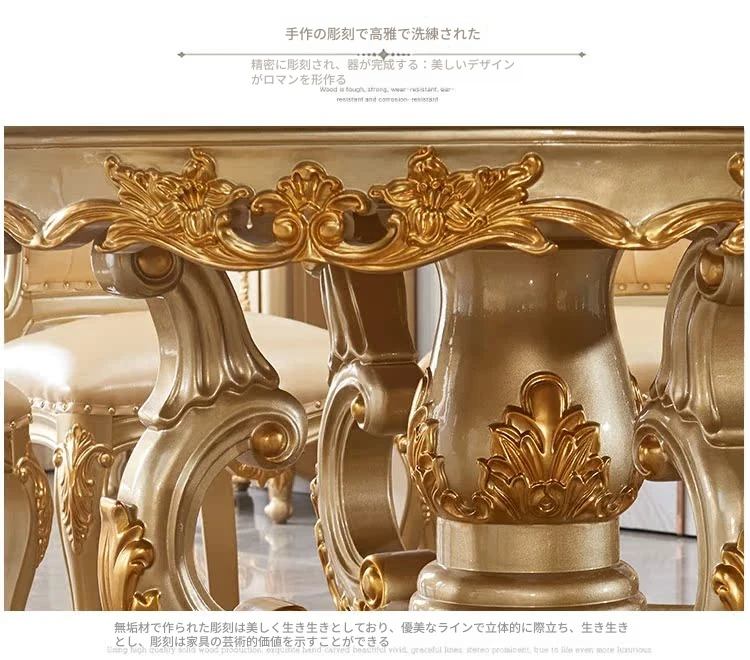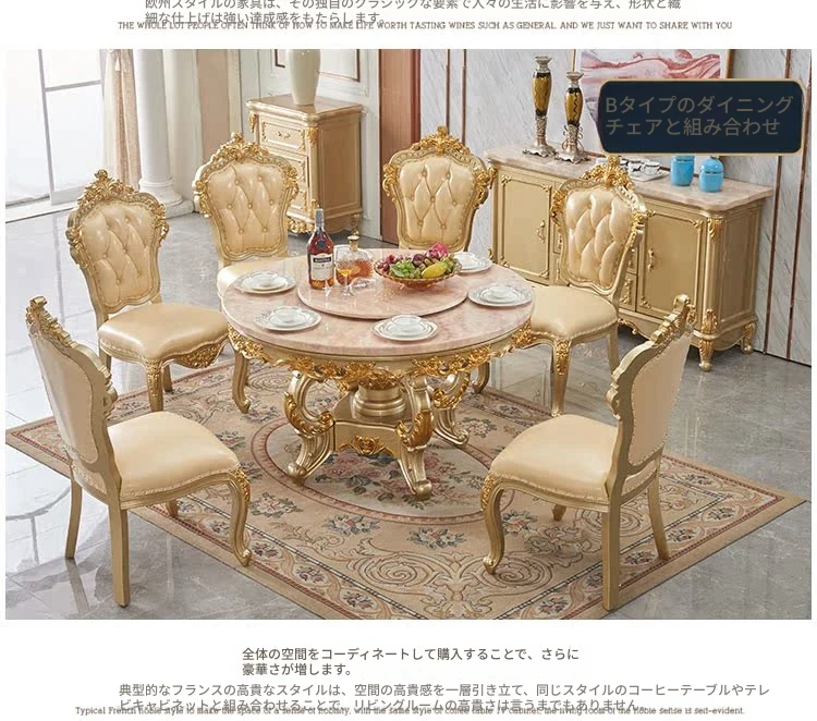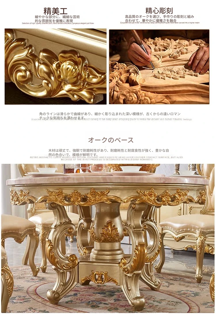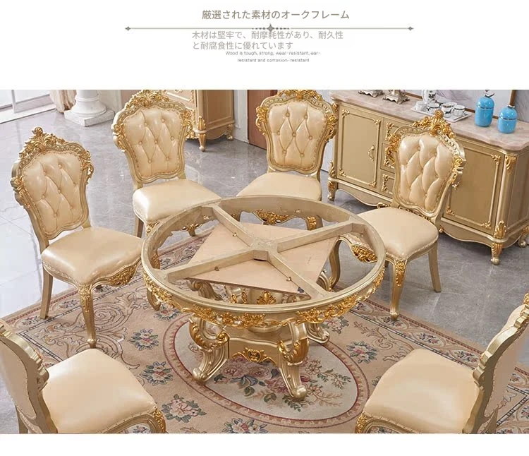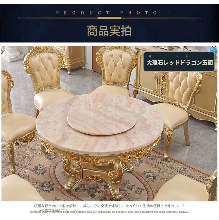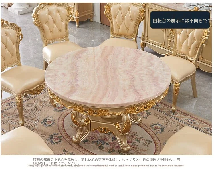 豪華な欧風ダイニングテーブルセット - 彫刻の美しい天然木製テーブル、転回式ラウンドテーブル、豪華な金色仕上げ、大理石の優雅なデザイン、リビングやダイニングに最適!