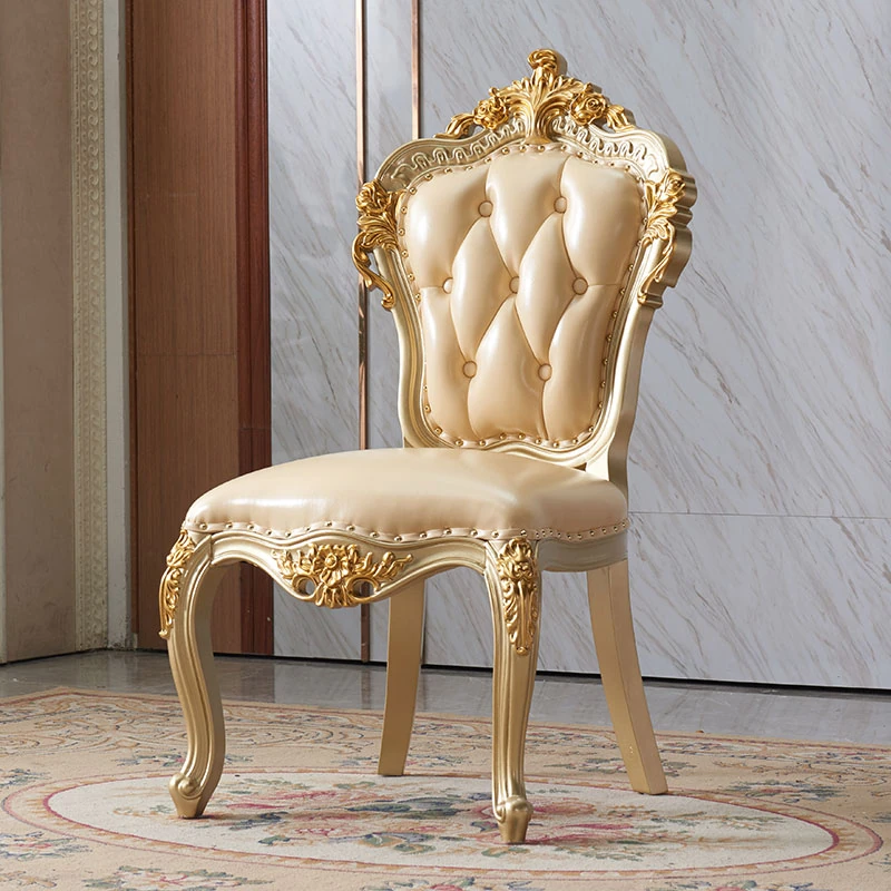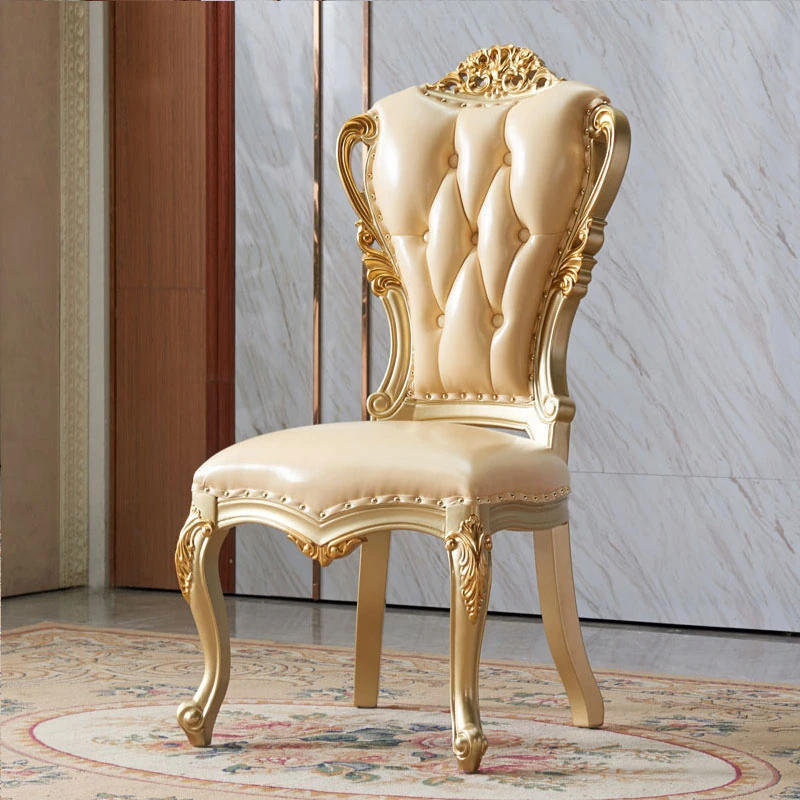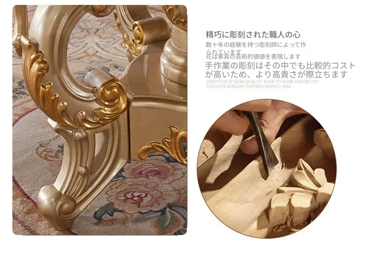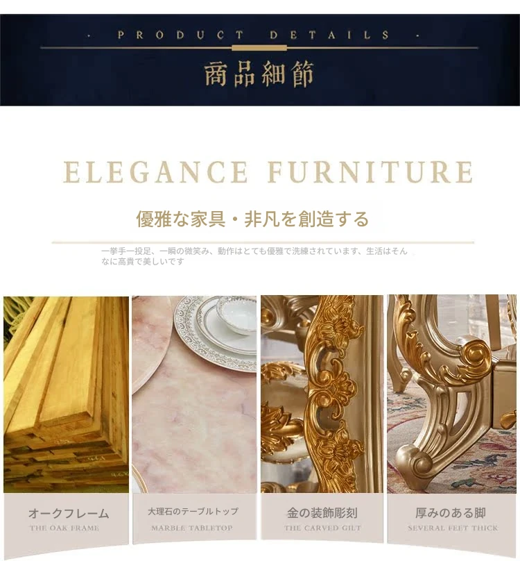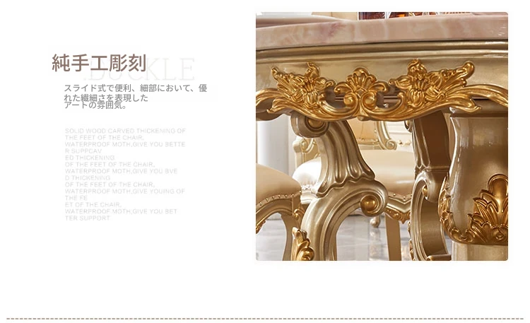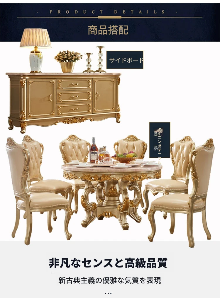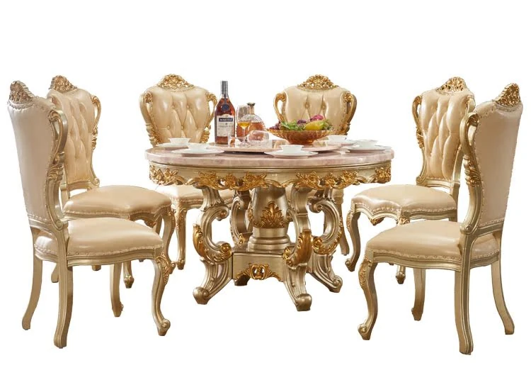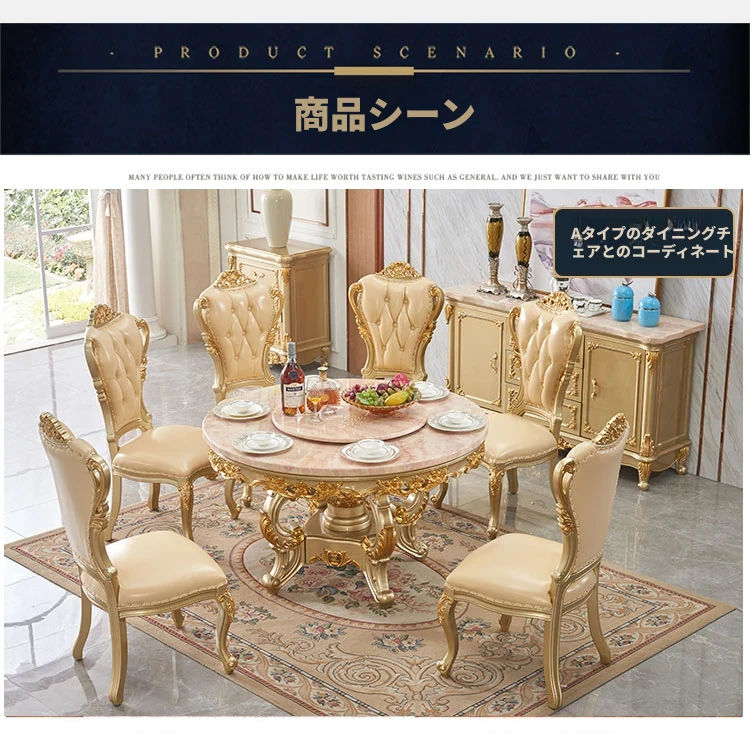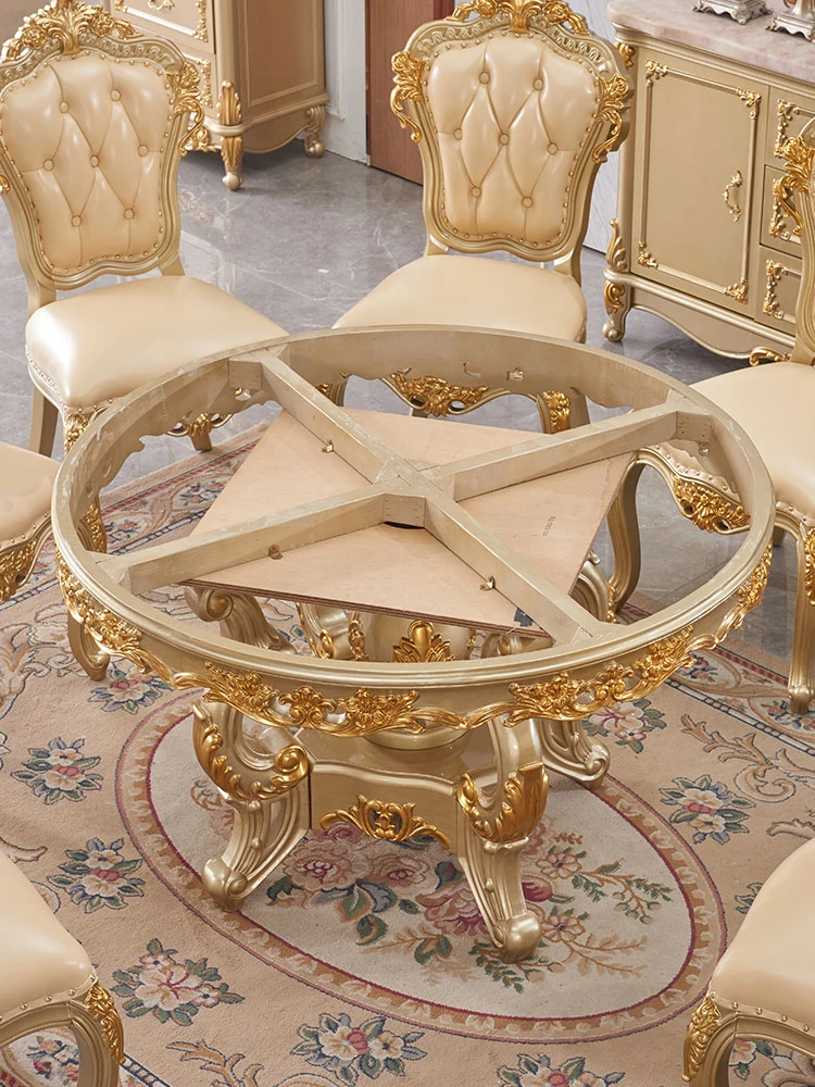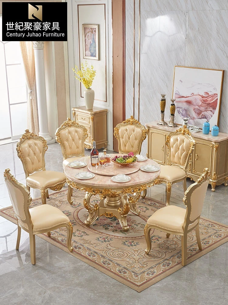 豪華な欧風ダイニングテーブルセット - 彫刻の美しい天然木製テーブル、転回式ラウンドテーブル、豪華な金色仕上げ、大理石の優雅なデザイン、リビングやダイニングに最適!