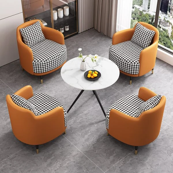 外オレンジレザー内千鳥格子布2+1 2椅子と60雪山ホワイトストーンプレート/81e