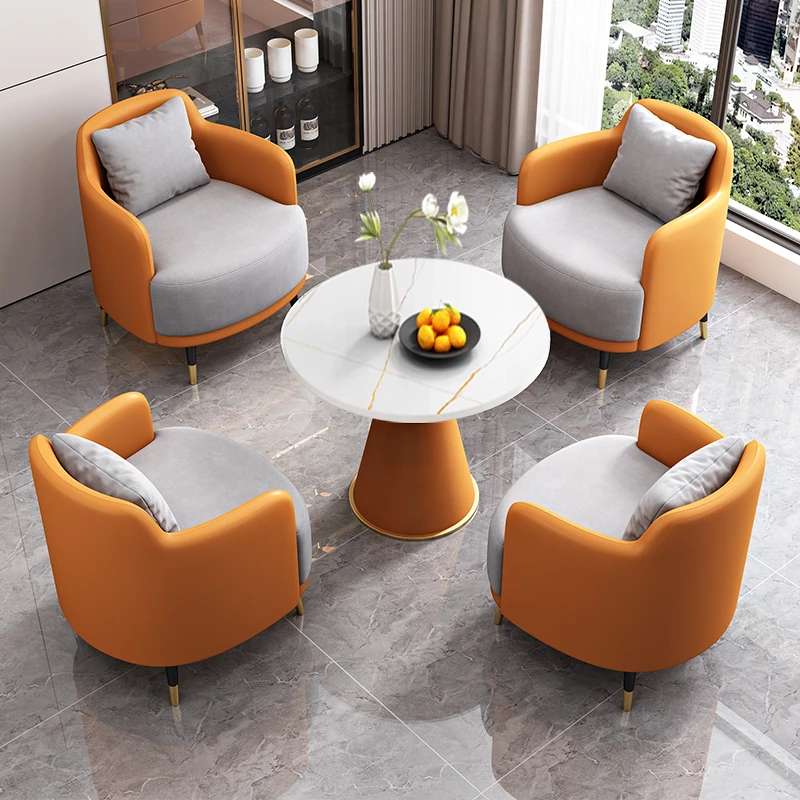 外オレンジレザー内グレー生地4+1 4椅子と60雪山ホワイトストーンプレート/a5a