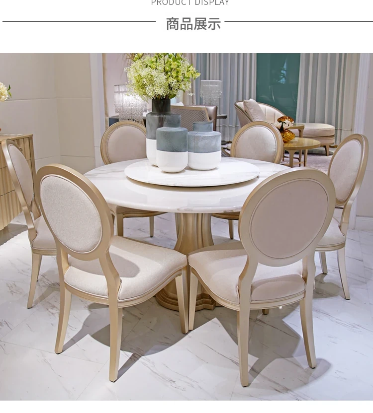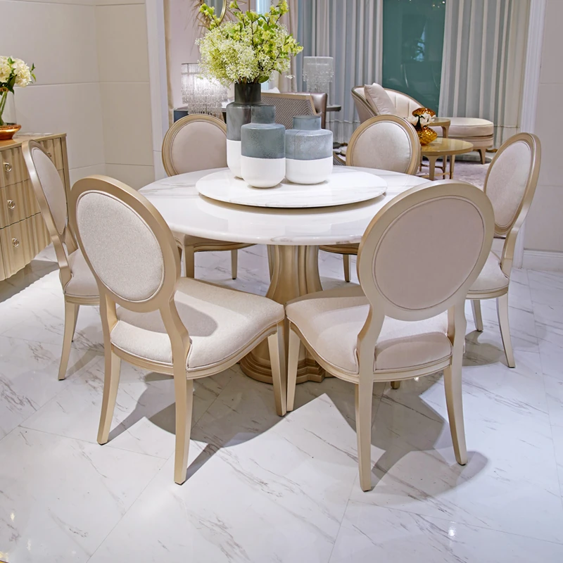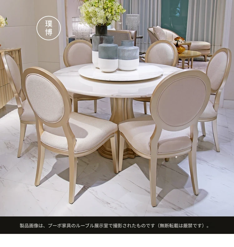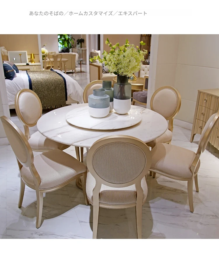 芳華家具の現代アメリカンスタイル、ラグジュアリーな天然大理石の円形ダイニングテーブルと高品質の無垢材ダイニングチェアのセット。洗練されたデザインで、あなたの食卓を特別な空間に変えます!