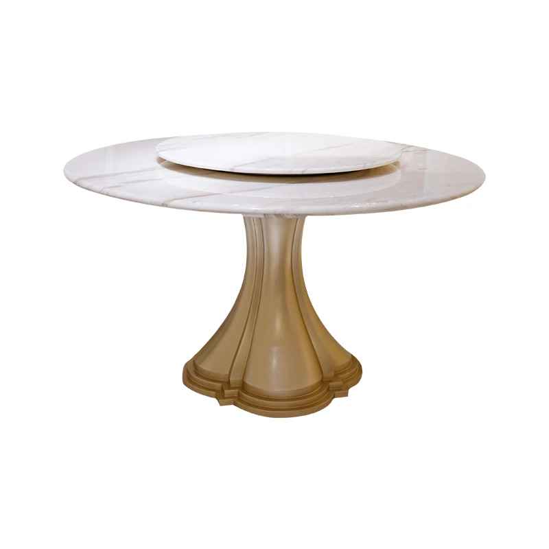 現代的ラグジュアリー天然大理石ダイニングテーブル - 別荘やレストランに最適!電動回転プレート付きの金色ひまわりデザインで、優雅な食事体験を演出します。高級感溢れる一品をお見逃しなく!
