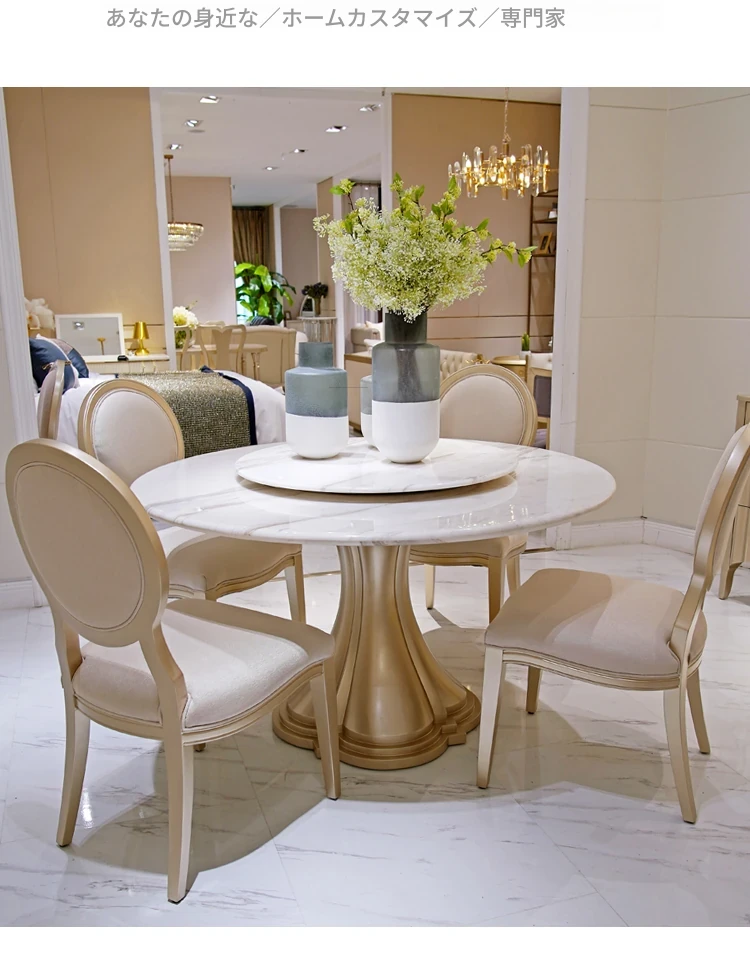 高級感溢れる欧風全木彫刻円形ダイニングテーブル - 1.3メートル大理石仕上げ、アメリカンスタイルの6人用椅子セットで、優雅な食卓を演出します。