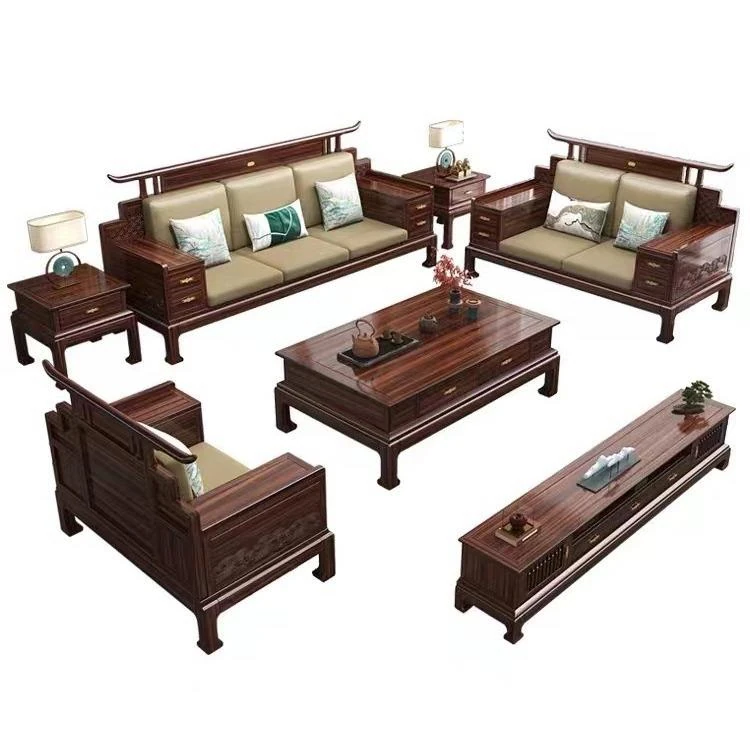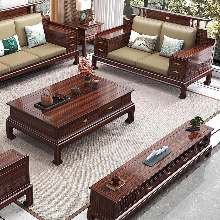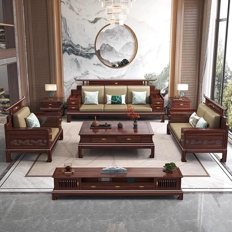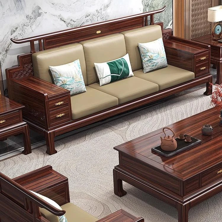 新中式スタイルのウッドソファ - 猫が爪を研いでも安心!全サイズ対応、贅沢なレザーと収納機能付き。快適なリビング空間を演出する、実用性と美しさを兼ね備えたソファです。
