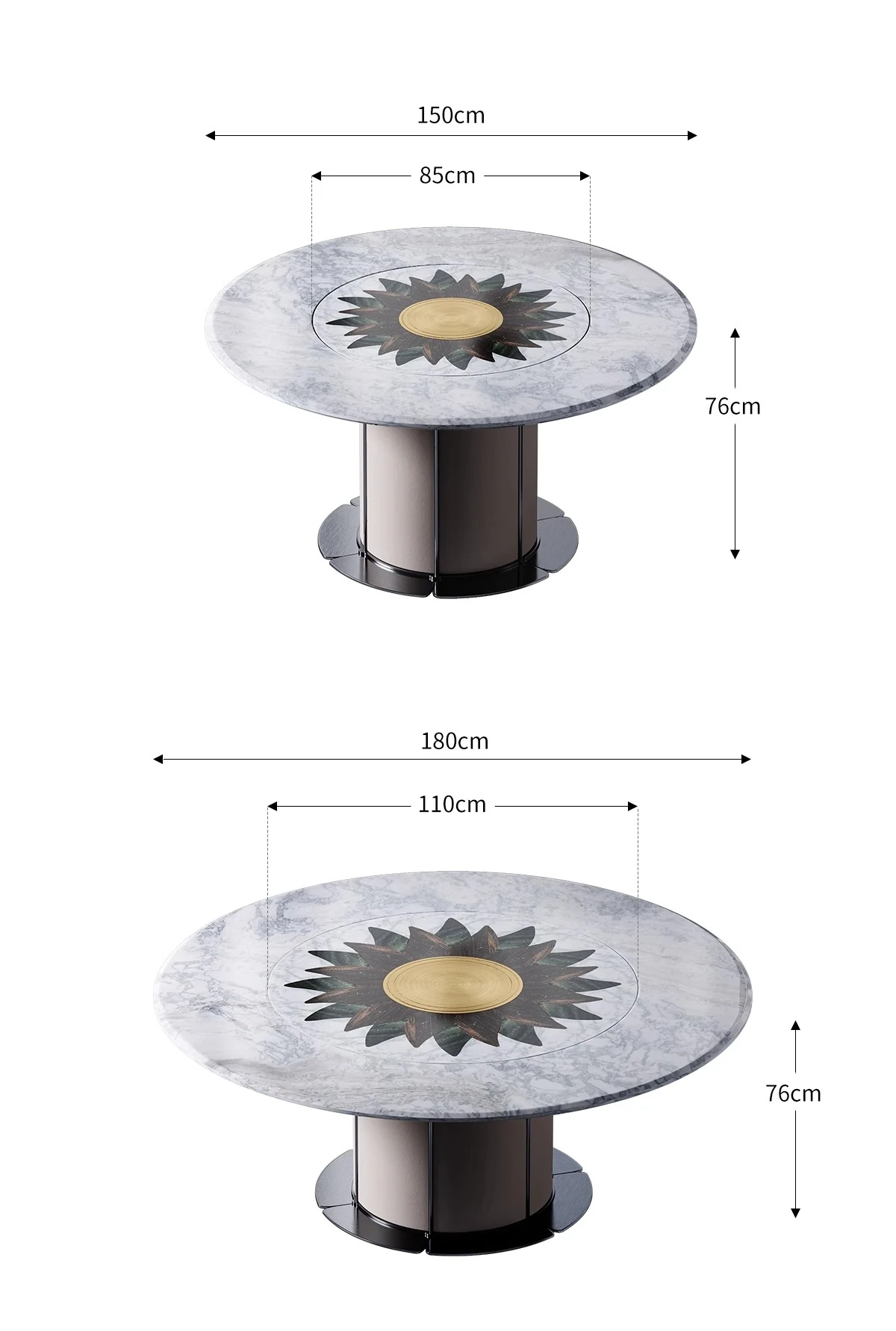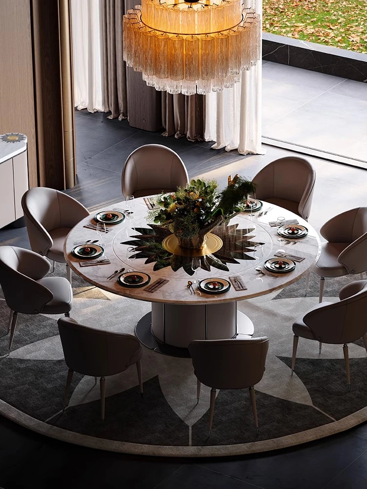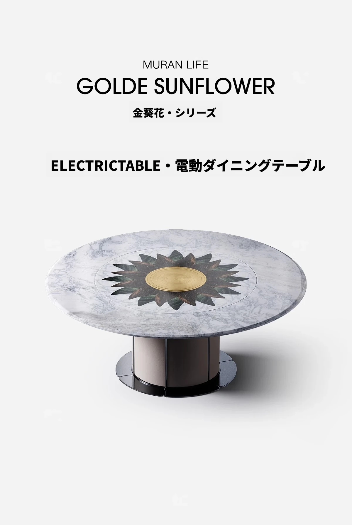 現代的ラグジュアリー天然大理石ダイニングテーブル - 別荘やレストランに最適!電動回転プレート付きの金色ひまわりデザインで、優雅な食事体験を演出します。高級感溢れる一品をお見逃しなく!
