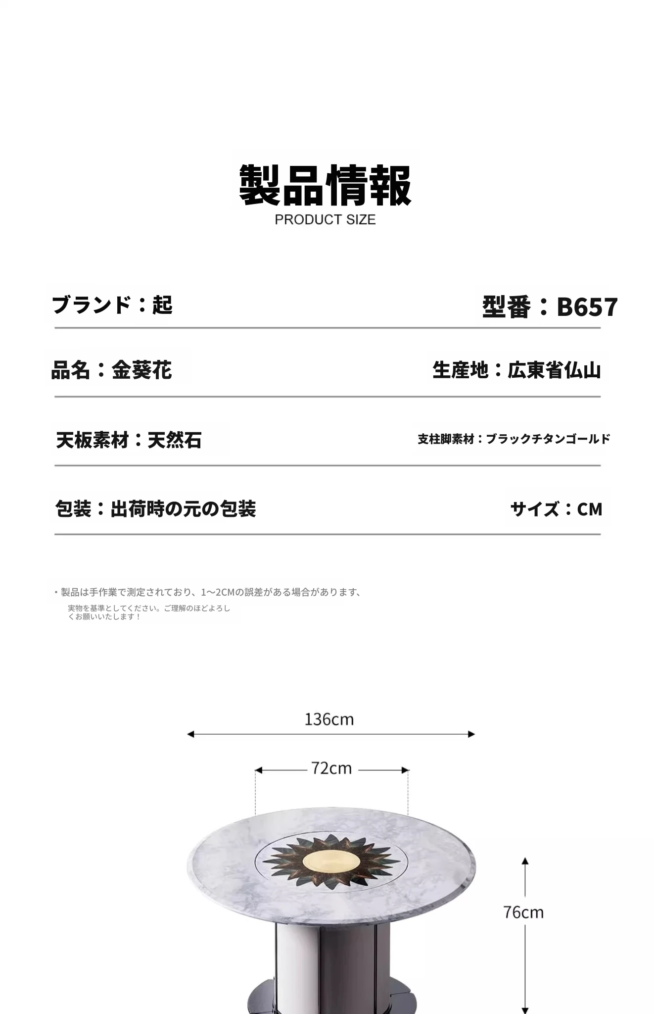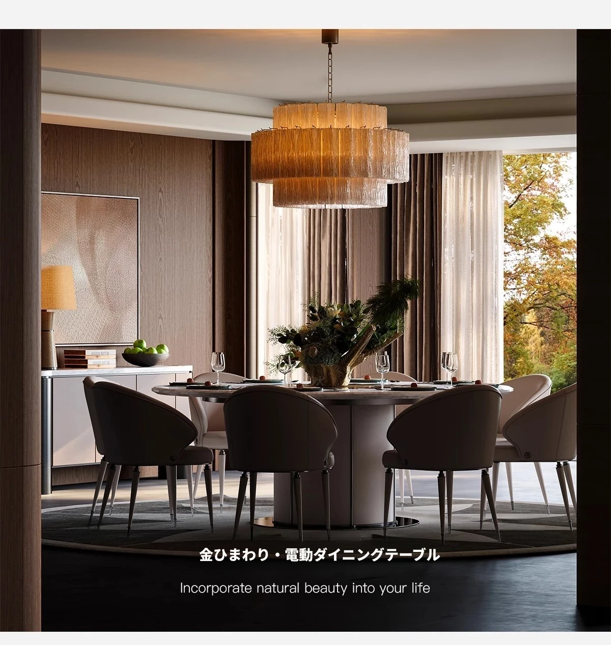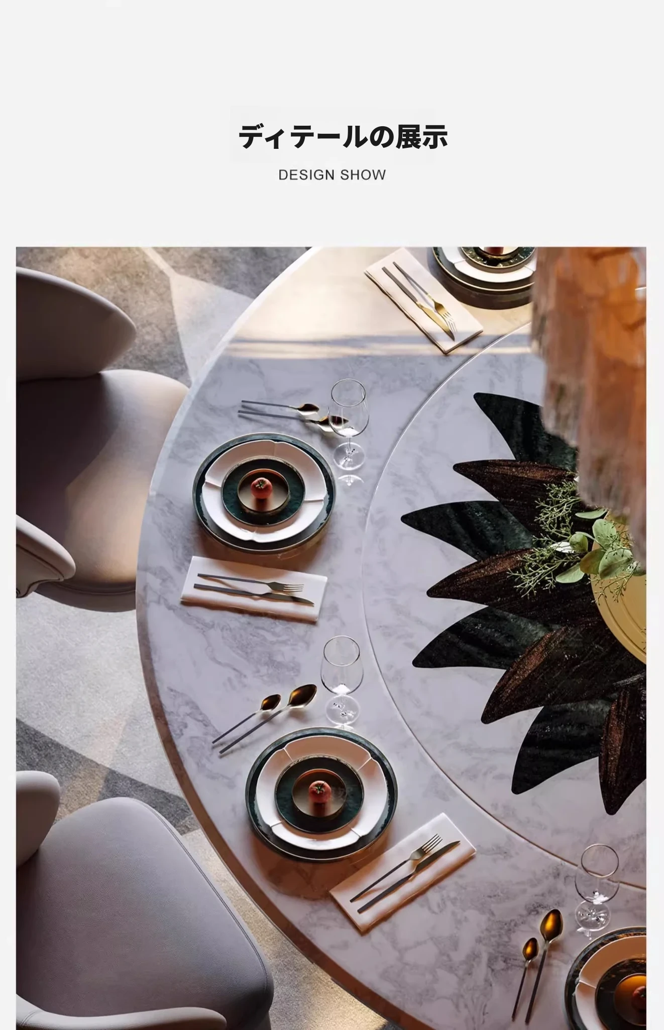 現代的ラグジュアリー天然大理石ダイニングテーブル - 別荘やレストランに最適!電動回転プレート付きの金色ひまわりデザインで、優雅な食事体験を演出します。高級感溢れる一品をお見逃しなく!